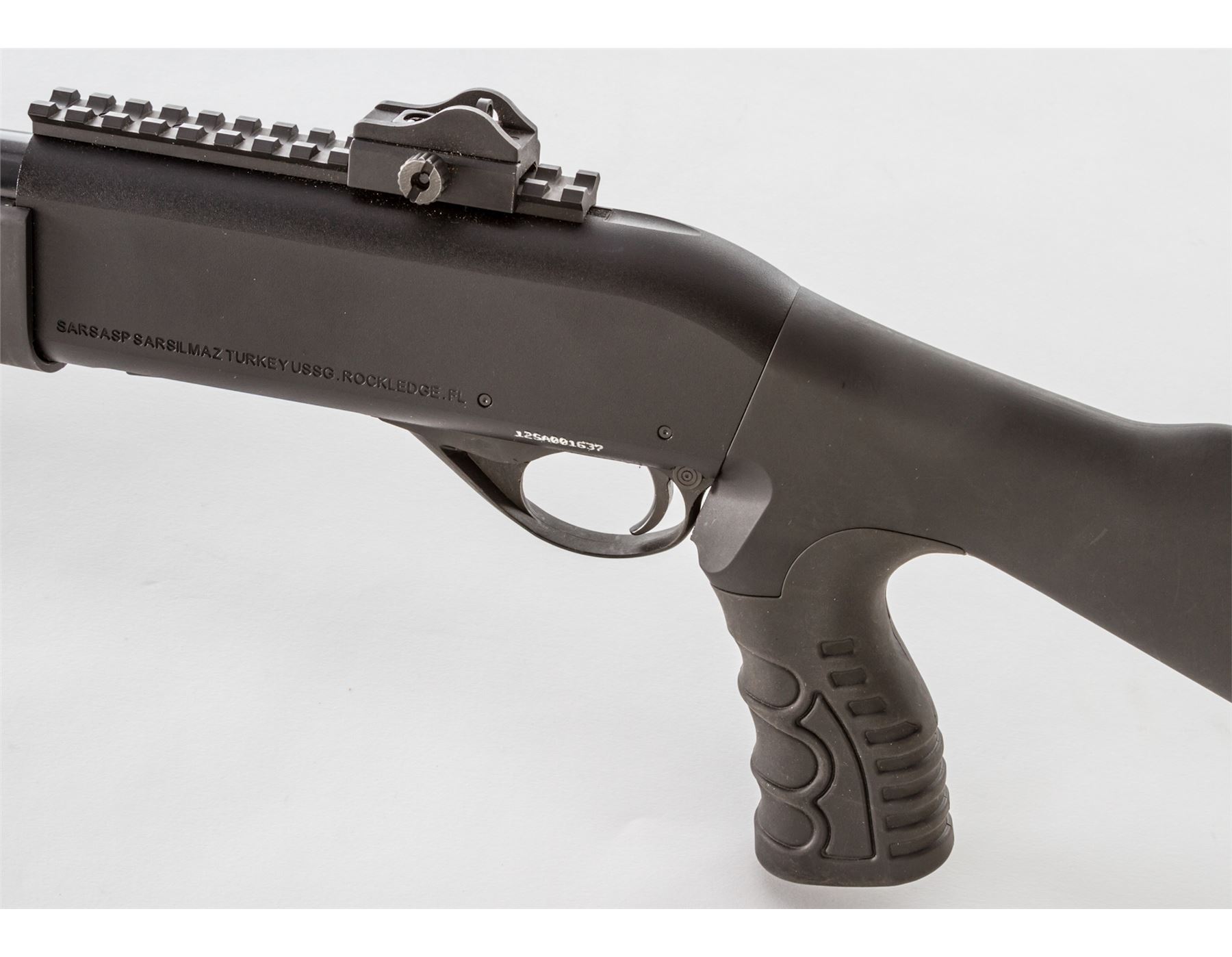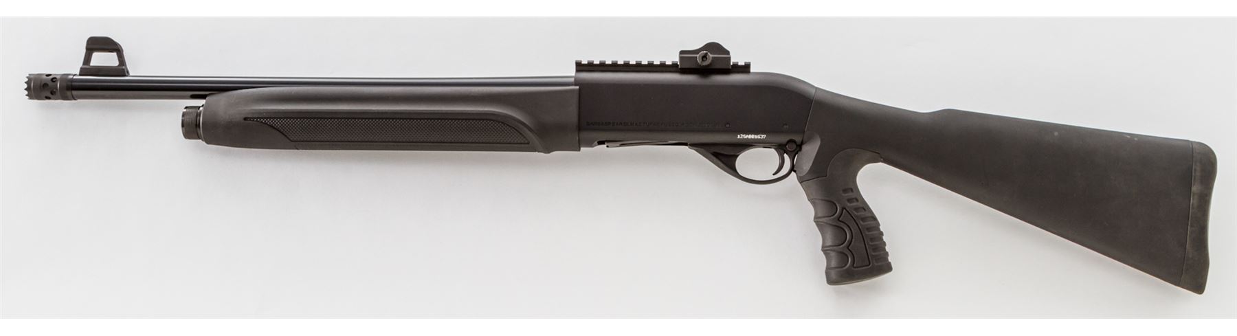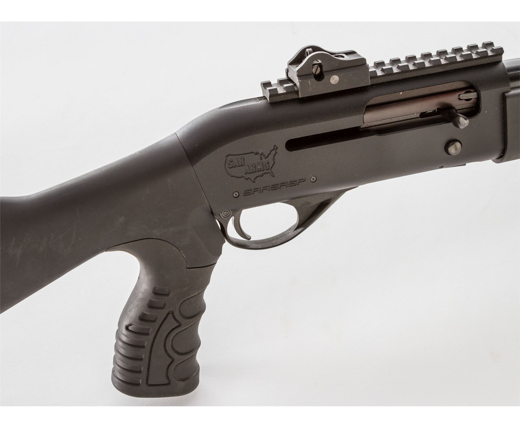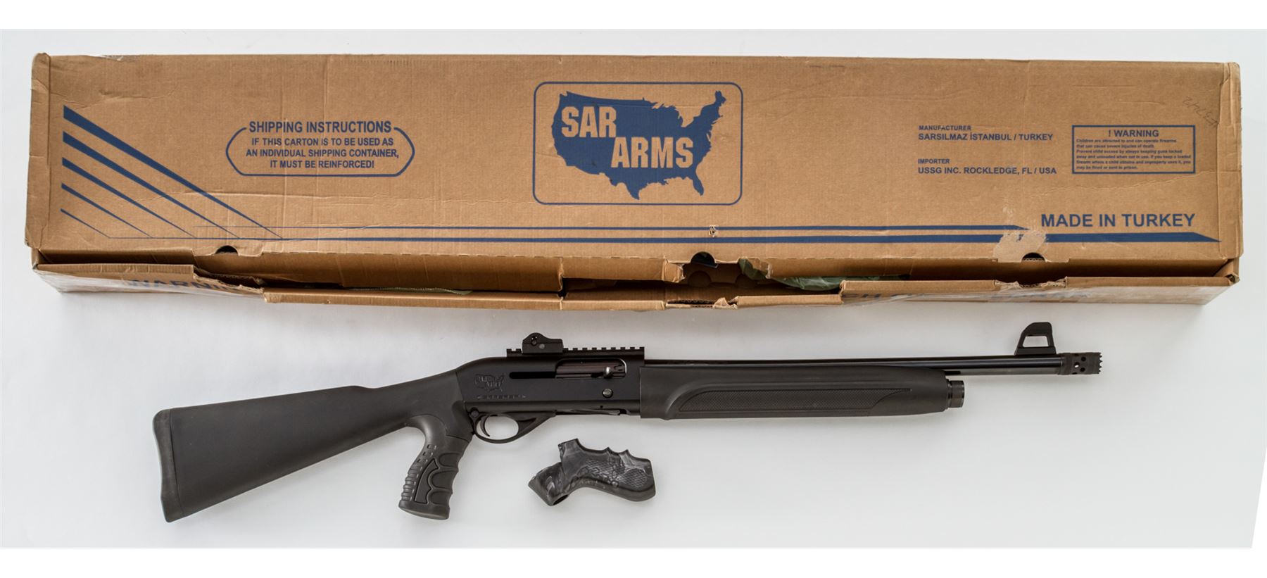 SAR Arms Home Defense Model Semi-Automatic Shotgun, #12SA001637, 12 ga., 18.5'' barrel, matte finish, black plastic pistol-grip stock, with tactical flash suppressor, fiber optic front sight, and extra pistol grip. Condition is excellent, appearing as new, in its original box. Est.: $500-$750. (Modern)