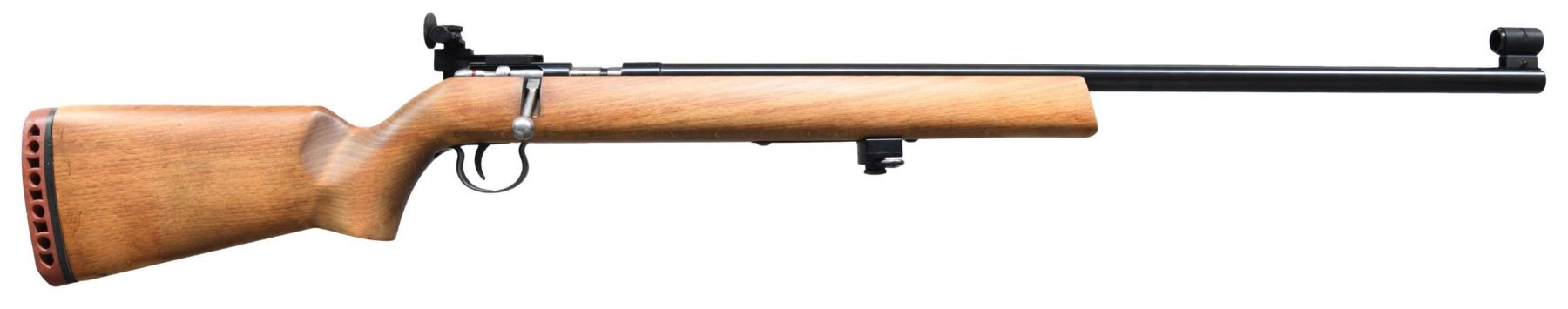 Cal. 22 LR. S# 972754A. Bbl. 26" target having recessed crown. Factory globe front sight clamped to barrel grooves; Lyman 60 rear sight with target disk. Imported from West Germany during joint venture between Savage and Anschutz (1963-1981). Based on Model 64 action as single shot economy target rifle. Natural satin finished hardwood stock with added recoil pad and shorter section of accessory rail with hand stop. Straight comb pistol grip stock without gripping surfaces having slightly raised sculptured cheekpiece. CONDITION: Refinished stock having filled prior holes and amateur fitting of pad that is proud of stock. Open inletting from prior accessory rail. Very good to excellent metal finish. Near excellent bore. (25-3353/NW). MODERN. $250-400.