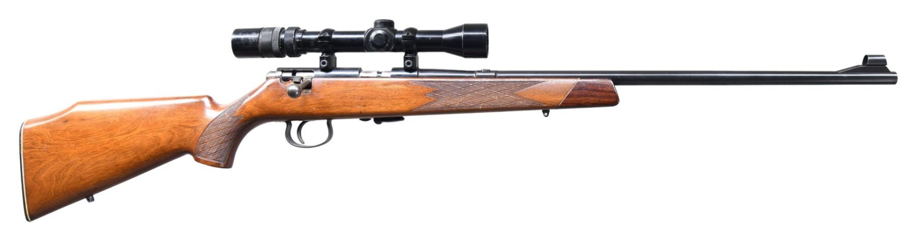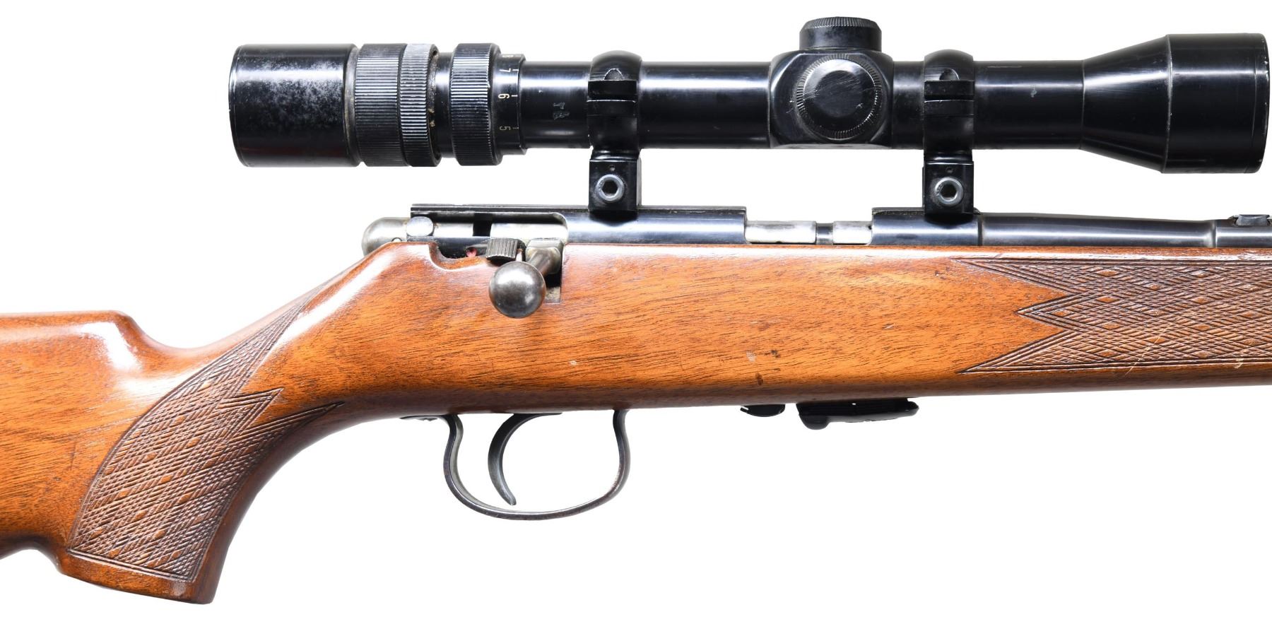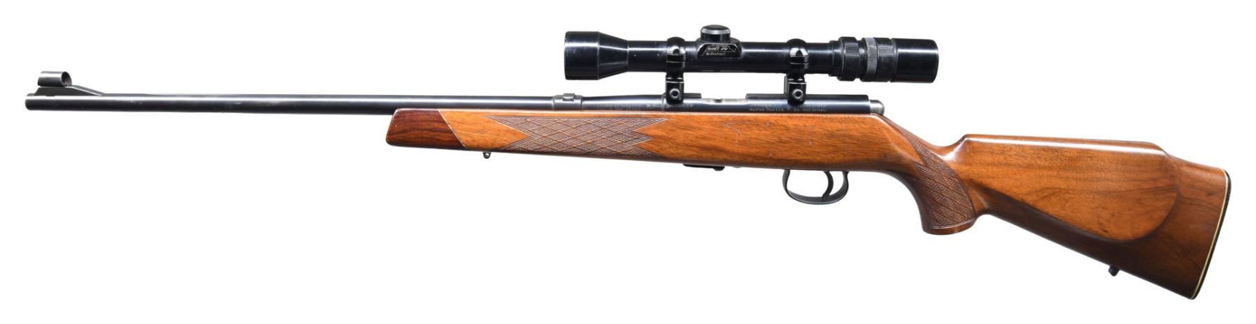 RIFLE. Cal. 22 LR. S# 608938. Mfg. in West Germany by Anshutz with 1966 Ulm proofs; imported by Savage Arms (1963-1981). Bbl. 22". Hooded ramp bead front sight & filler in rear dovetail. Blued finish. Grooved receiver. Tall 1" tip-off rings holding vintage Bushnell Banner 3-9x scope with crosshair reticle. Monte Carlo pistol grip walnut stock with rosewood forearm tip, sling studs, skip-line checkering at wrist & forearm, along with Savage Anschutz buttplate. MAGS: 1 - 5 rd. CONDITION: very good original blued metal finish with scattered light handling marks & couple spots of light finish loss. Very good original wood finish with numerous light handling marks throughout. Very good bore with strong rifling. Scope has good finish; optics show cloudiness & needs cleaning. (25-2037/MD). CURIO. $300-500.
