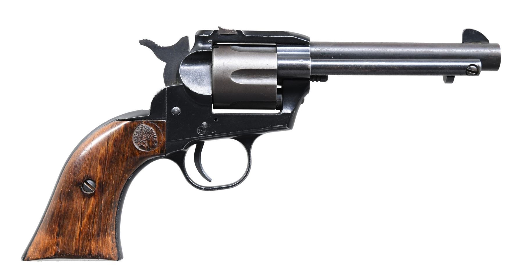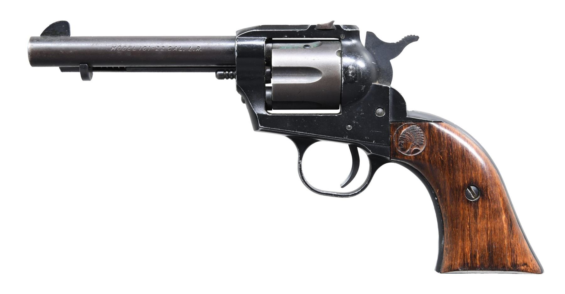 Cal. 22 LR. S# 39445. Bbl. 4 1/4". Model 101 single shot revolver mfg. by Savage. Left side of the bbl. is marked with the model and cal. designations, with Savage's mfg. information marked across the top. Aluminum frame and trigger guard exhibit a black enamel type finish, with steel parts exhibiting a blue finish. Frame is mounted with 2-piece Savage logo smooth wood grips. Fixed blade front sight, with dovetailed square notch rear sight. CONDITION: aluminum parts retain the majority of their original finish, exhibiting edge wear and superficial handling marks overall. Steel parts retain large amounts of their original factory finish, exhibiting wear and scattered spots of light to mild surface oxidation. Mirror bore, retaining well defined rifling throughout. Grips show scattered superficial marks from handling and storage, but otherwise remain sturdy and serviceable. (25-2543/MLW). MODERN. $150-250.