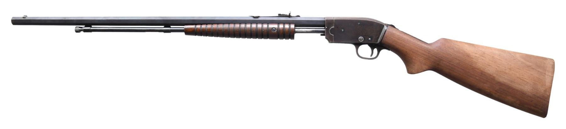Cal. 22 S, L, LR. S# 34226. Bbl. 24". Model 1914 slide action rifle mfg. by Savage Arms Corp. The top flat of the octagonal bbl. is marked with Savage's mfg. and patent information, with the model and cal. designations marked towards the breech. Metal components exhibit a blue finish overall, save for on the bolt, which is polished in-the-white. Plain wood pistol grip buttstock, with grooved wood pump. Buttstock has been sanded at one time. Buttplate is absent. Dovetailed blade front sight, with dovetailed U-notch rear sight. CONDITION: metal components retain large amounts of what appears to be their original factory blue finish, exhibiting areas of wear and thinning that show through to gray and brown patinas, with scattered areas of light surface oxidation present overall. Bright bore, exhibiting scattered areas of dark pitting, while retaining good rifling throughout. Wood furniture shows shows scattered marks and minor impressions from handling and storage, with the buttstock exhibiting a small chip at the toe. (25-2034/MLW). CURIO. $75-150.