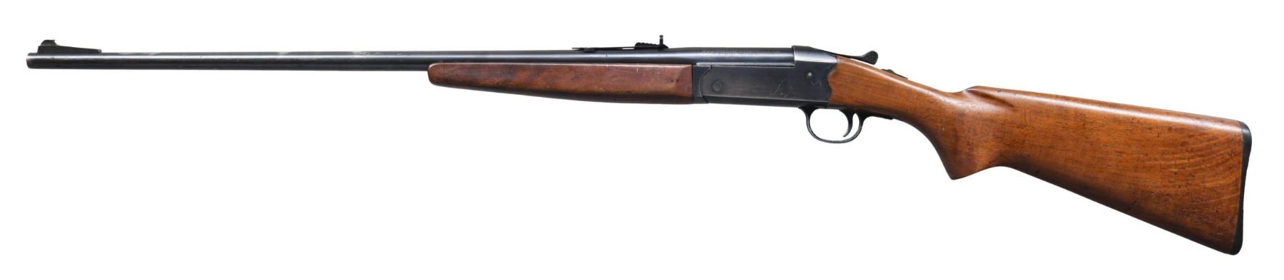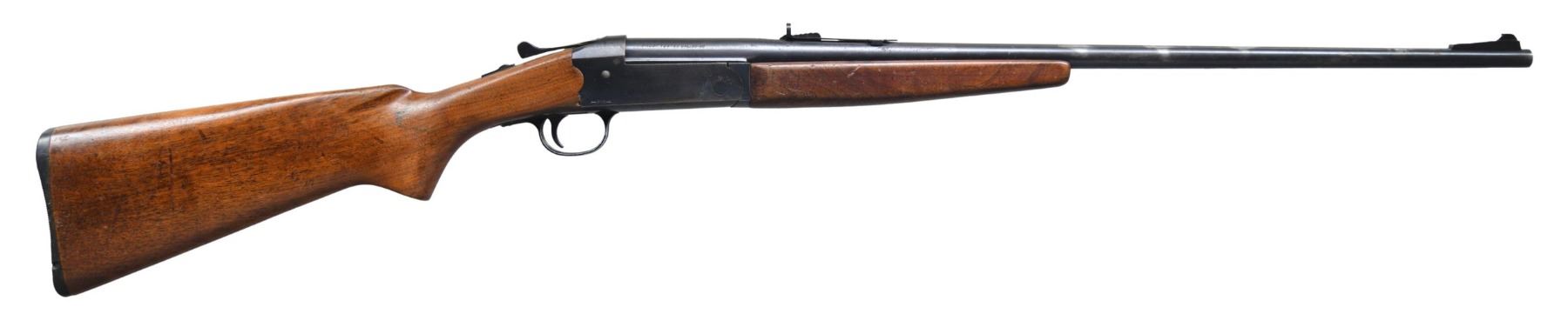 Cal. 30-30. S# MN28. Bbl. matching numbered 26" with screw attached ramped base front sight with integral brass bead; elevator adjustable semi-buckhorn rear sight. Mfg. 1938-1965 as economy single shot stalking rifle; also offered in 22 Hornet, 25-20 and 32-20. Hammerless break action with shotgun style top lever opening, top tang thumb safety and black painted alloy triggerguard. Plain walnut stock set with snap on forend and pistol gripped buttstock having serrated hard rubber buttplate. CONDITION: good general appearance with thinning of metal finish and high point wear to include 4 oval bright spots of finish loss on top of barrel forward of forend. Forend has handling marks on its original finish. Buttstock has Tru-Oil finish plus repairs in tang area that have been epoxy joined along with brown epoxy filled areas because of corner chips; fully serviceable and durable. Very good to excellent bright bore. (25-949/NW). CURIO. $150-250.