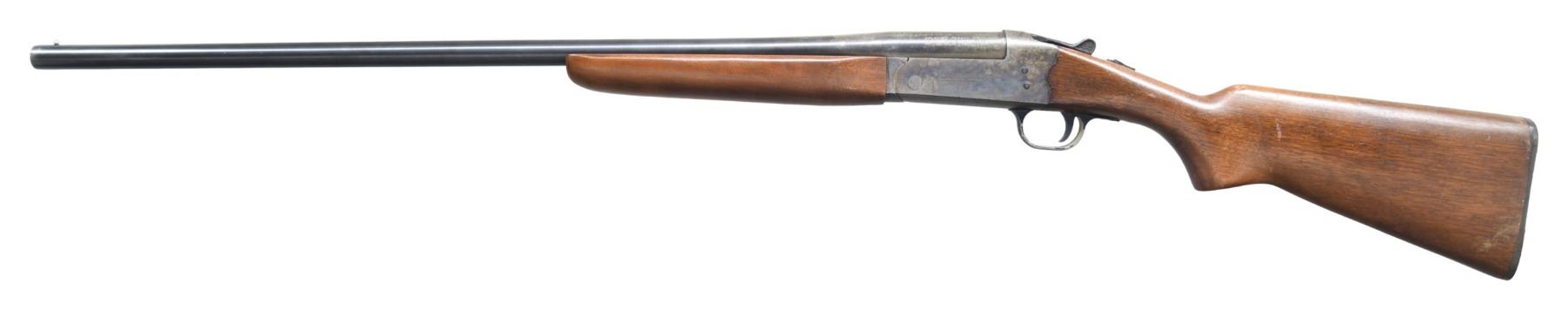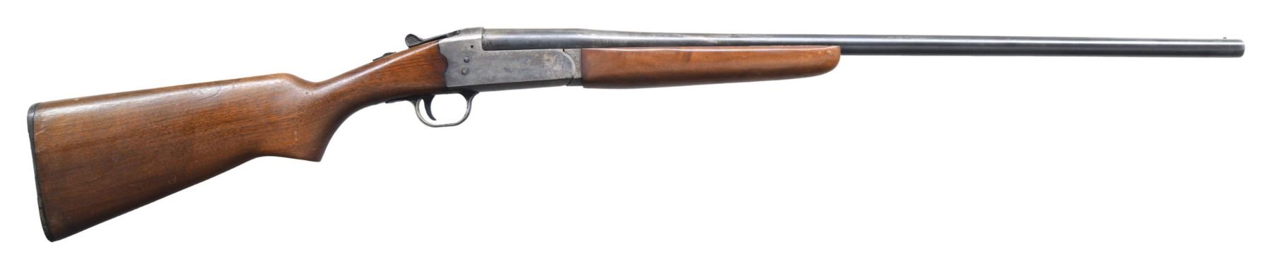 Cal. 20 GA, 2 3/4". NSN. Bbl. 28". Model 220B single shot break action shotgun mfg. by Savage. Left side of the bbl. is marked with the cal. designation, with the model designation and Savage's mfg. information marked on the left side of the receiver. Receiver exhibits a case color hardened finish, with the bbl. and lever exhibiting a blue finish. Aluminum trigger guard and safety switch exhibit a black enamel type finish. Plain wood pistol grip buttstock, with plain wood forend. Aluminum bead front sight. CONDITION: receiver retains fair to good amounts of its original factory case color hardened finish, exhibiting areas of wear and thinning that show through to gray patina, as well as scattered spots of mild surface oxidation overall. Bbl. retains the majority of its original factory blue finish, exhibiting areas of wear and thinning towards the breech that show through to gray and brown patinas, with moderate pitting present on the sides of the ejector. Aluminum trigger guard and safety switch exhibit areas of flaking overall. Mirror bore. Wood furniture shows scattered marks and impressions from handling and storage, but otherwise remains sturdy and serviceable. (25-2519/MLW). CURIO. $100-150.