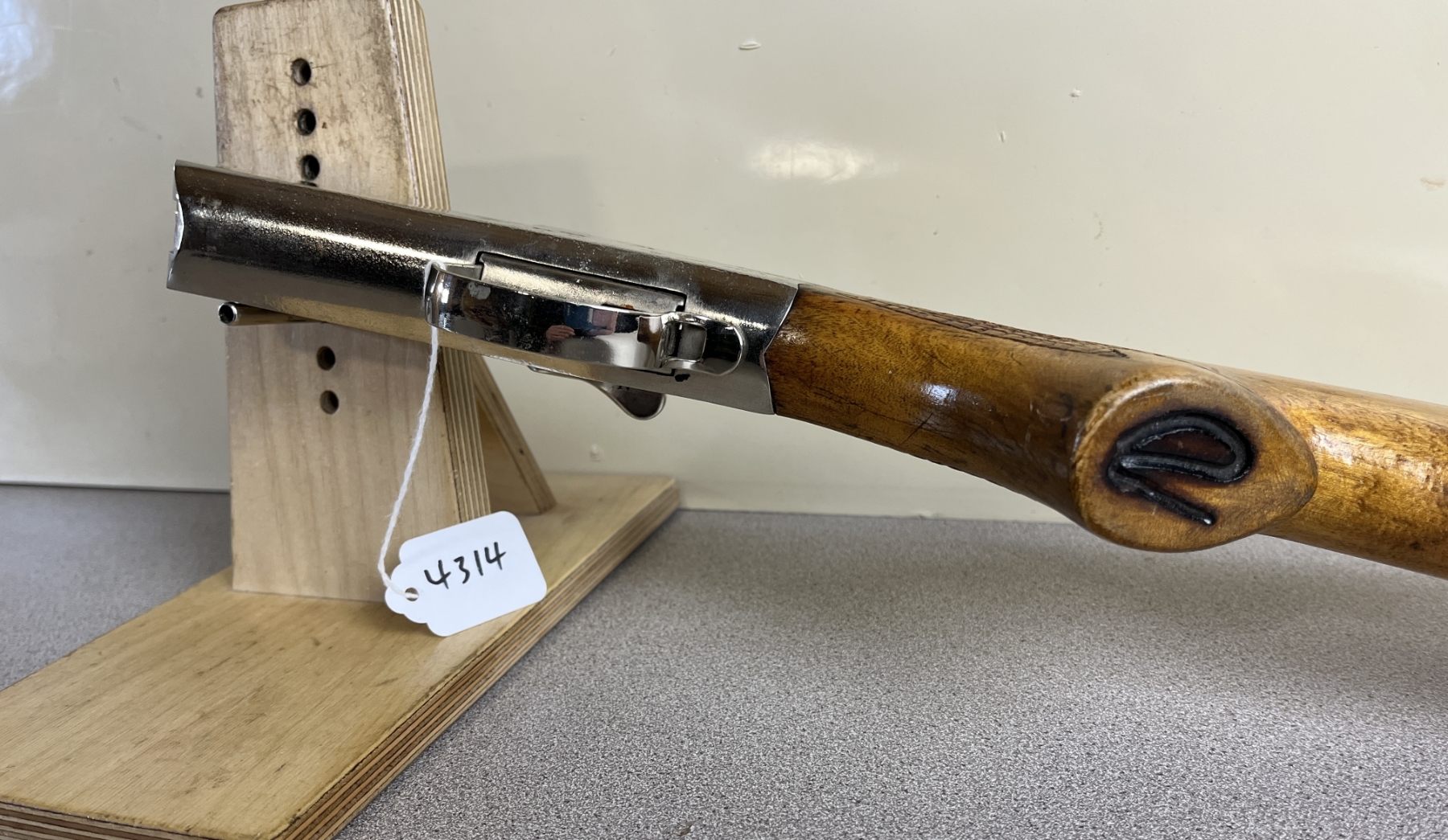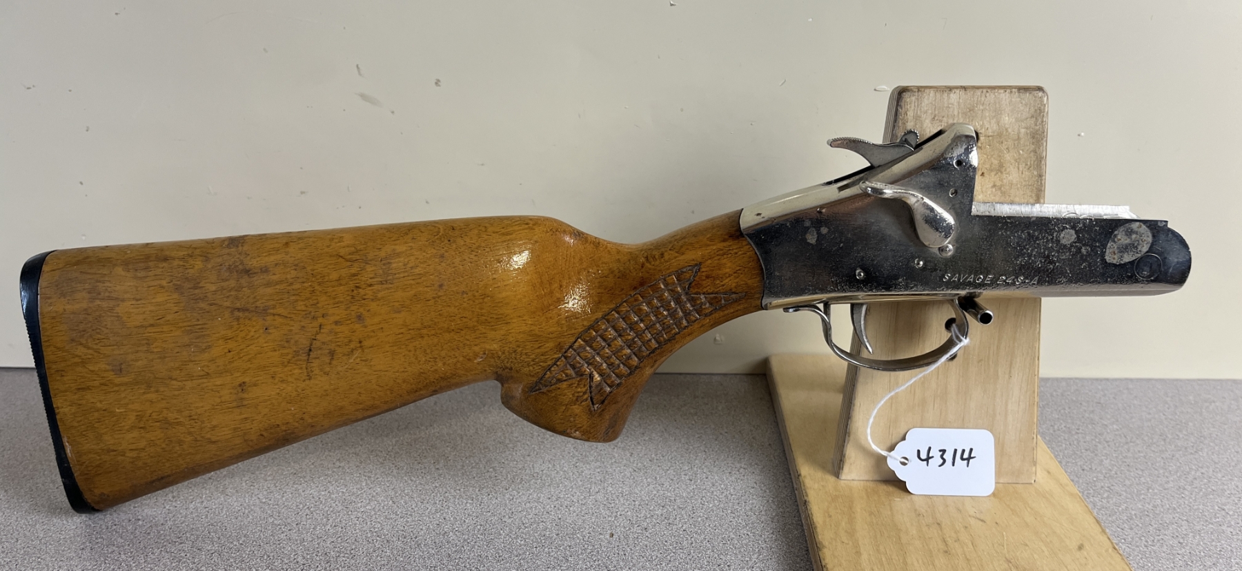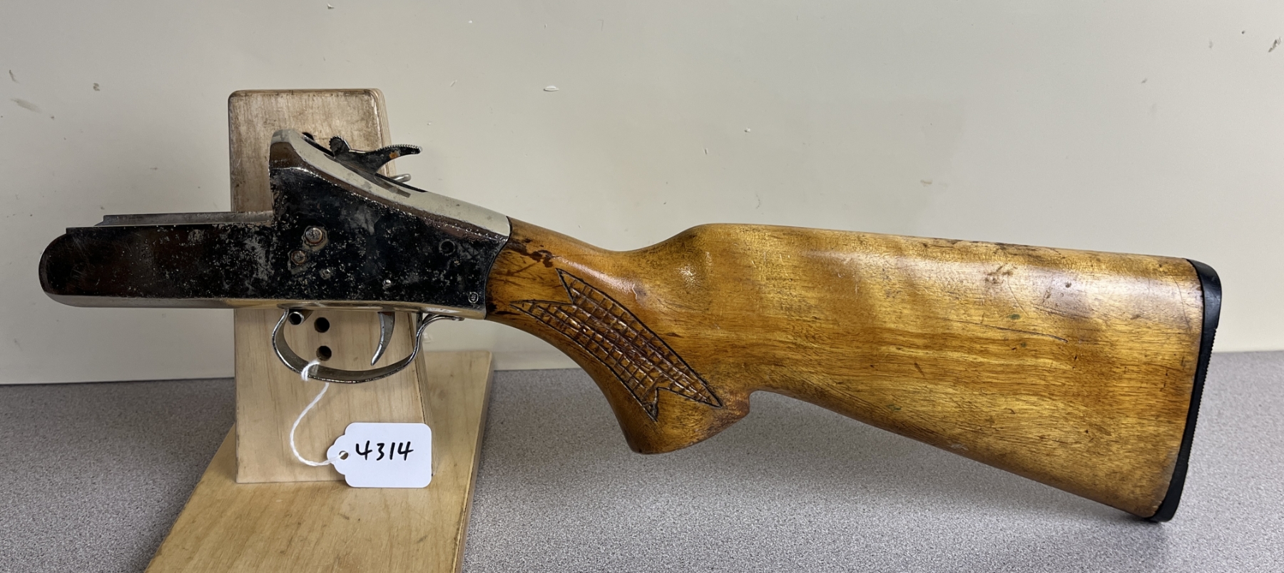 CONDITION: PARTS GUN. NOTE: MISSING BBLS AND SLING STUD, APPEARS COMPLETE OTHERWISE. STOCK SHOWS LETTER E BURNT INTO GRIP HEEL. SPECS: NICKEL PLATED RECEIVER. EXTRAS: NONE. S/N: NONE