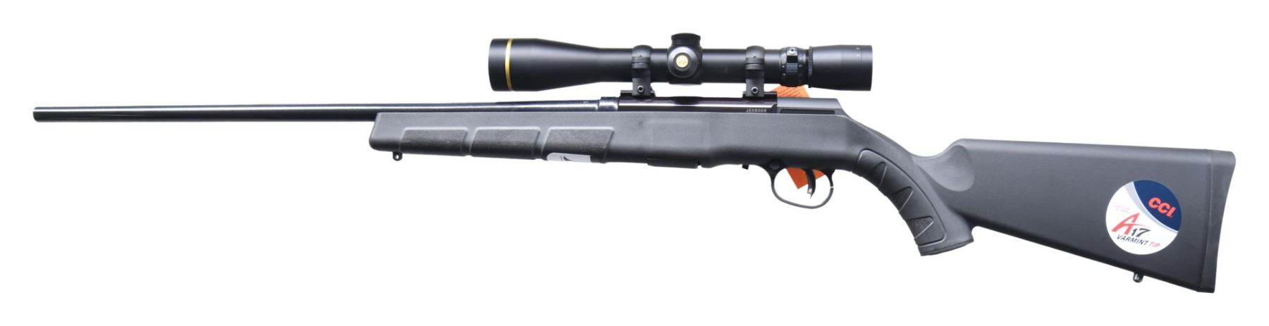 Cal. 17 HMR. S# J826306. Bbl. 22". Rifle is sighted with a Leupold VX-III 4.5-14x40 scope. Scope has duplex crosshair reticle with very good optics. Blued finish. Black synthetic pistol grip stock with bottom mounted sling studs & factory stickers. MAGS: 1-10 rd. UNATTACHED ACCESSORIES: Leupold scope cover. CONDITION: stock shows some light handling wear. Metal retains nearly all of its original blue. Mag does not always stay seated & may require attention to fix. Action otherwise functions properly when hand cycled. Bright near excellent bore. (25-2493/MJC). MODERN. $300-500.