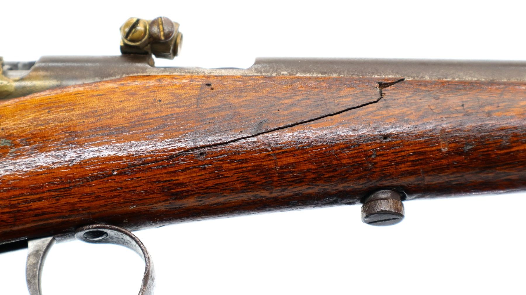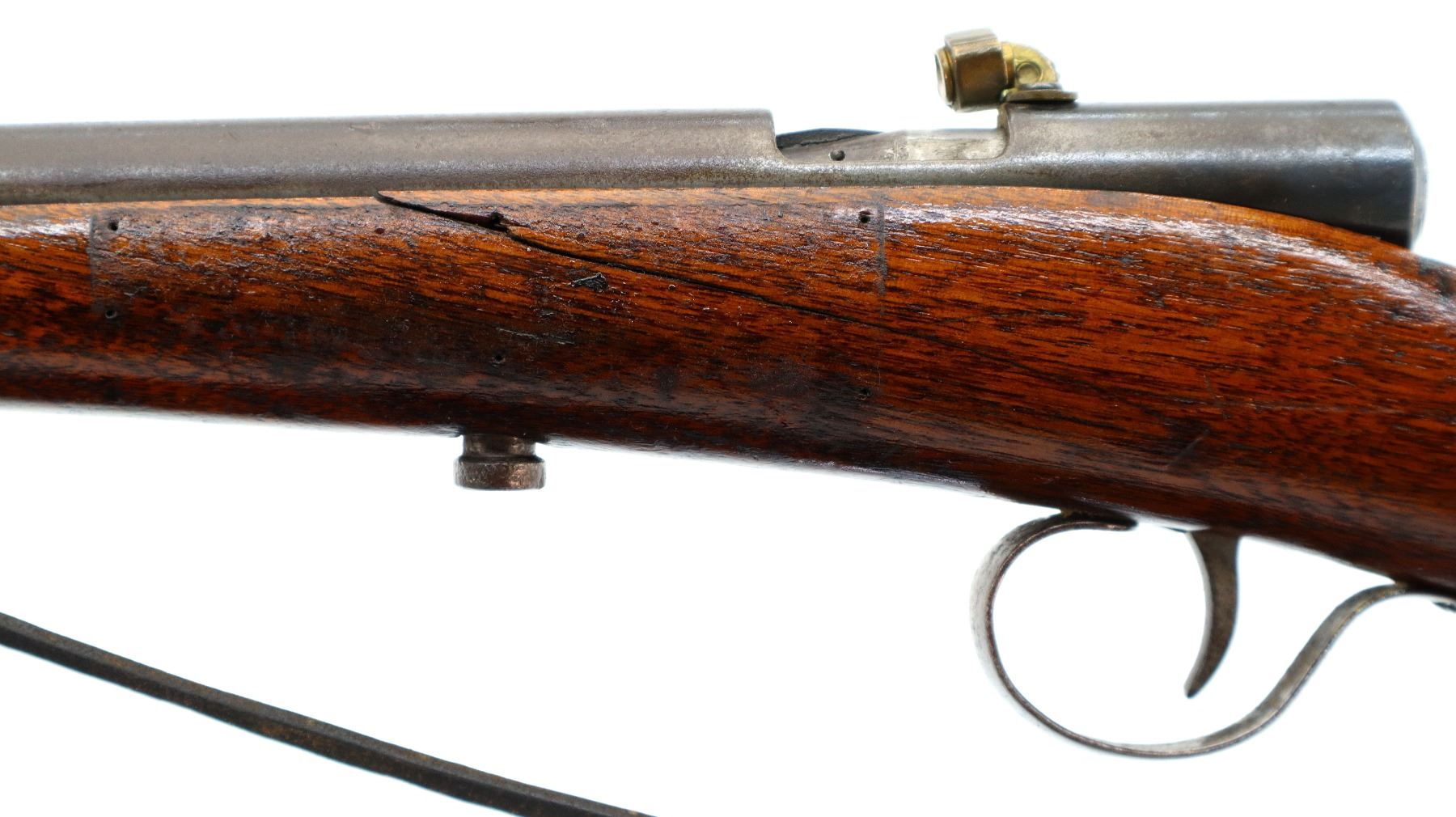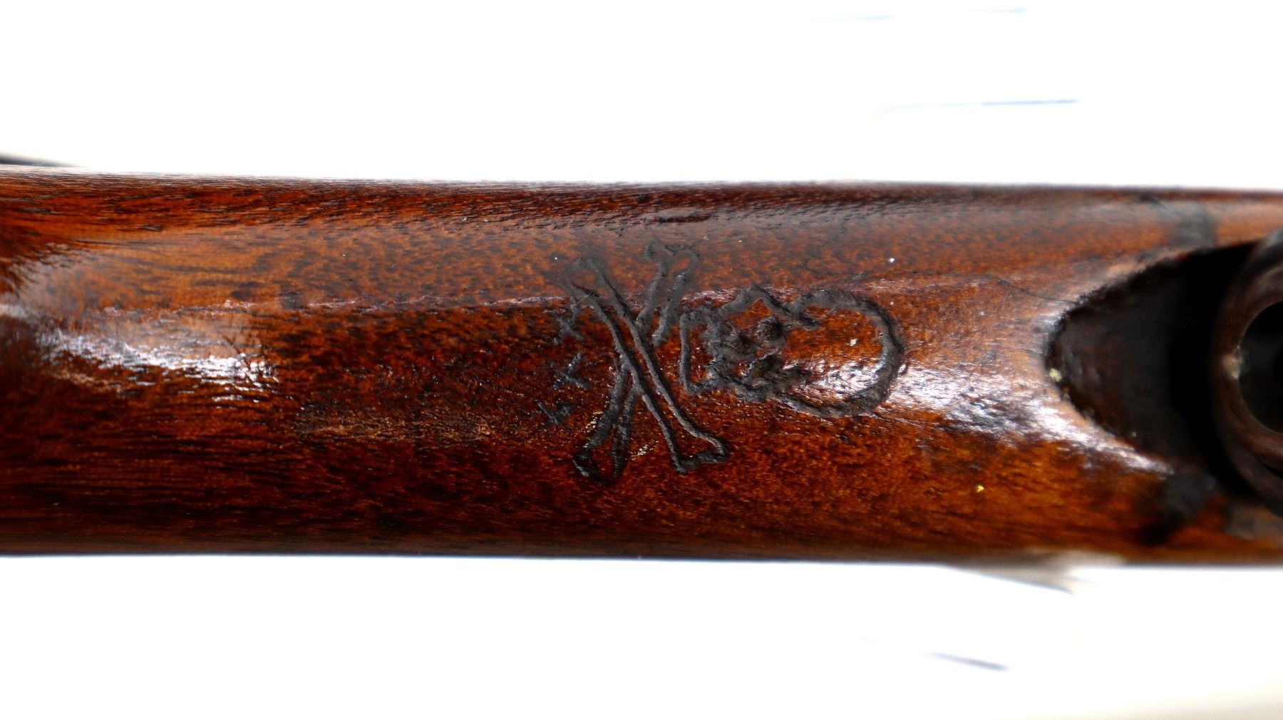 Main Description: Blade front sight, custom rear peep sight, tapered round barrel, bolt body is present with extractor, missing handle and other parts. One piece wood stock, forearm is cracked, straight grip with Skull and Crossbones logo, smooth steel butt plate, letter L etched into left side of stock, swivel studs with leather strap.