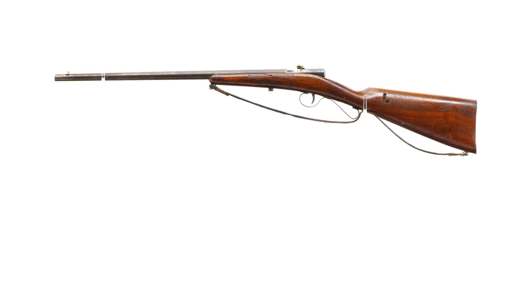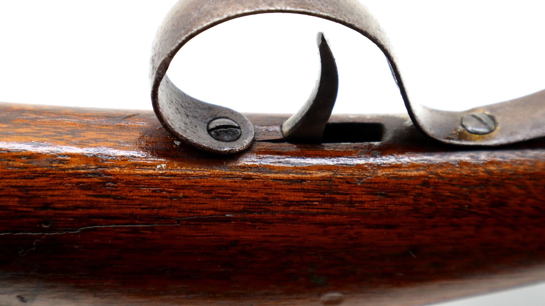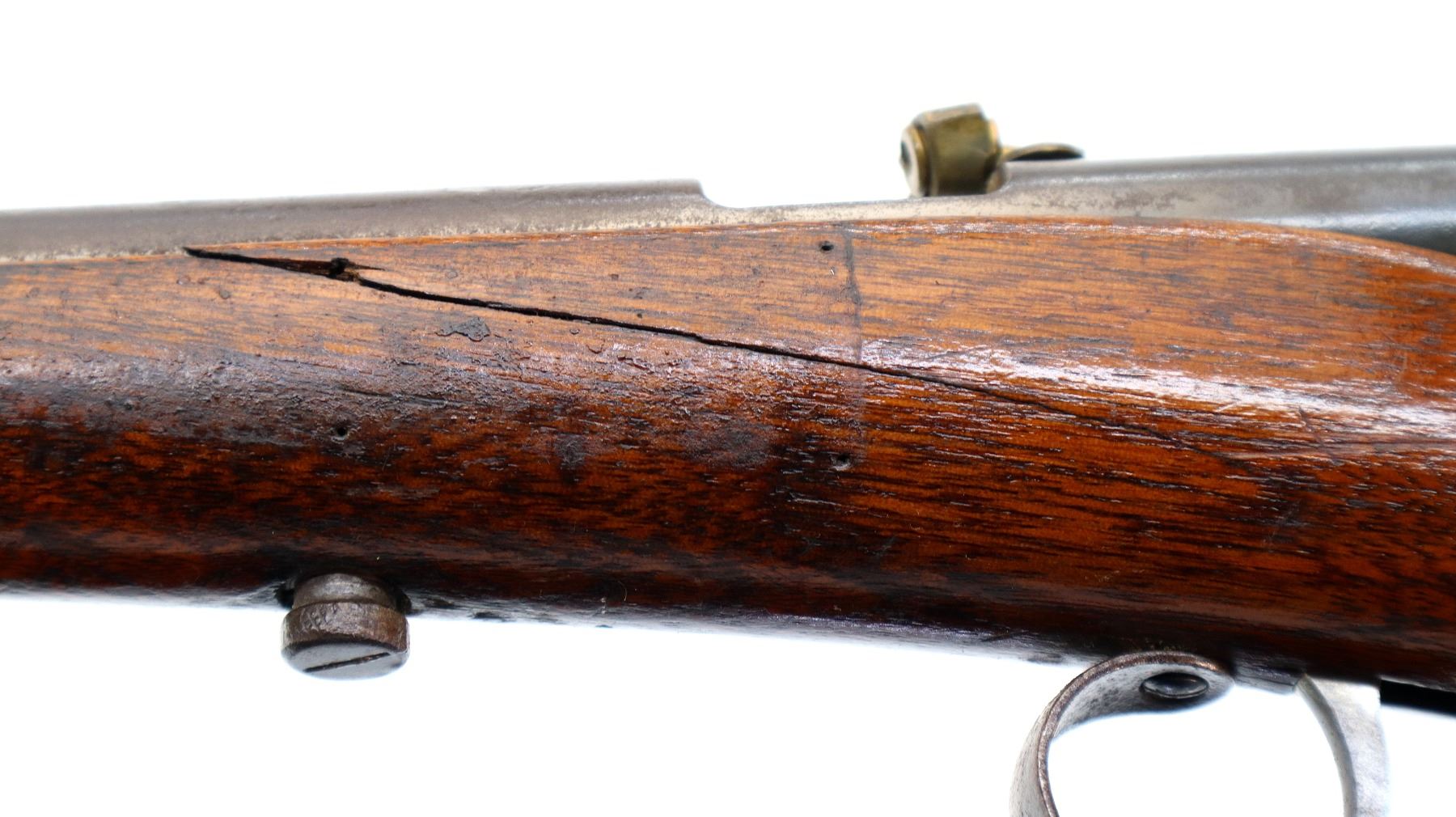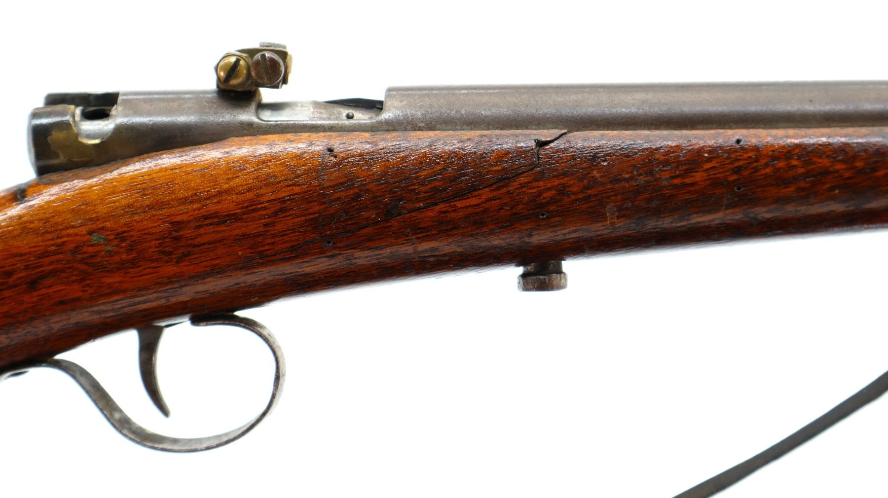 Main Description: Blade front sight, custom rear peep sight, tapered round barrel, bolt body is present with extractor, missing handle and other parts. One piece wood stock, forearm is cracked, straight grip with Skull and Crossbones logo, smooth steel butt plate, letter L etched into left side of stock, swivel studs with leather strap.