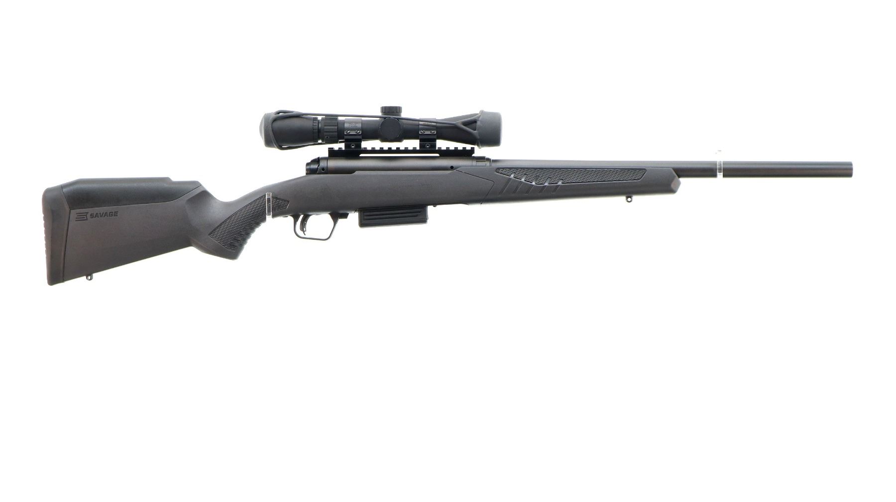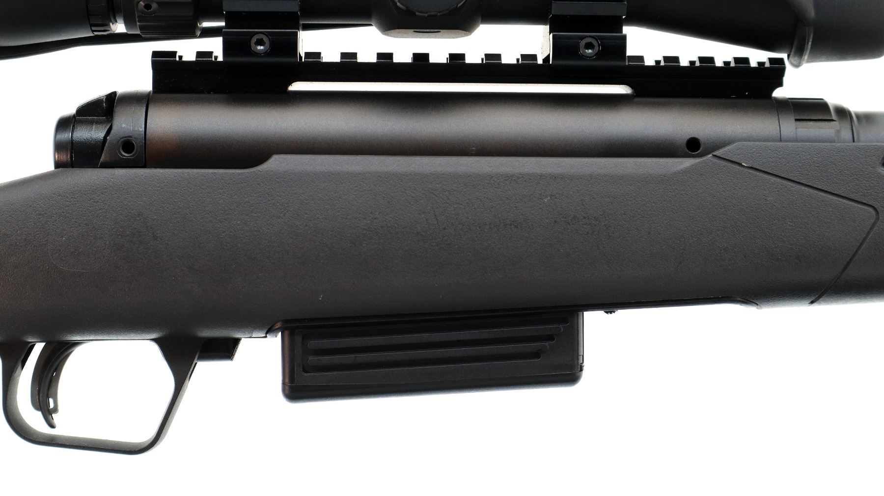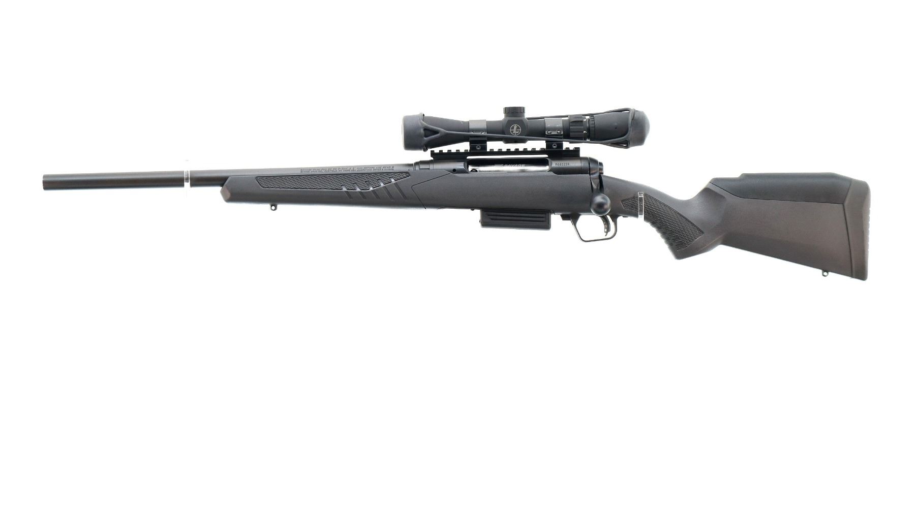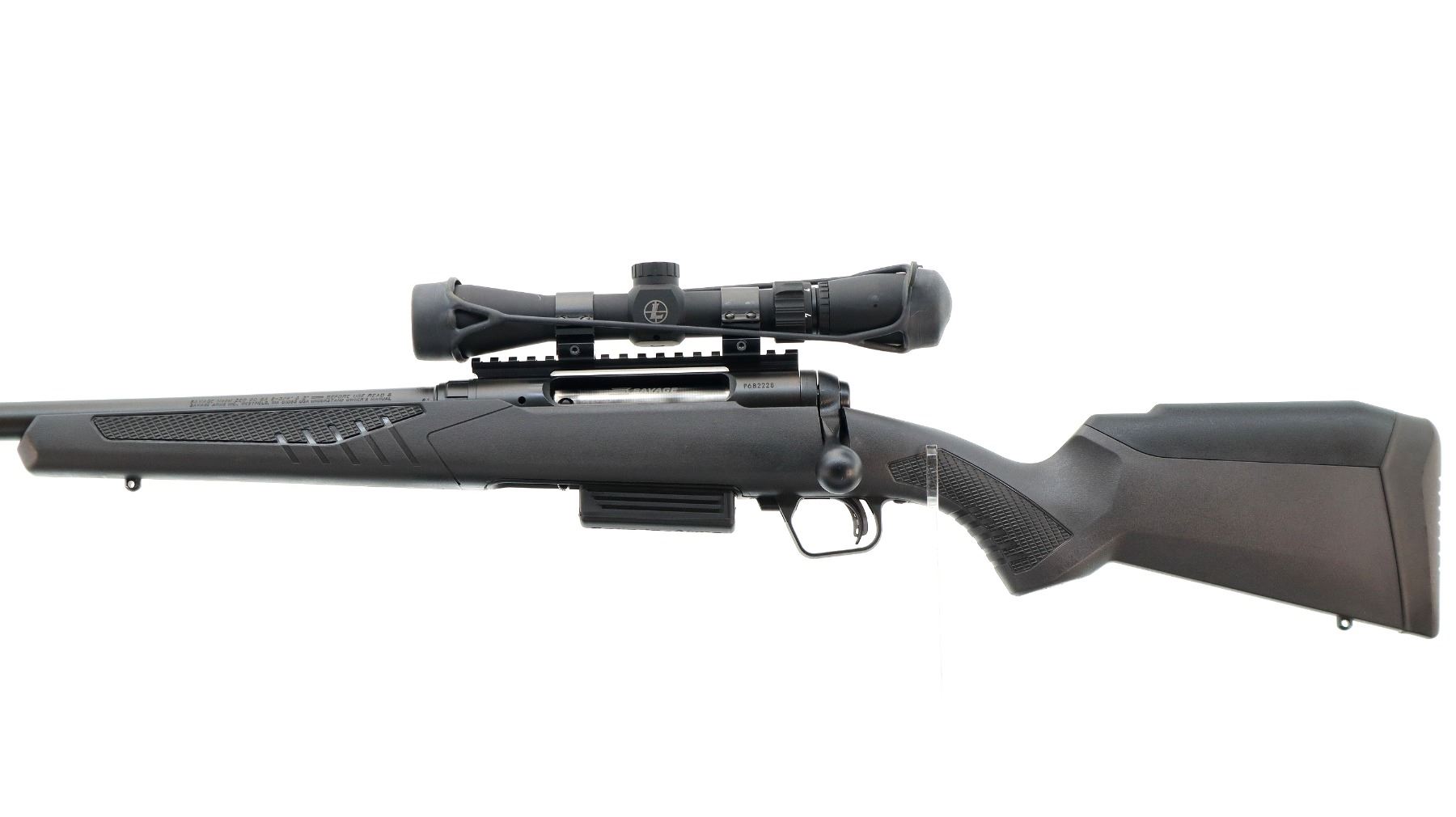 Main Description: No sights, Parkerized metal finish, round barrel, receiver drilled and tapped with Leupold Freedom 2-7x33 scope installed, clear optics with duplex crosshair. Left hand ejection port, bolt with large knob, tang safety. One piece grey synthetic stock, checkered black rubber forearm and pistol grip panels, raised cheek rest, black rubber recoil pad, 12.75" LOP, grip cap, accu trigger, swivel studs.