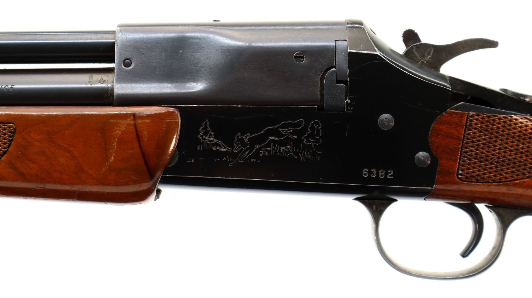 Main Description: Blade front sight with ramp, adjustable folding u notched rear sight, blued round barrels drilled and tapped for scope mount with plug screws installed, engraved black painted receiver, grooved spur hammer with barrel selector, extractor. Two piece wood stocks, checkered forearm and pistol grip which is chipped and cracked behind receiver, raised comb, grooved black polymer butt plate, grip cap.