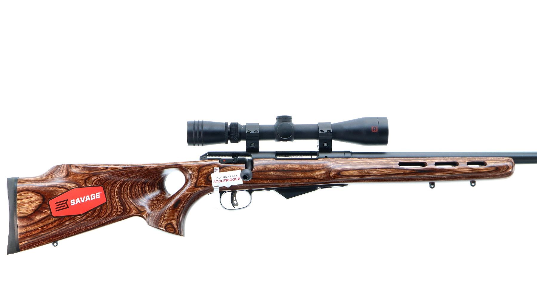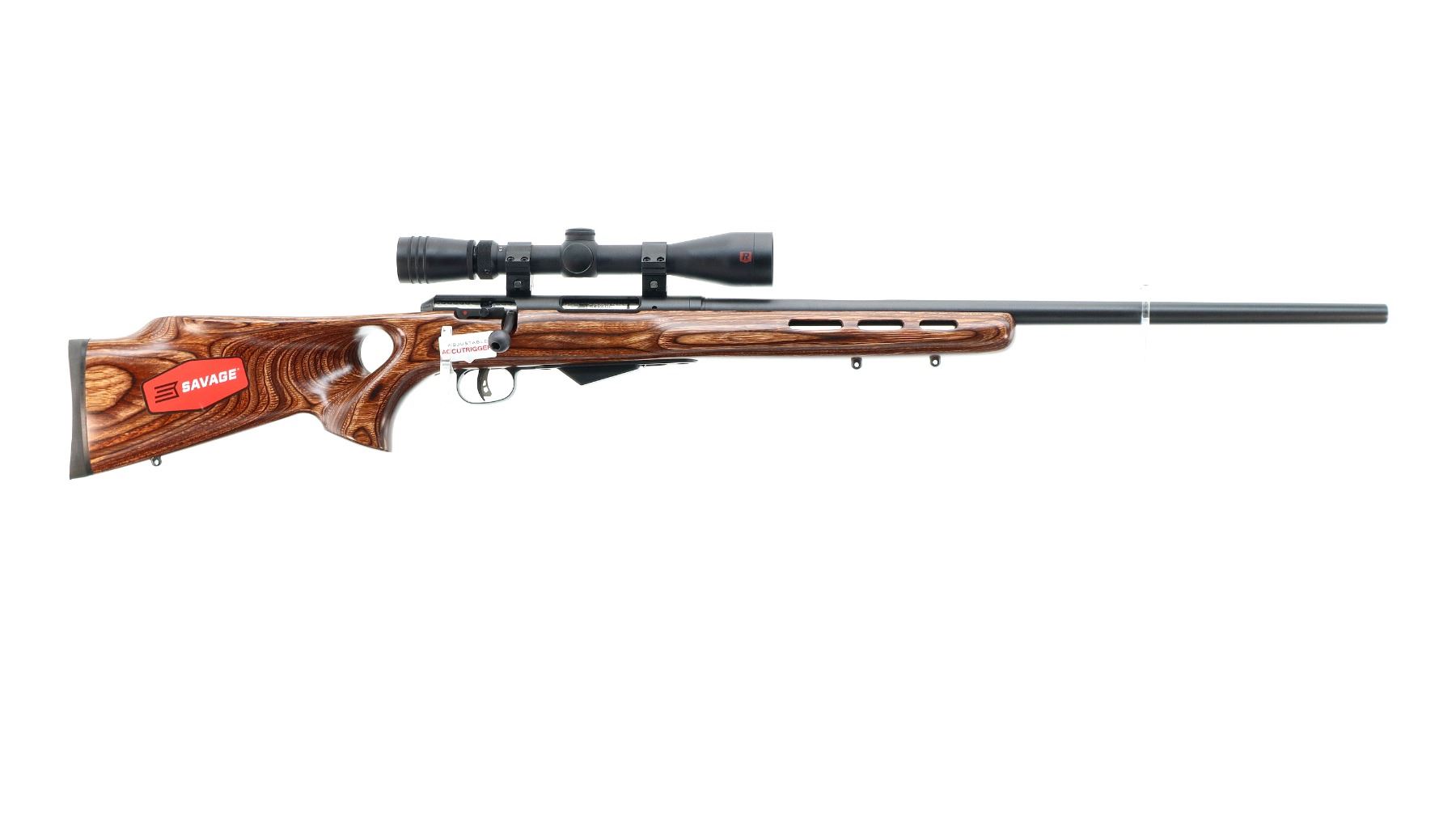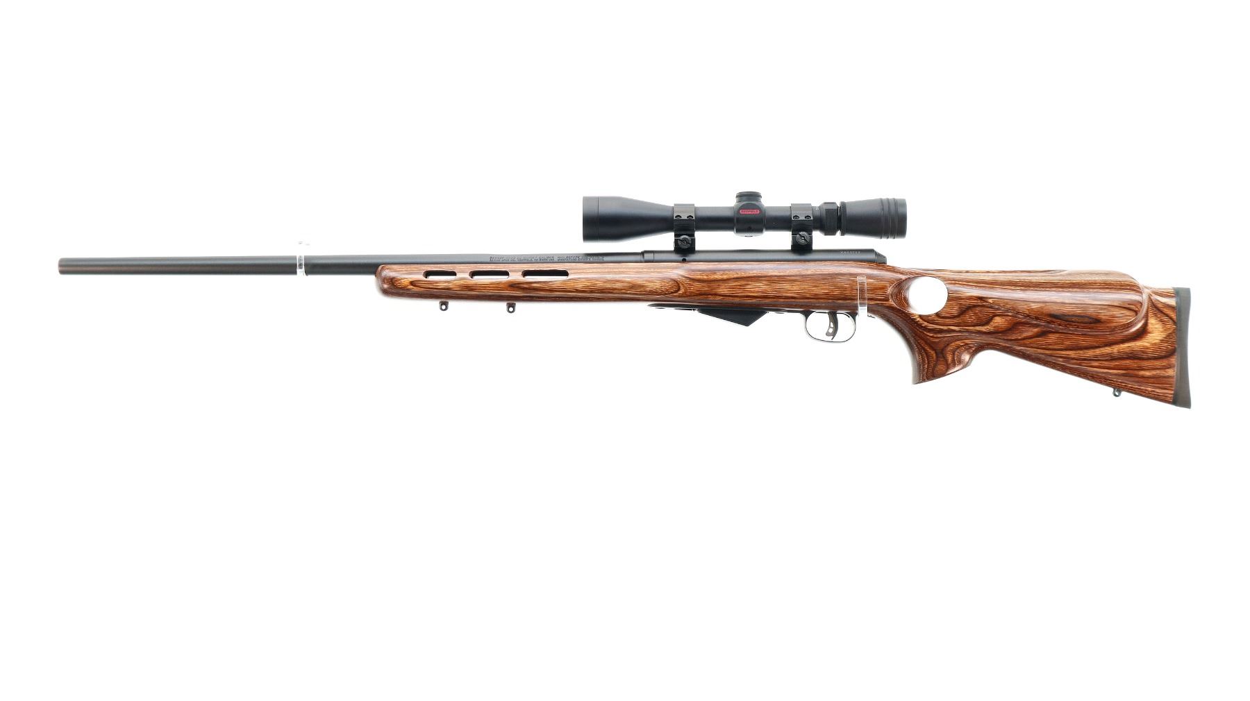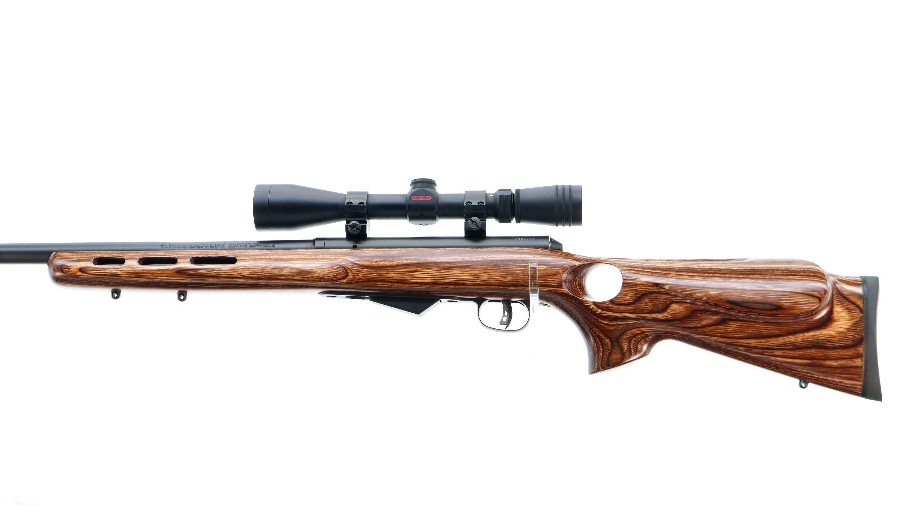 Main Description: No sights, Parkerized metal finish, heavy barrel, receiver drilled and tapped with Redfield Revolution 3-9x40 scope installed, clear optics with duplex crosshair. Jeweled bolt with smooth knob. One piece brown laminate wood stock, ventilated forearm, thumb hole pistol grip, cheek rest, brown rubber recoil pad, accu trigger, three swivel studs, retains factory stickers.