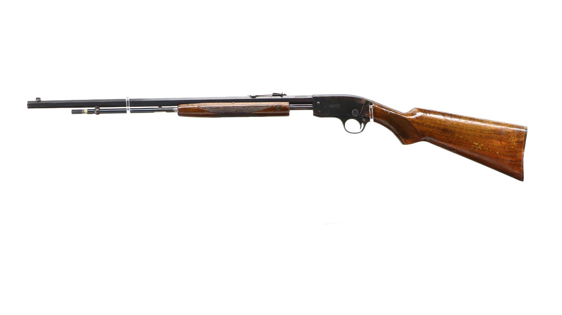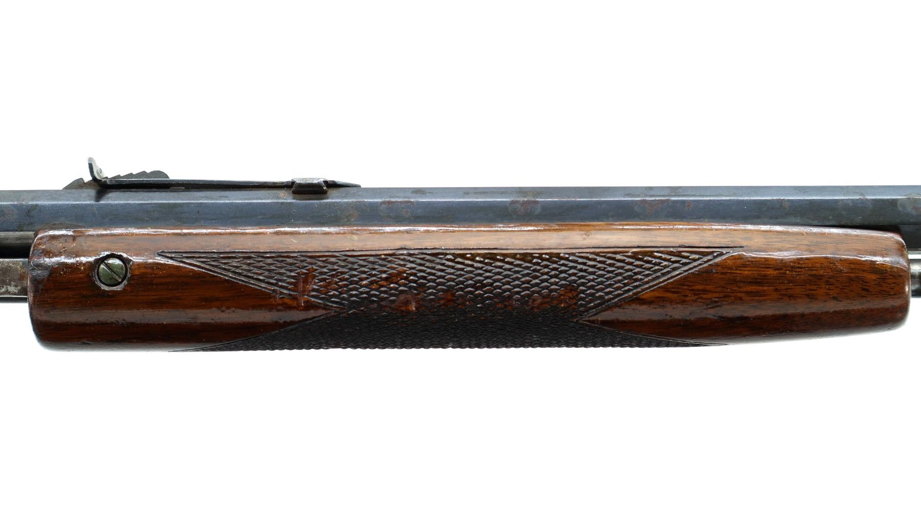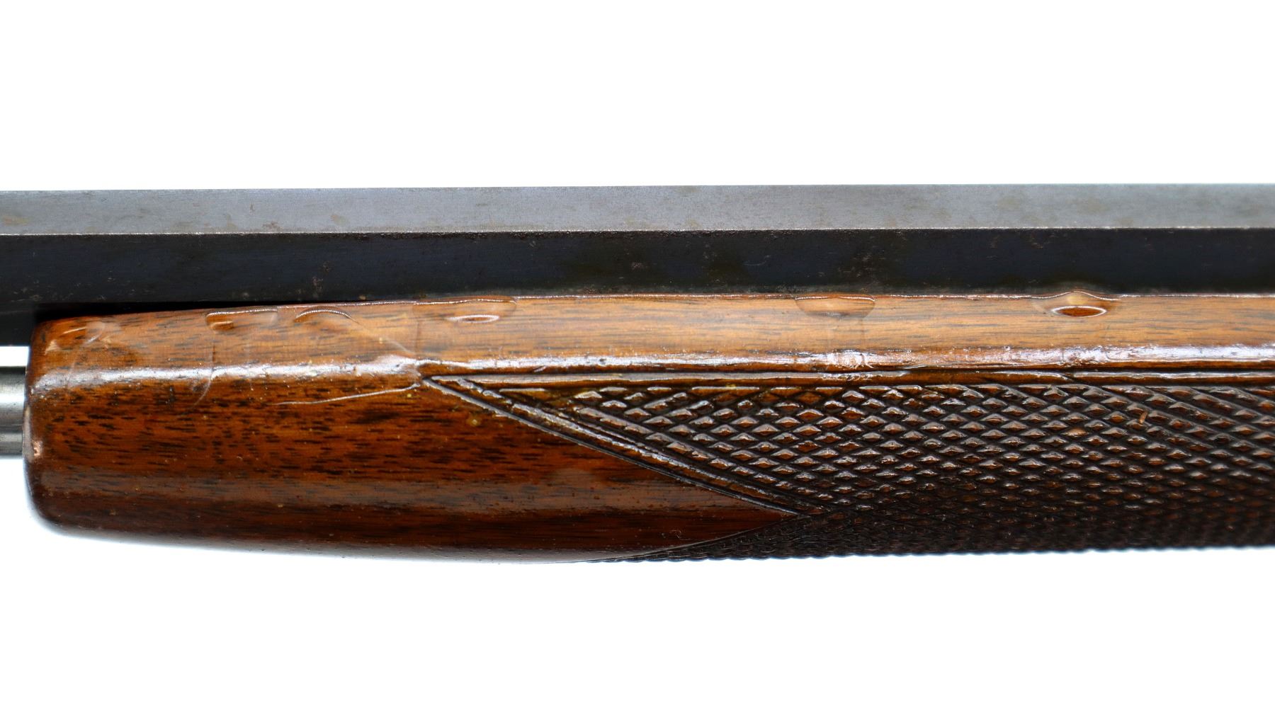 Main Description: Blade front sight, adjustable u notched rear sight, blued finish, octagon barrel. Two piece refinished wood stocks, checkered forearm which is chipped, checkered pistol grip, grooved black polymer butt plate.