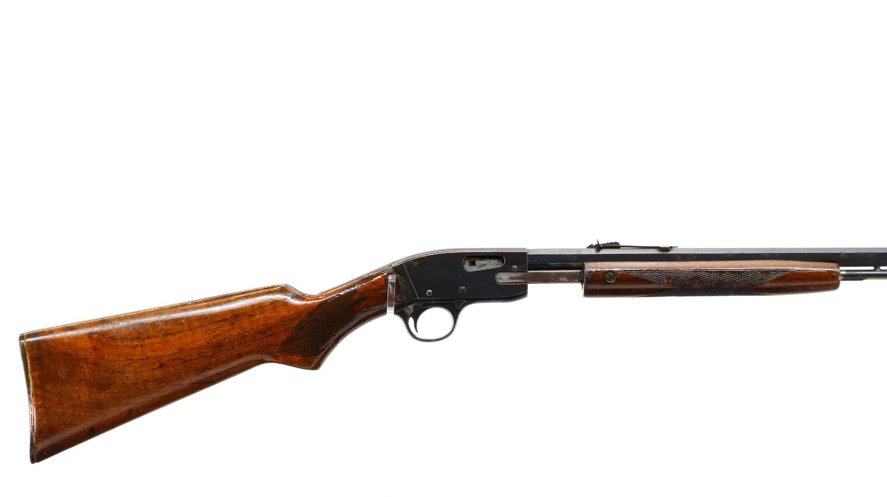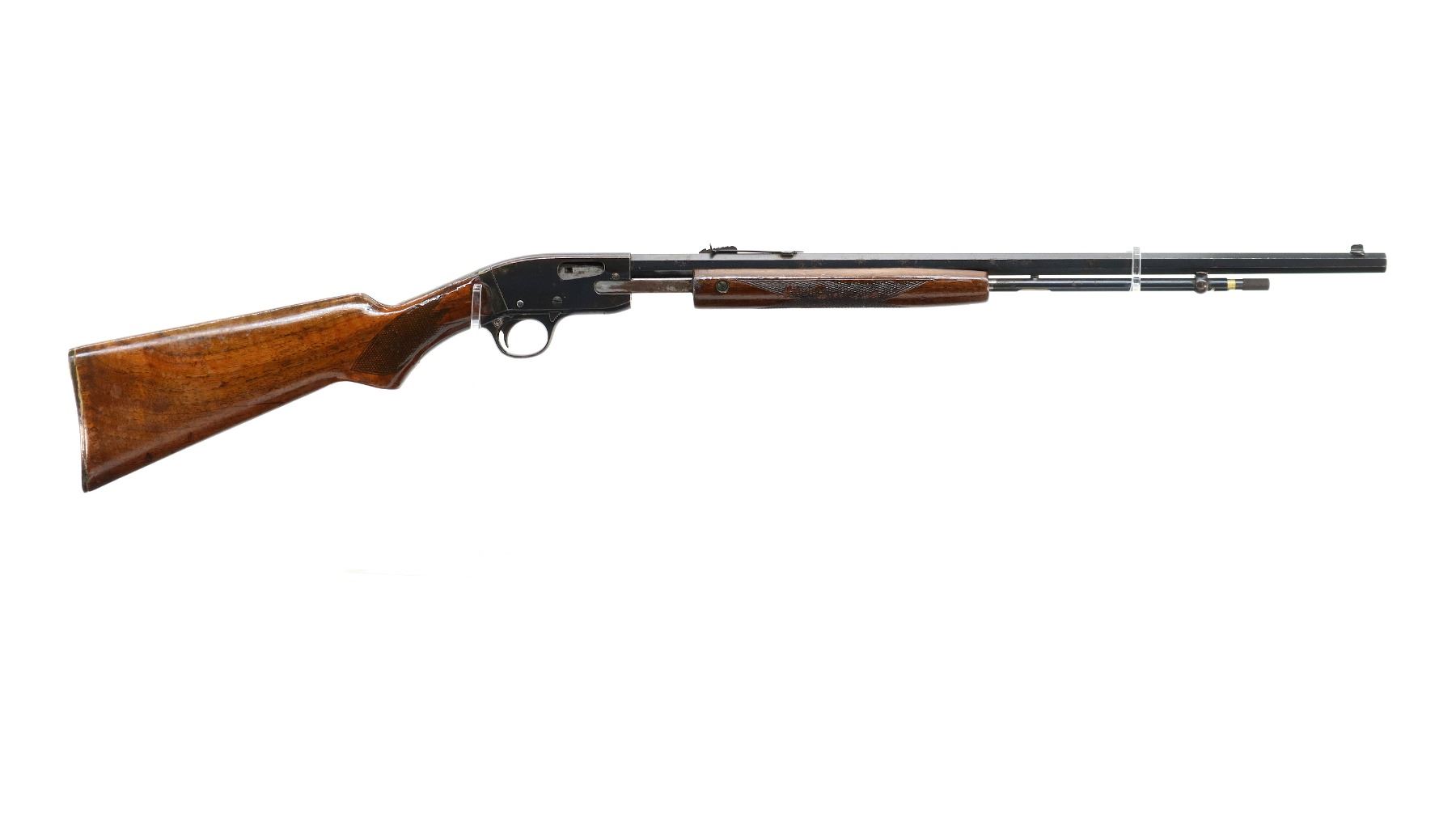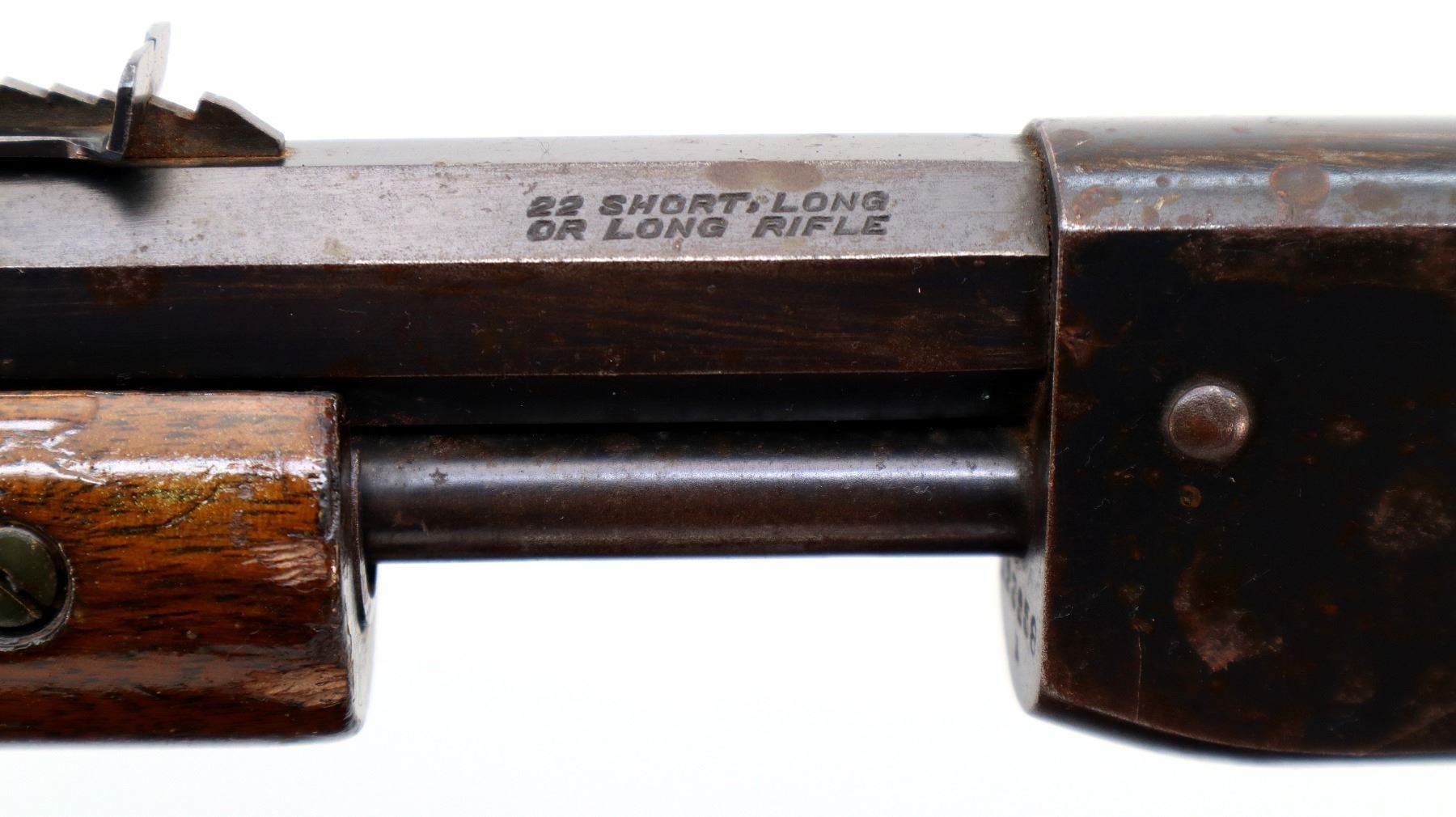 Main Description: Blade front sight, adjustable u notched rear sight, blued finish, octagon barrel. Two piece refinished wood stocks, checkered forearm which is chipped, checkered pistol grip, grooved black polymer butt plate.