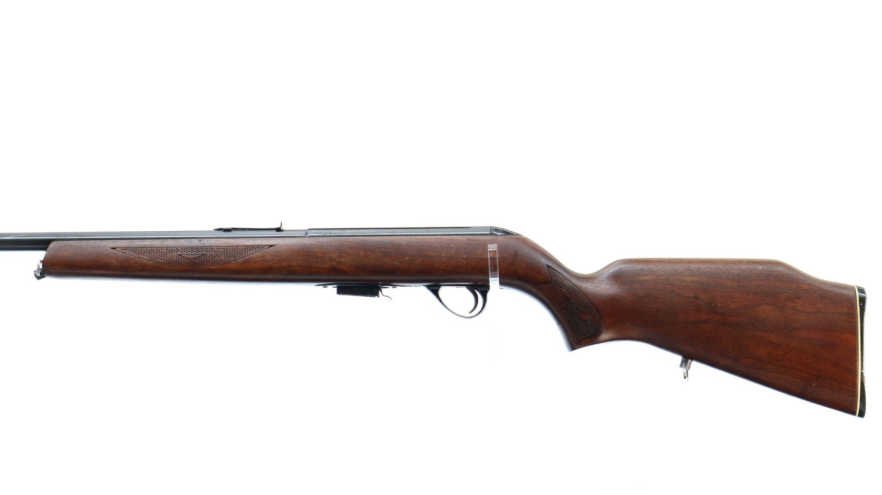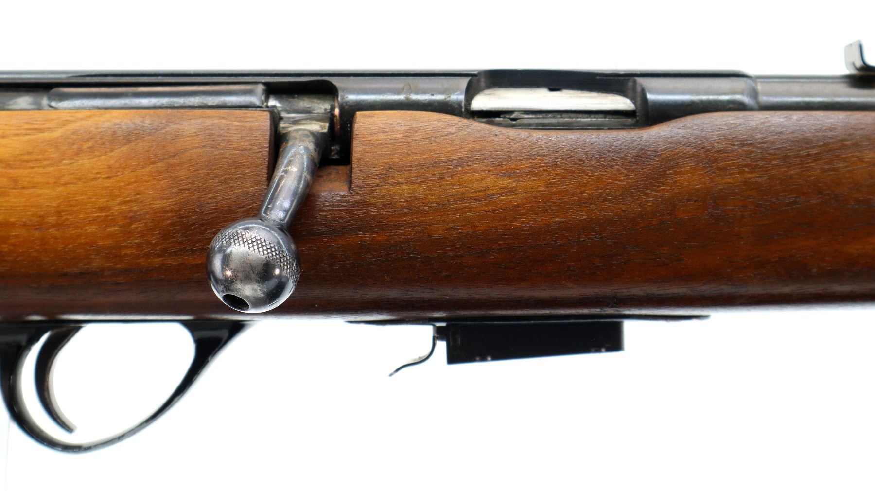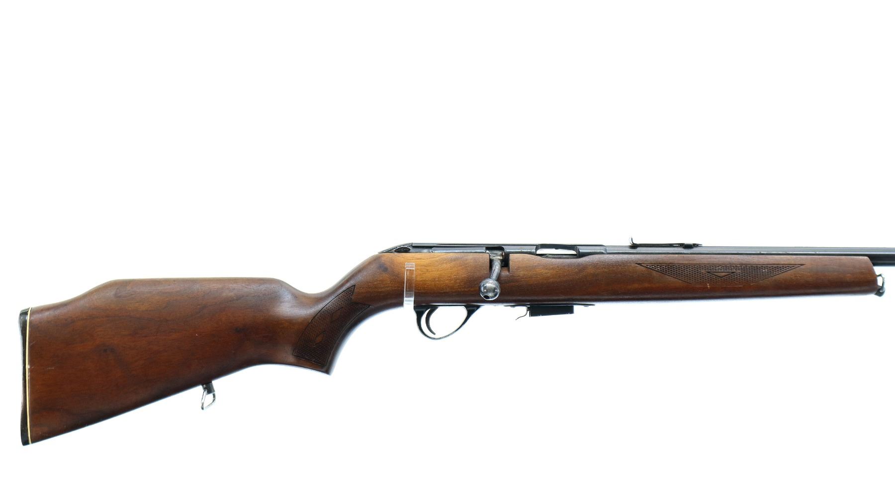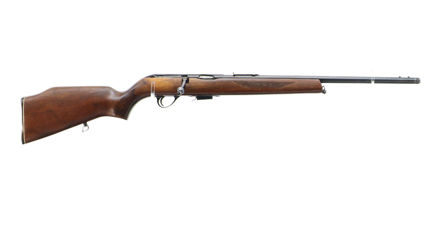 Main Description: Missing front sight holes present, u notched rear sight missing elevator, blued finish, threaded muzzle with cap, grooved receiver, bolt handle is loose appears to have been welded may require repair. One piece wood stock, checkered forearm and pistol grip, raised comb, grooved black polymer butt plate, sling swivels.
