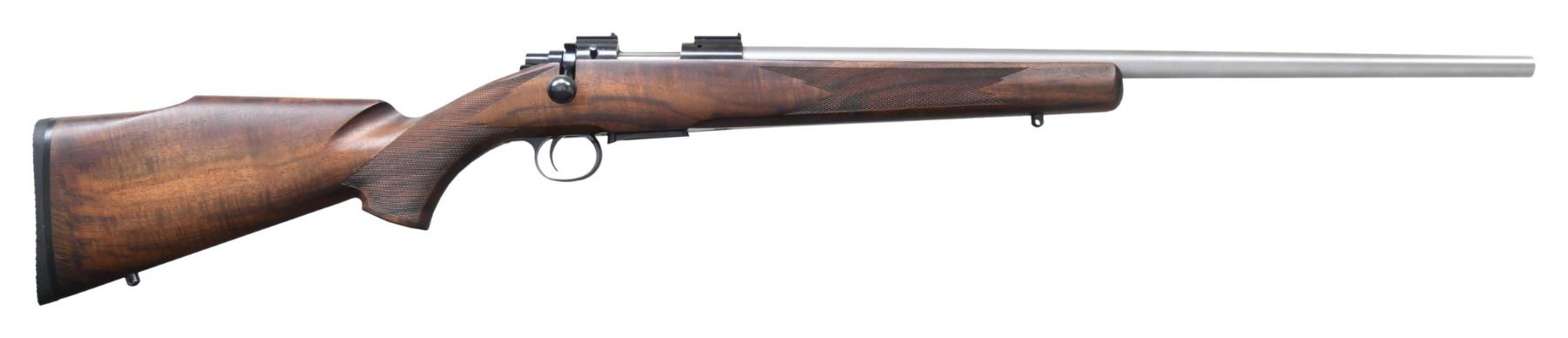 REPEATING SPORTER RIFLE. Cal. 22 CCN. S# 101. Mfg. 1992-1993; the .22 Cooper Centerfire Magnum is based on the .22 Extra Long Centerfire cartridge for the Maynard rifle. Chrome moly 24" bbl. without sights. Repeating action w/ scope bases. Numbers matching throughout including Custom Monte Carlo cheekpiece French walnut stock w/ checkering & black pad. CONDITION: all aspects near excellent. (25-2487/MD). MODERN. $800-1,200.