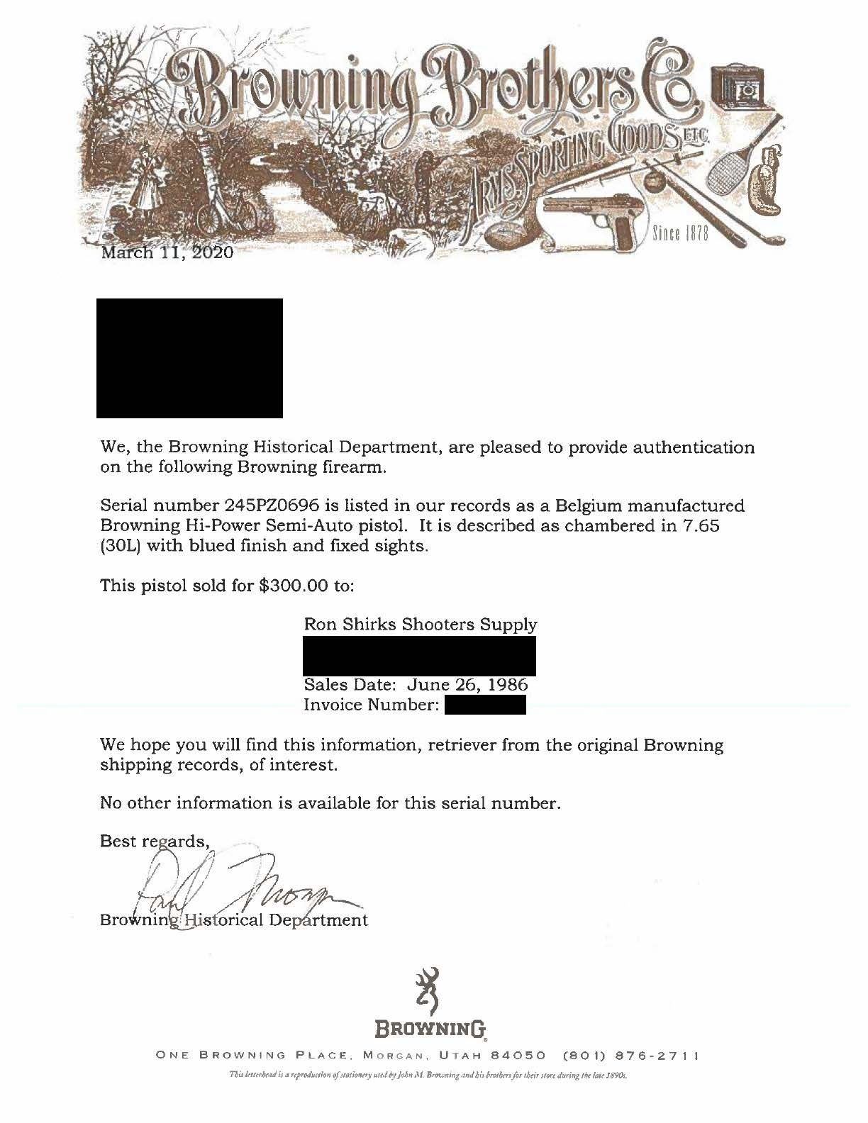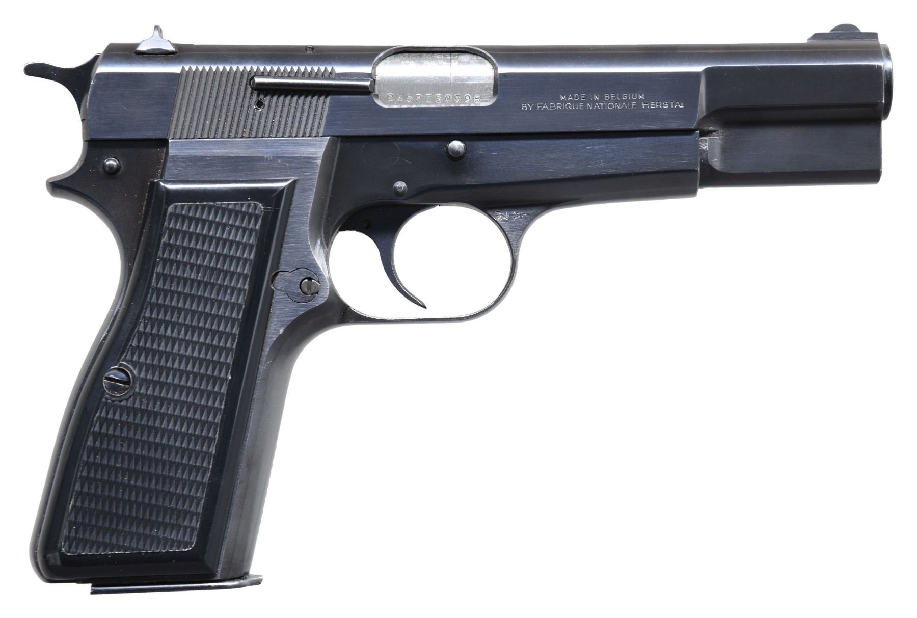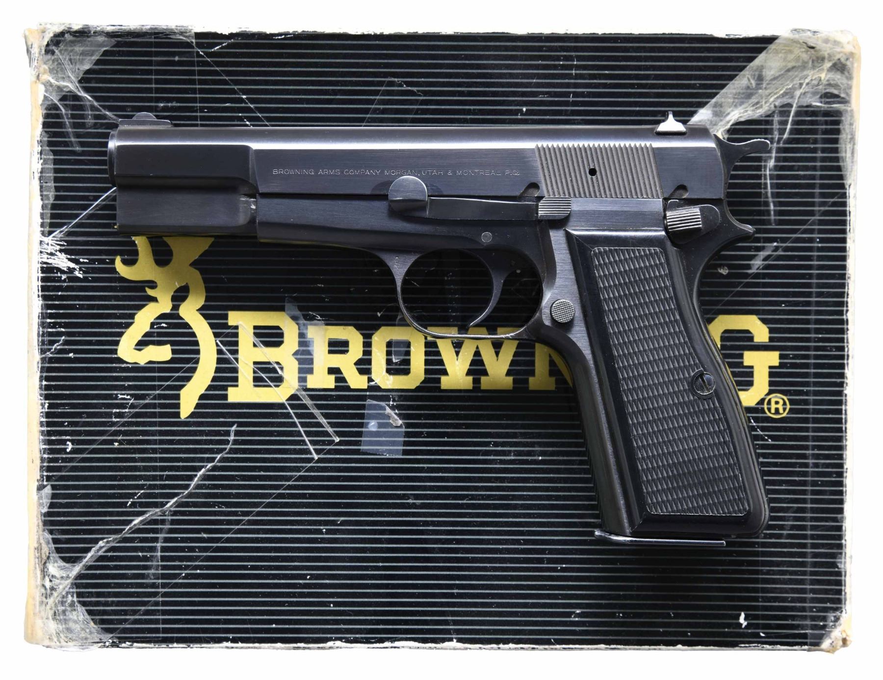 SEMI-AUTOMATIC PISTOL WITH MATCHING FACTORY BOX. Cal. 7.65mm. S# 245PZ50696. Bbl. 4 5/8". 1 of only approx. 1,500 Hi Power semi-automatic pistols chambered in 7.65x21mm Parabellum mfg. in Belgium by Fabrique Nationale and subsequently imported into the U.S.. While originally mfg. for the European commercial market, approx. 1,500 Hi Power pistols chambered in 7.65mm were sold to U.S. importers by FN as a means to reduce inventory. This example, mfg. in 1981, is marked with Browning's importer information on the left side of the slide, with "MADE IN BELGIUM/ BY FABRIQUE NATIONALE HERSTAL" marked on the right. Right side of the forward trigger guard web exhibits Belgian commercial proofs. Metal components exhibit a blue finish overall, save for on the 2-piece bbl., which is polished in-the-white. Frame is mounted with 2-piece checkered black synthetic grips. Slide features a flat rib, with a fixed half-moon blade front sight, and dovetailed V-notch rear sight. All serialized parts are matching and include the frame and bbl. MAGS: 2 blued 13-rd. with blued button pattern floorplate. Mags. are marked "CAL.7.65m/mP./ ONLY" on the spine. UNATTACHED ACCESSORIES: matching Browning cardboard box, containing its matching styrofoam insert, 1 spare mag., and a steel cleaning rod. This example is also accompanied by a factory letter indicating that this example was sold for $300.00 to Ron Shirks Shooters Supply in Lebandon, PA (Invoice #160122G) on June 26th of 1986. CONDITION: excellent, with metal components retaining bountiful amounts of their original factory blue finish, exhibiting some light edge wear on the forward edges of the slide, with a few superficial handling marks present overall. Brilliant mirror bore, exhibiting some spots of grease, while retaining well defined rifling throughout. Grips are excellent overall. Box exhibits wear overall, with tearing at corners and taped repairs present along the edges of the end flaps. A very nice example of a rare Hi Power pistol chambered in 7.65x21mm Parabellum. PROVENANCE: From the Estate of Jon Thomas, Gunsport, LTD. (25-1136/MLW). MODERN. (25-1136/MLW). MODERN. $700-1,000.
