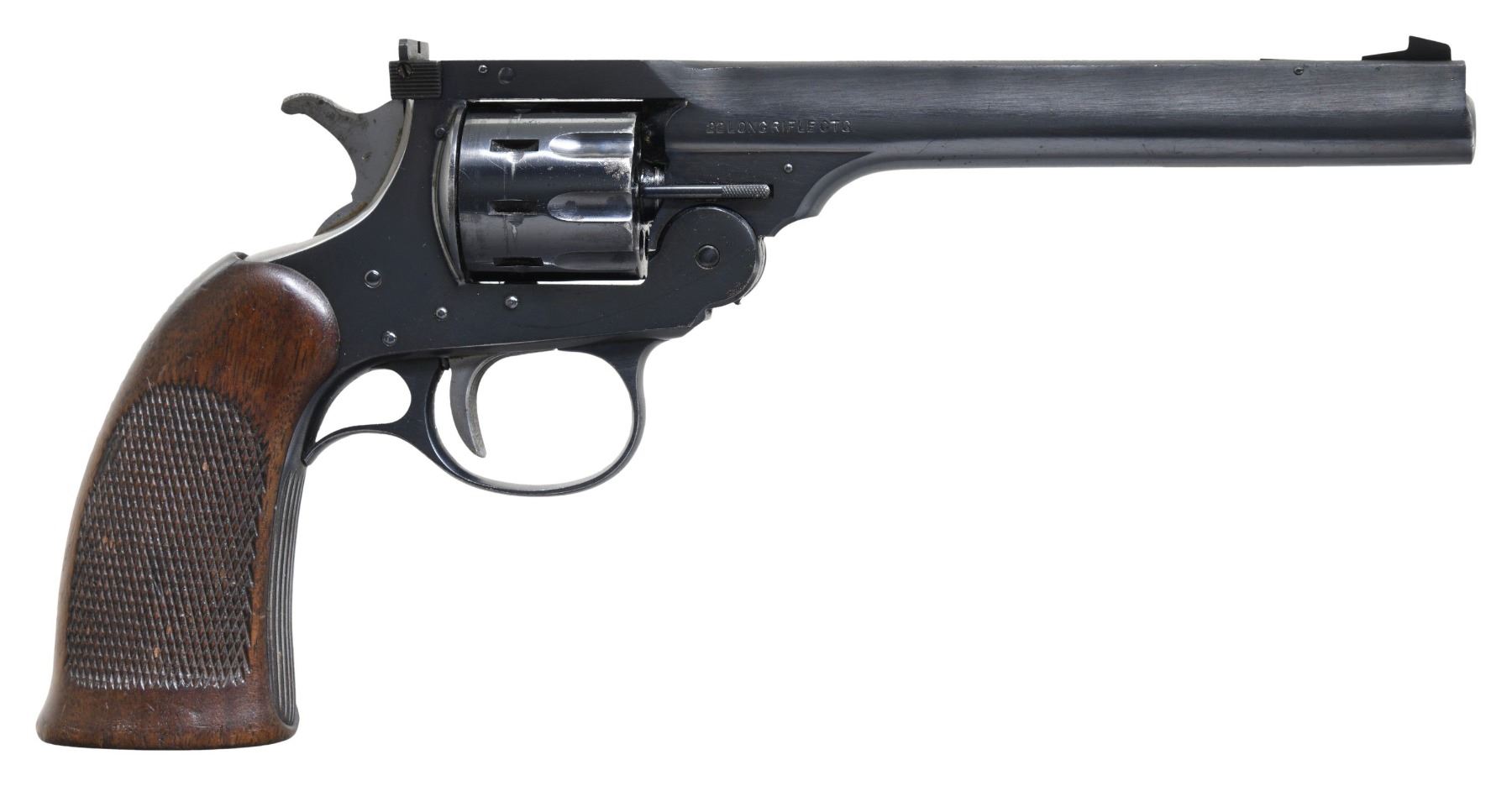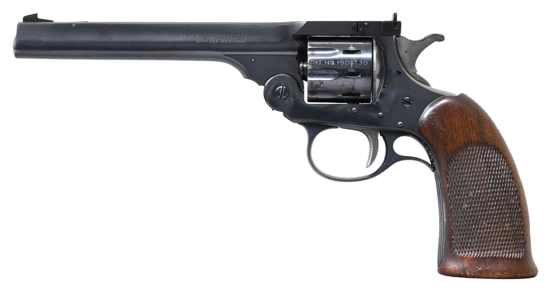 Cal. 22 LR. S# S3706. Bbl. 6". Patridge front sight. Adjustable square notch rear sight. Early H&R Sportsman with special order features such as the seldom-encountered No.1 grip style & grooved front strap. Serial location has been moved due to grooved front strap. Blued finish with bright trigger & hammer. Checkered walnut grip. UNATTACHED ACCESSORIES: previous copy of an auction description for this revolver. CONDITION: bottom of grip has previous owner's name lightly scratched into it. Grip otherwise show some lightly chipped points & scattered handling marks. Trigger & hammer remain mostly bright with some light oxidation. Balance of metal retains 92% original blue with some light pitting on cyl., some thin scratches around the hinge screw head, edge wear, handling marks & oxidation specks. Action functions properly when hand cycled. Bright near excellent bore. PROVENANCE: Ex-Richard Littlefield Collection. (25-2086/MJC). CURIO. $300-500.