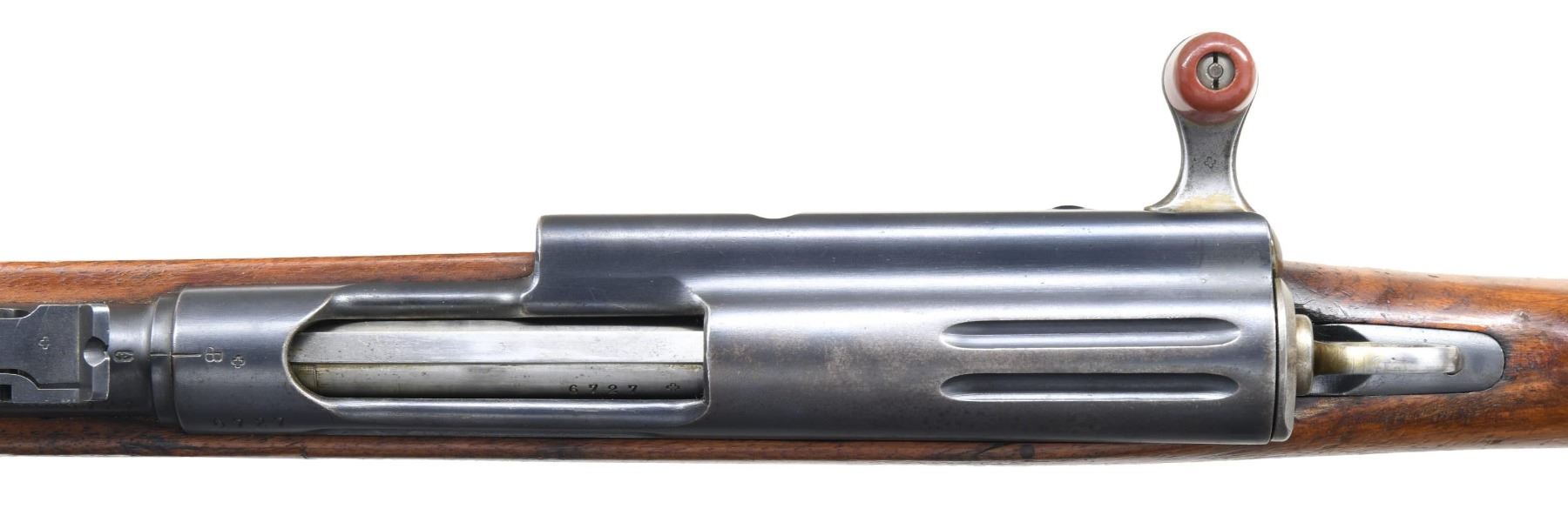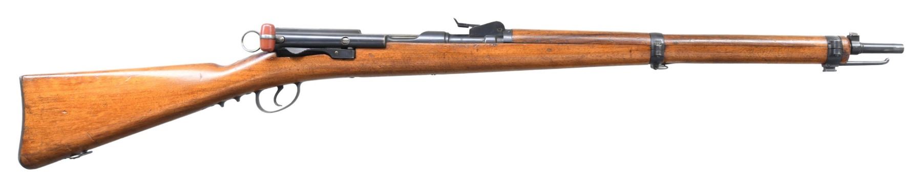 RIFLE. Cal. 7.5 Swiss Cadet. S# 6727. Bbl. 23 1/4". Blade front sight. Ladder rear sight graduated to 1200m. All visible matching numbers.Rubber bolt knobs are loose & unnumbered. Approx. 7,900 of these reduced sized single shot straight pull rifles were mfg. between 1898-1927. They were used with a reduced loading for target use which had the advantage of lessened recoil. Blued finish. Walnut stock set with bottom mounted sling swivels. Right side of butt has partially visible Swiss cross cartouche. CONDITION: stock set appears lightly sanded with added finish, scattered dings, scratches & handling marks. Metal retains 60-70% arsenal blue with scattered fading, oxidation & edge wear. Action functions properly when hand cycled. Very good bore. (25-2313/MJC). CURIO. $500-800.