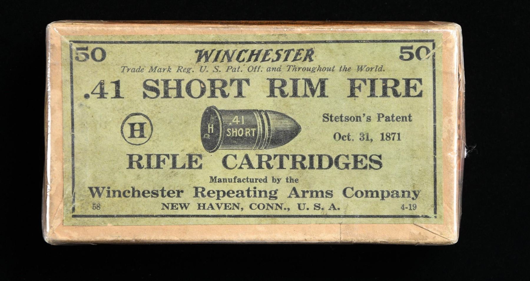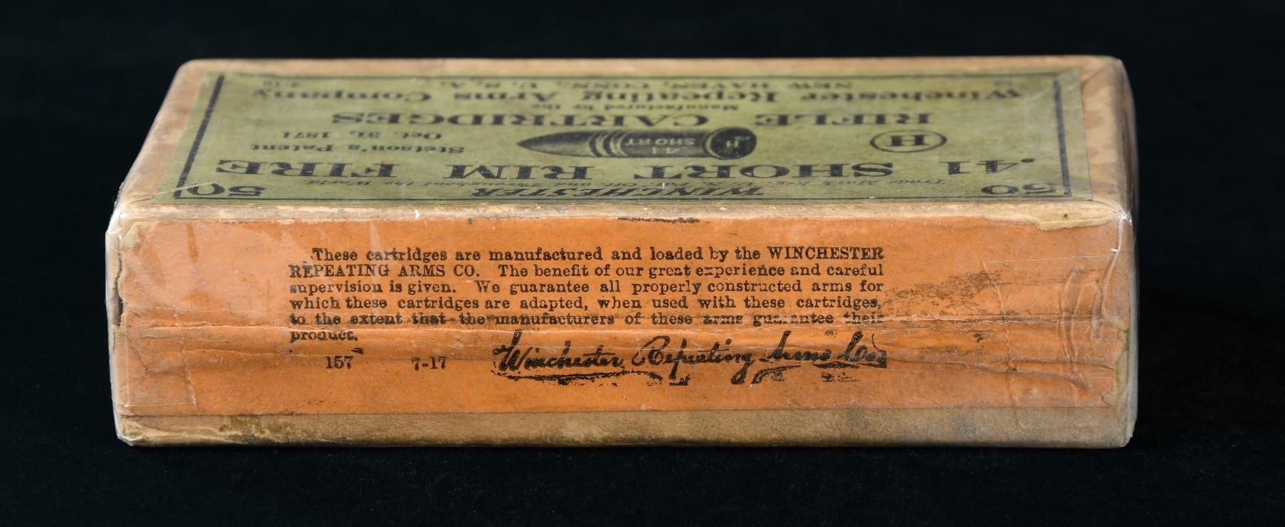 PACK. Full box of 50 .41 short rimfire cartridges manufactured by "WINCHESTER REPEATING ARMS COMPANY". "STETSON'S PATENT Oct. 31, 1871" orange side labels which originally sealed box, each marked ".41 SHORT". Fine early cartridge packs for derringers are scarce. CONDITION: very good to fine overall, label is fine with light soiling. One edge is still sealed with orange label still attached, so cartridges not examined, but appear to be complete and original. (02-24469/JS). AMMO. $400-600.