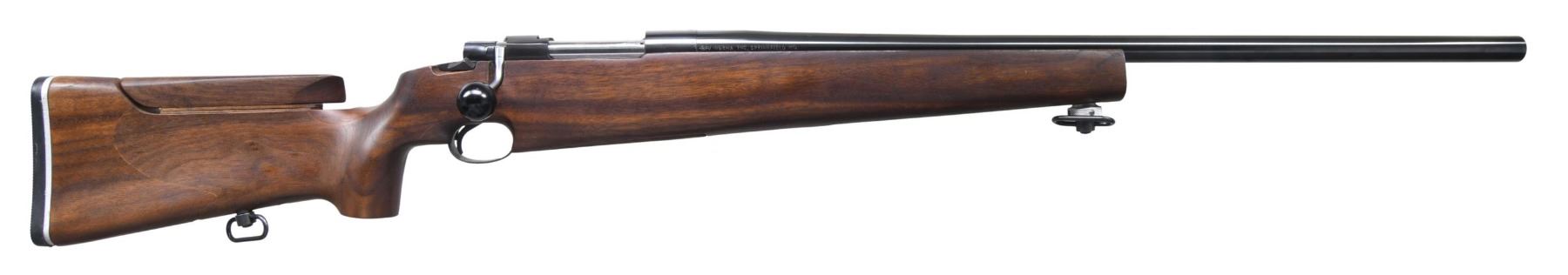 RIFLE. Cal. 308 Win. S# 273317. Bbl. full floating 27 5/8" target with beveled target crown; drilled and tapped (6-48) for target blocks at muzzle and at rear. Mfg. 1960's to 1970's by S&L using surplus military actions; usually Model 98's, but this is from a Model 96. Actions had military markings removed by S&L with new numbers applied; matching numbered bolt and release retaining charging slots plus thumb slot. Latest example by S&L with altered bolt handle for its screw on large black target knob. Bolt shroud altered to remove military safety as the adjustable Parker Hale trigger incorporates a sliding thumb safety. Most Model 69's were in 6.5X55 Swedish Mauser caliber; references list other caliber as 7.62X51 NATO, yet barrel marked "308 WIN.". Stocks made by Otterup had pronounced pistol grips, rubber buttpads and wide, flat bottomed forends with rail like this one that also has an adjustable comb. Uniquely shaped stock to have slight concave shape to right side of butt and extra depth at magazine area with an ingenious removable decorative walnut cover secured with a simple leaf spring. Receiver bridges drilled and tapped (6-48 front and 8-40 rear) for bases allowing for proper 7.2" spaced target scope blocks. Barrel markings indicate Norma of Springfield, MO as the importer, S&L Otterup marks and 86 date. Stock is satin oil finished and glass bedded in action area. CONDITION: an occasional very faint handling mark, but overall close to excellent with near excellent bore. (25-3318/NW). MODERN. $650-900.