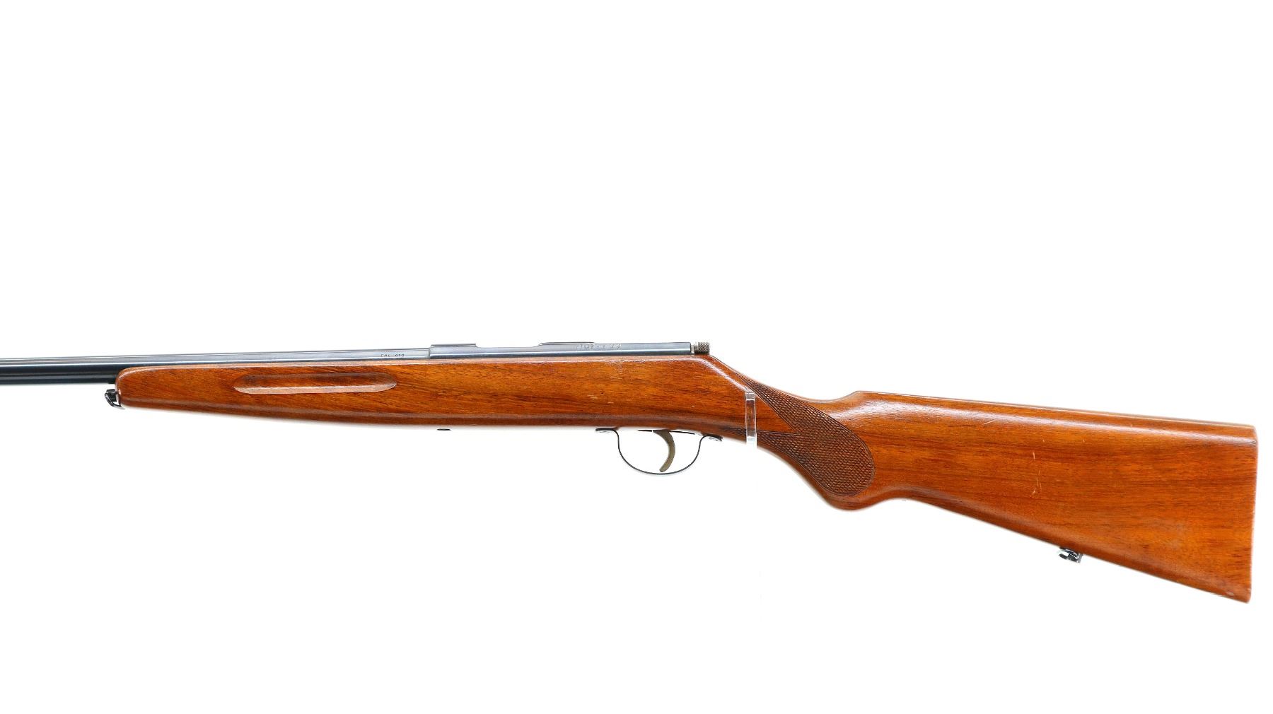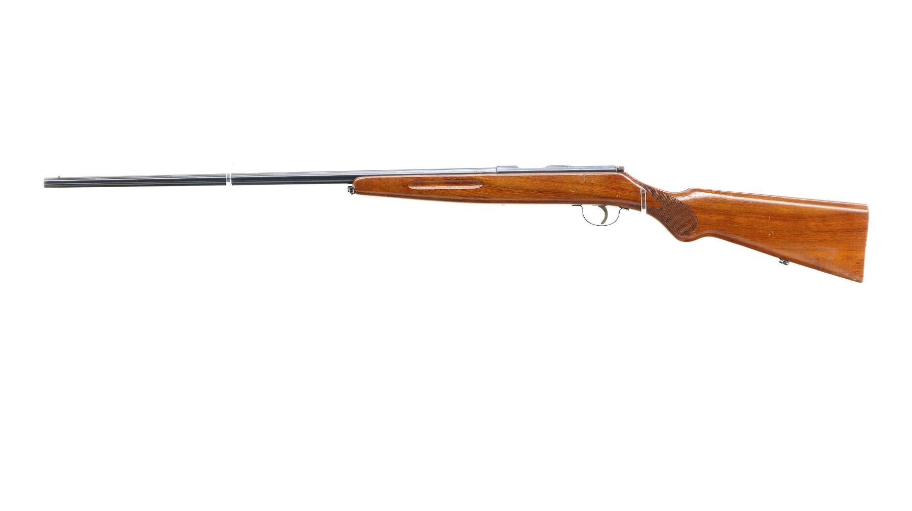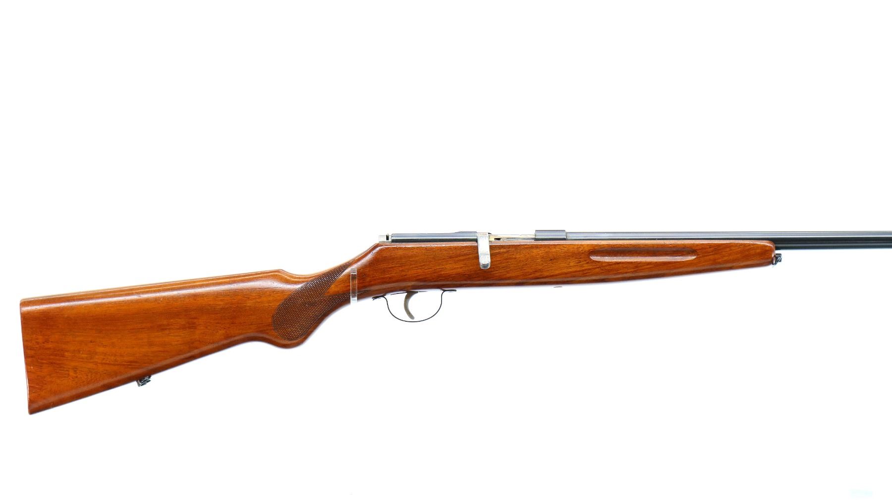 Main Description: Brass bead, blued finish, round barrel, silver bolt with butter knife bolt handle, extractor is present. One piece wood stock, finger grooved forearm, checkered pistol grip, smooth butt, sling swivels.