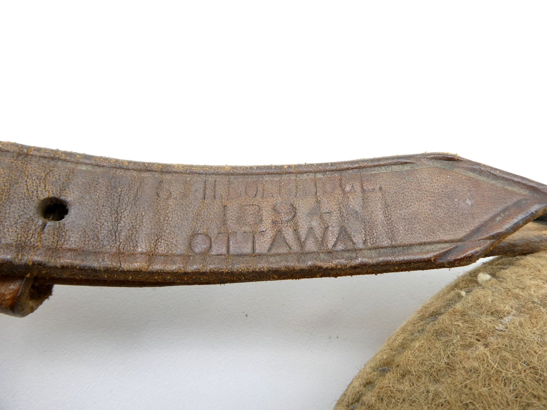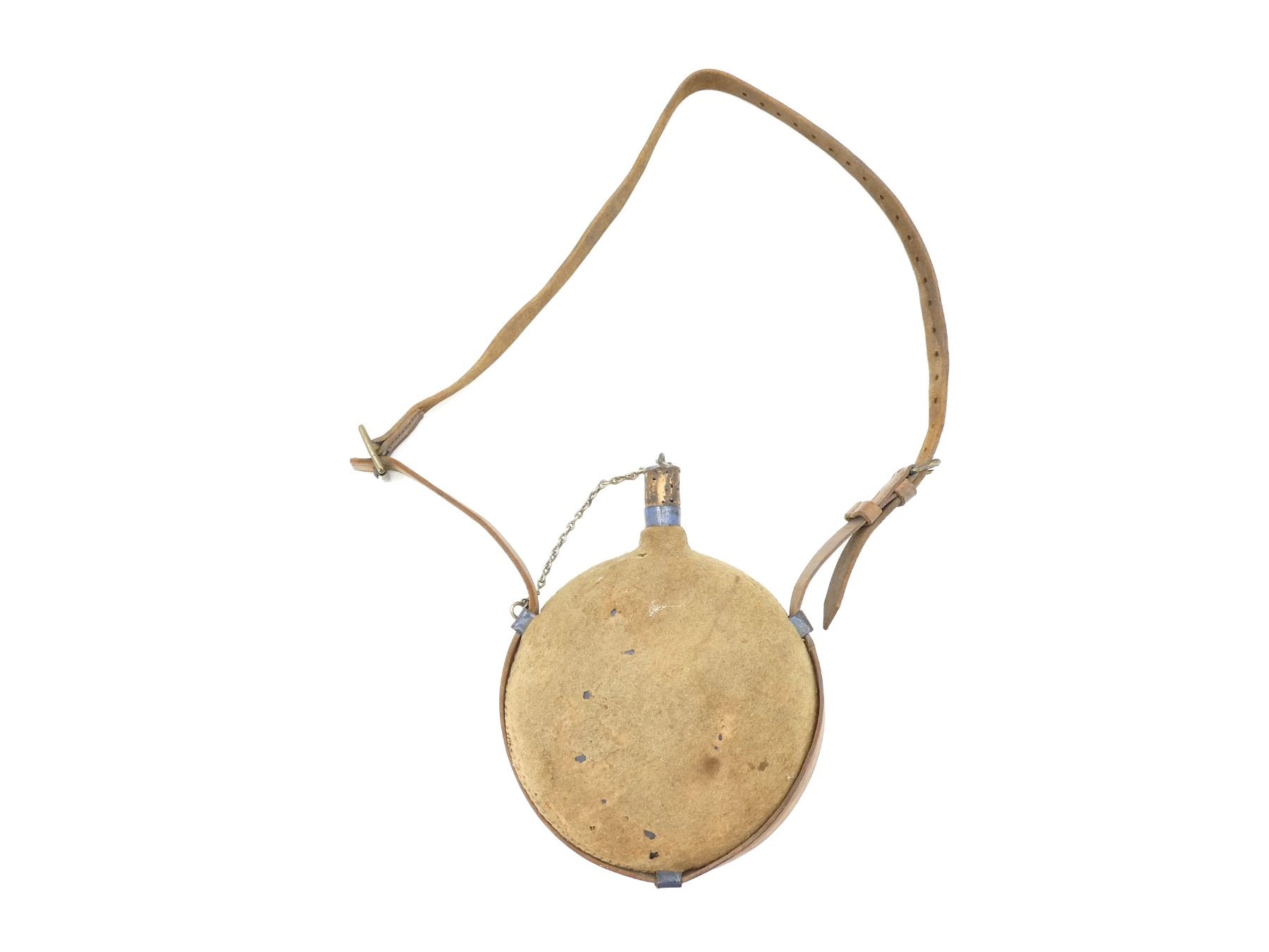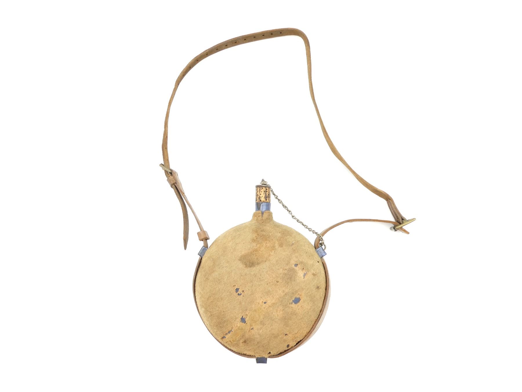 (1) TAN FELT / WOOL COVERED BLUE ENAMELED STEEL CANTEEN WITH CORK / METAL STOPPER, CHAIN ATTACHED TO STOPPER / CANTEEN, BROWN LEATHER SHOULDER STRAP MARKED: "S.&H. BORBRIDGE, 1894, OTTAWA", "1895, M-D, O", "W", "5", "12", SHOWS AGE / WEAR (MOTH HOLES IN COVER). SEE PHOTOS.