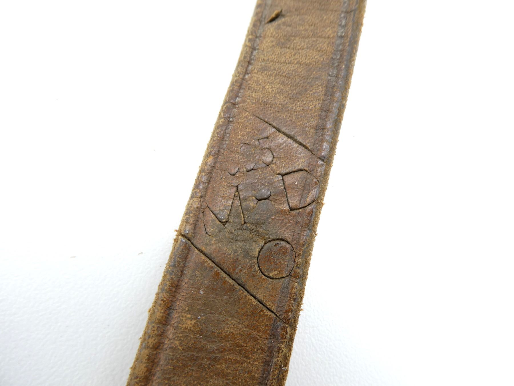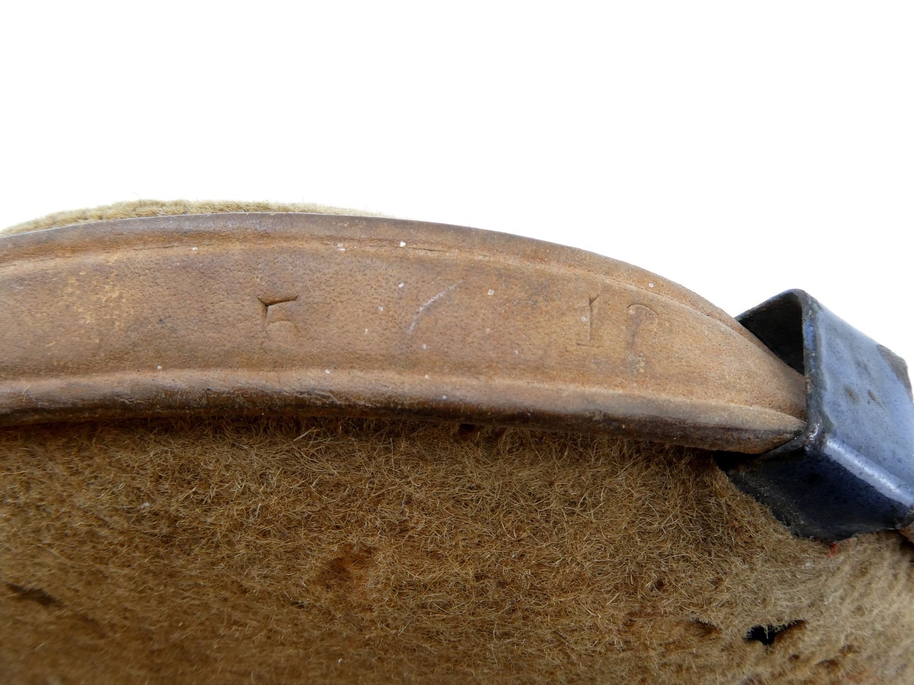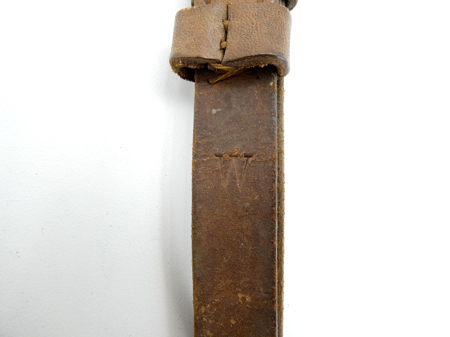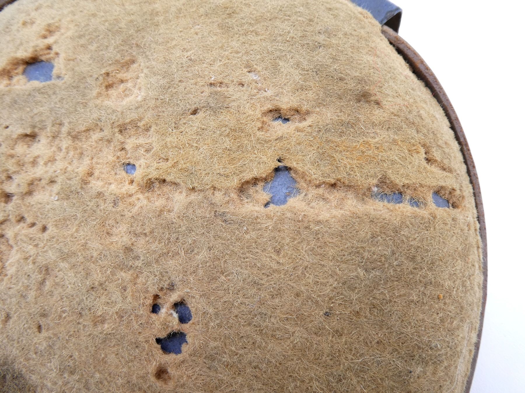 (1) TAN FELT / WOOL COVERED BLUE ENAMELED STEEL CANTEEN WITH CORK / METAL STOPPER, CHAIN ATTACHED TO STOPPER / CANTEEN, BROWN LEATHER SHOULDER STRAP MARKED: "S.&H. BORBRIDGE, 1894, OTTAWA", "1895, M-D, O", "W", "5", "12", SHOWS AGE / WEAR (MOTH HOLES IN COVER). SEE PHOTOS.