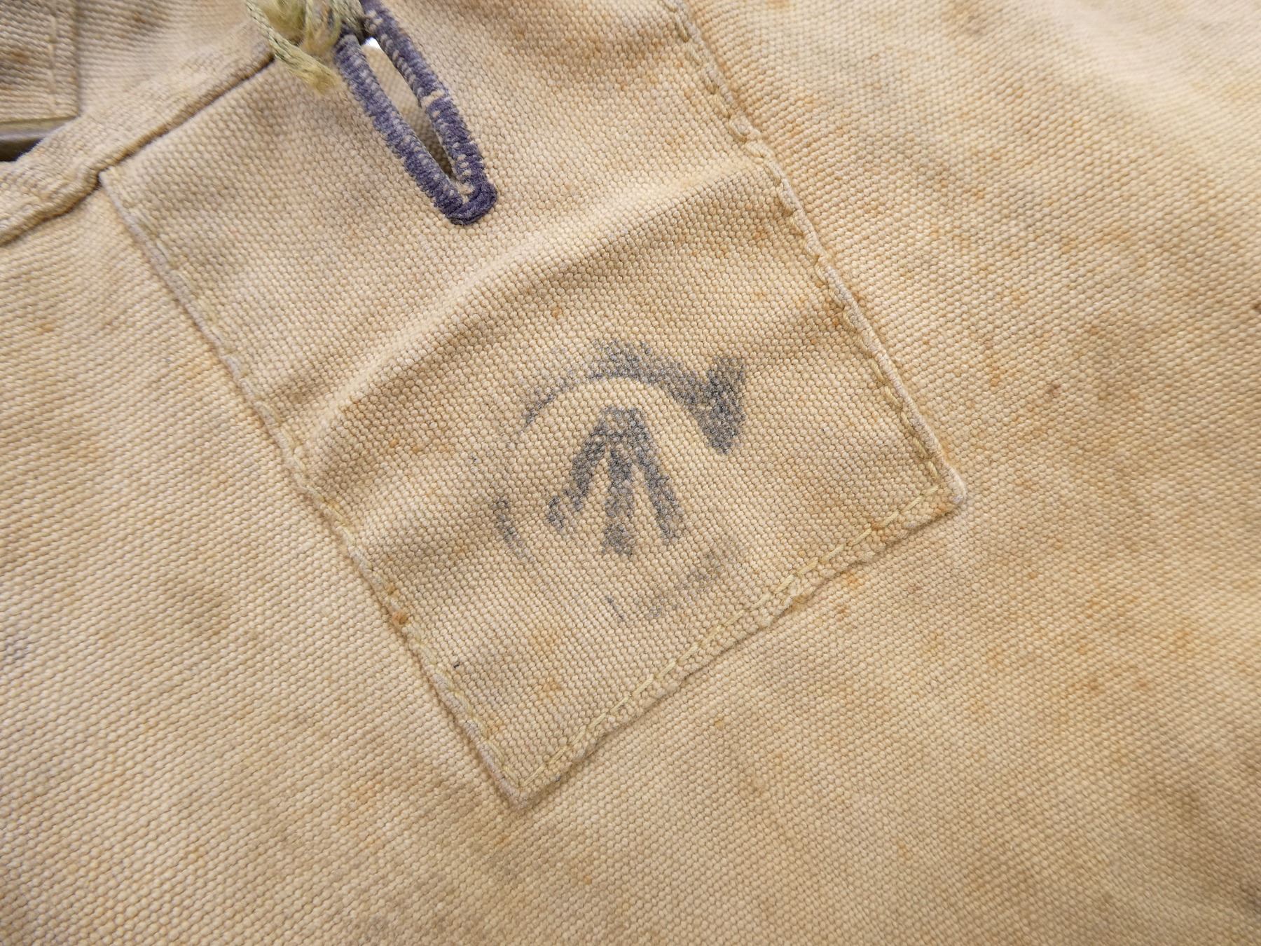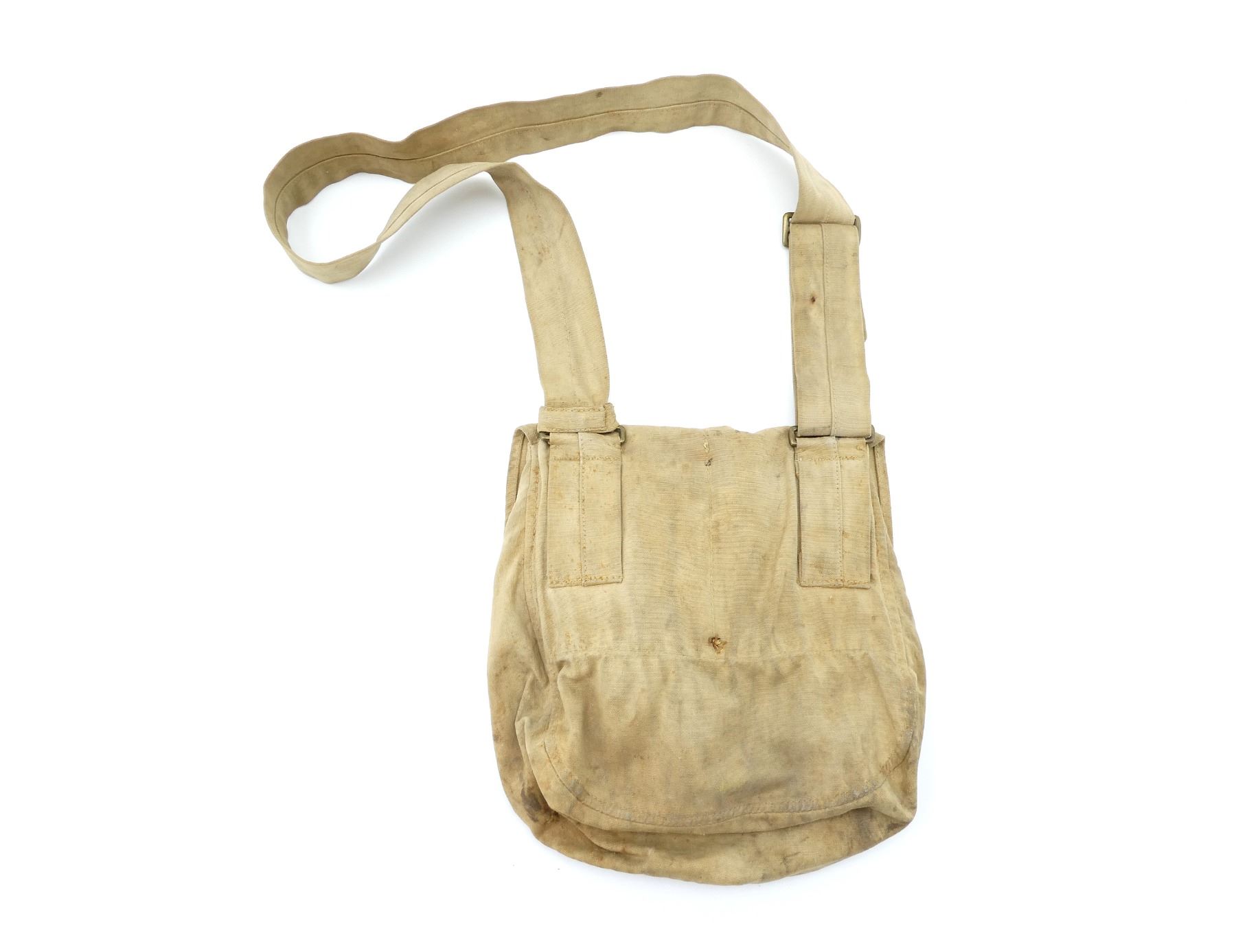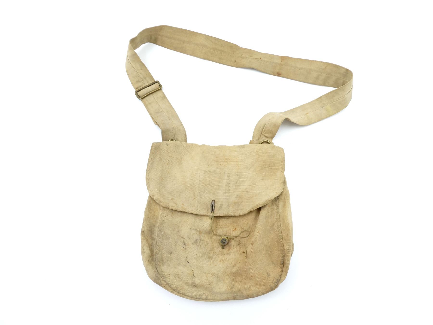 (1) TAN CANVAS SIDE BAG MARKED WITH C-BROAD ARROW ON FLAP, 3-POCKETS, BRASS BUTTONS, BRASS FITTINGS, TWO TAN CANVAS BELT LOOPS, TAN CANVAS ADJUSTABLE SHOULDER STRAP, SHOWS AGE / WEAR. SEE PHOTOS.