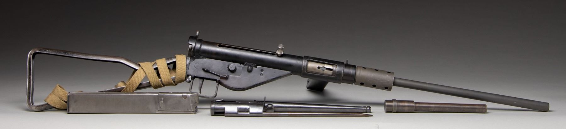 Cal. 9mm. S# SA2-0065. Bbl. 16". A closed bolt, blowback operated, semiautomatic only version of the British Sten MKII. Built on a Catco tube, it has a permanent full length sleeve over the original barrel to achieve the 16" in length mandated by US law for Title I firearms. Combination painted & parkerized finish. Welded blade front sight & fixed rear peep sight. Loop style butt stock. Tan, canvas sling. MAGS: 2 steel 30 rd. UNATTACHED ACCESSORIES: 7.5" plugged display barrel, bayonet & scabbard. CONDITION: Exterior finish is a potpourri of types & coverage's, from full to bare, painted & parkerized. Bore is bright w/ strong rifling. Fire control mechanism appears to function correctly when cycled by hand. (25-2353/JZ). MODERN. $600-900.