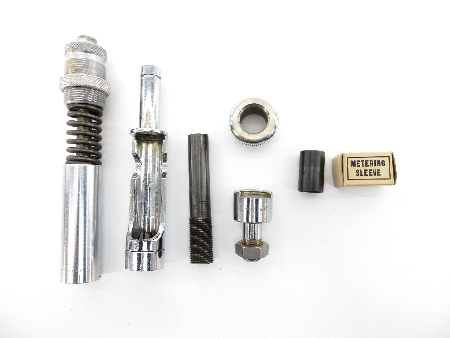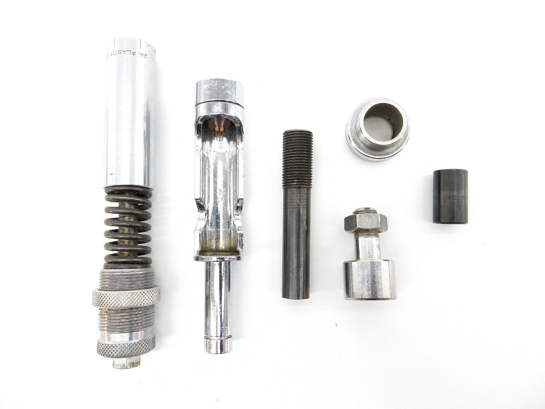LOT INCLUDES; (1) CH 20 G. SIZING RING, (1) CH 20 G. SHELL HOLDER, (1) METAL PIECE MARKED: "20 G. PLASTIC CRIMPER 6 PT.", (1) METAL PIECE MARKED: "CH, WAD PRESS., LBS., 20 GA." ETC., (1) CH 7/8 OZ. METERING SLEEVE, ETC. SEE PHOTOS.