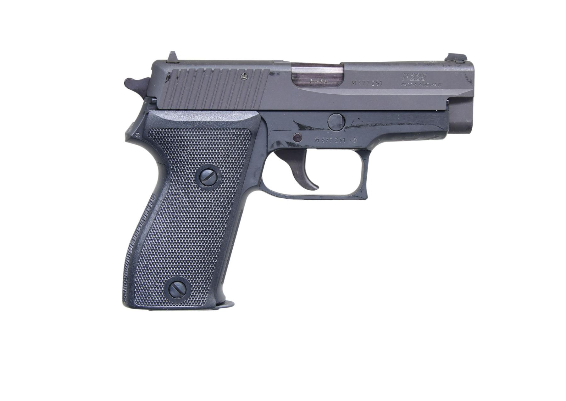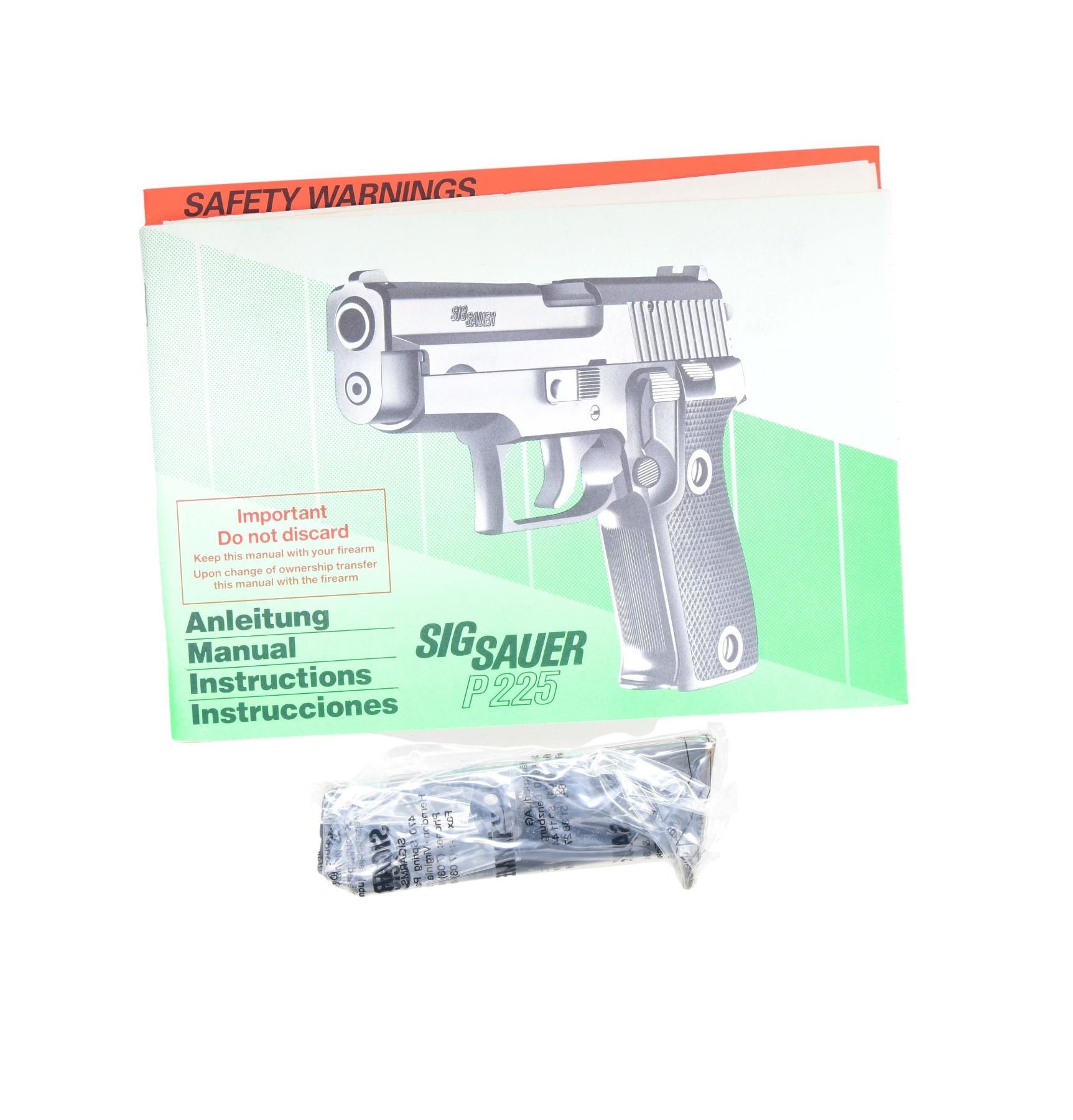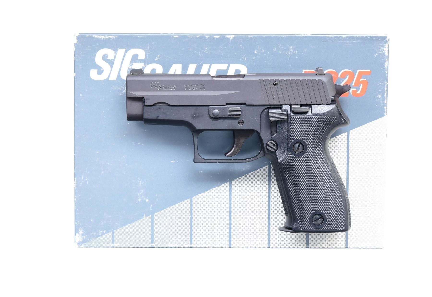 FACTORY BOX. CAL. 9X19. S# M577251 (KA = 1990). This Sig Sauer P225 features a 3.9-inch barrel with a black finish, standard fixed sights, and textured polymer grips. MAGS: 2-8 Rds. UNATTACHED ACCESSORIES: Factory box, manual. CONDITION: Overall near excellent with approximately 95% finish remaining on the slide and frame. Bore is bright and shiny. PROVENANCE: Lifelong Collection of Terrence McCarty. MODERN (24-208/MD). $400-600.