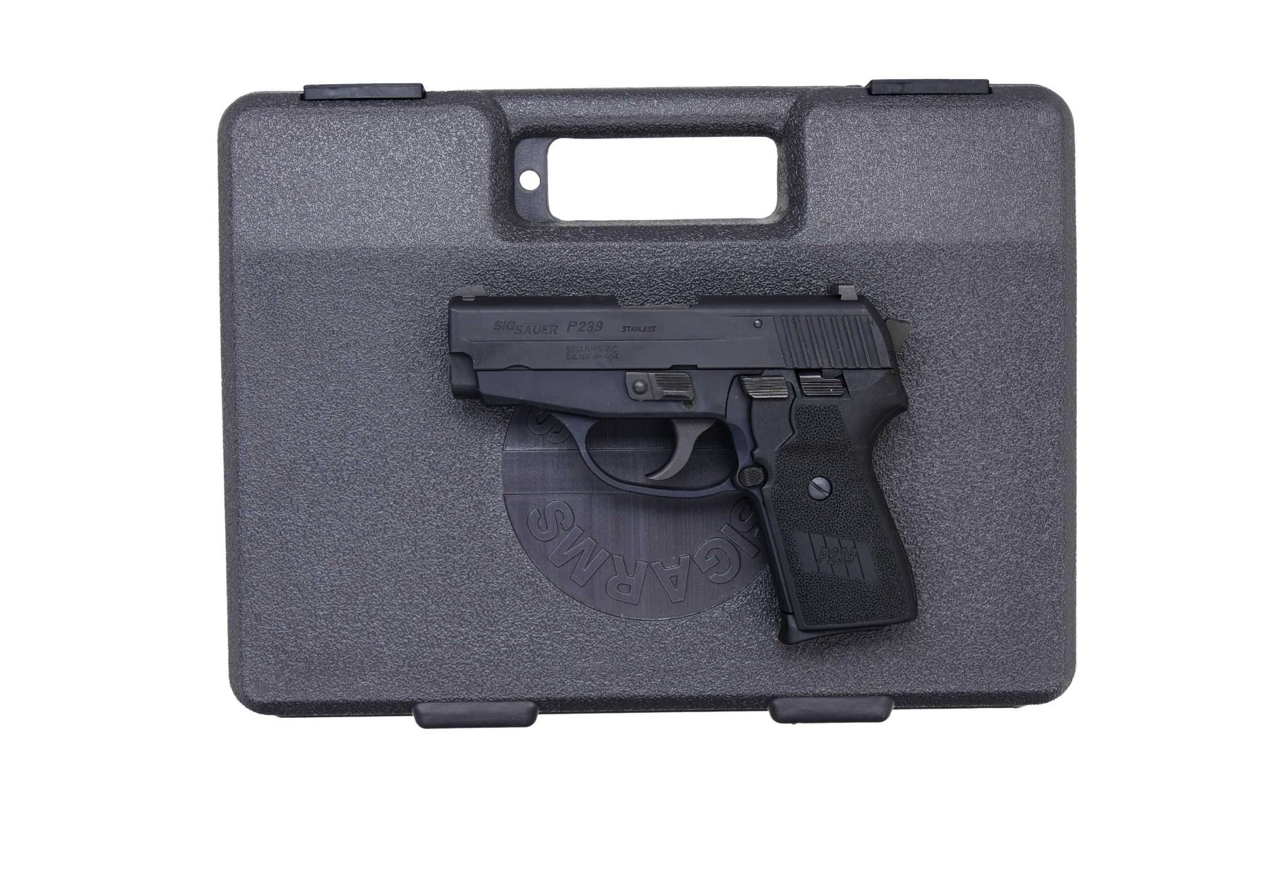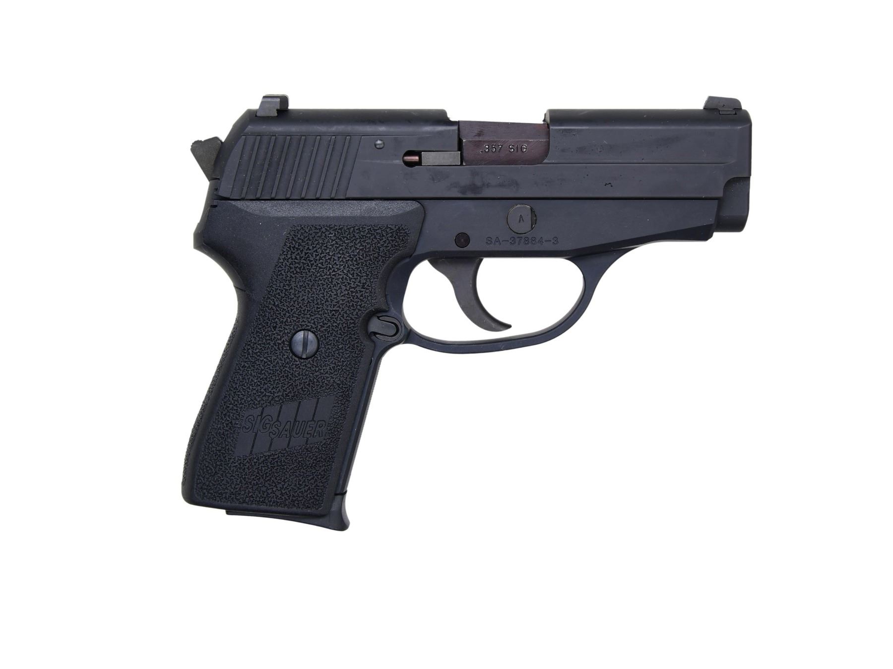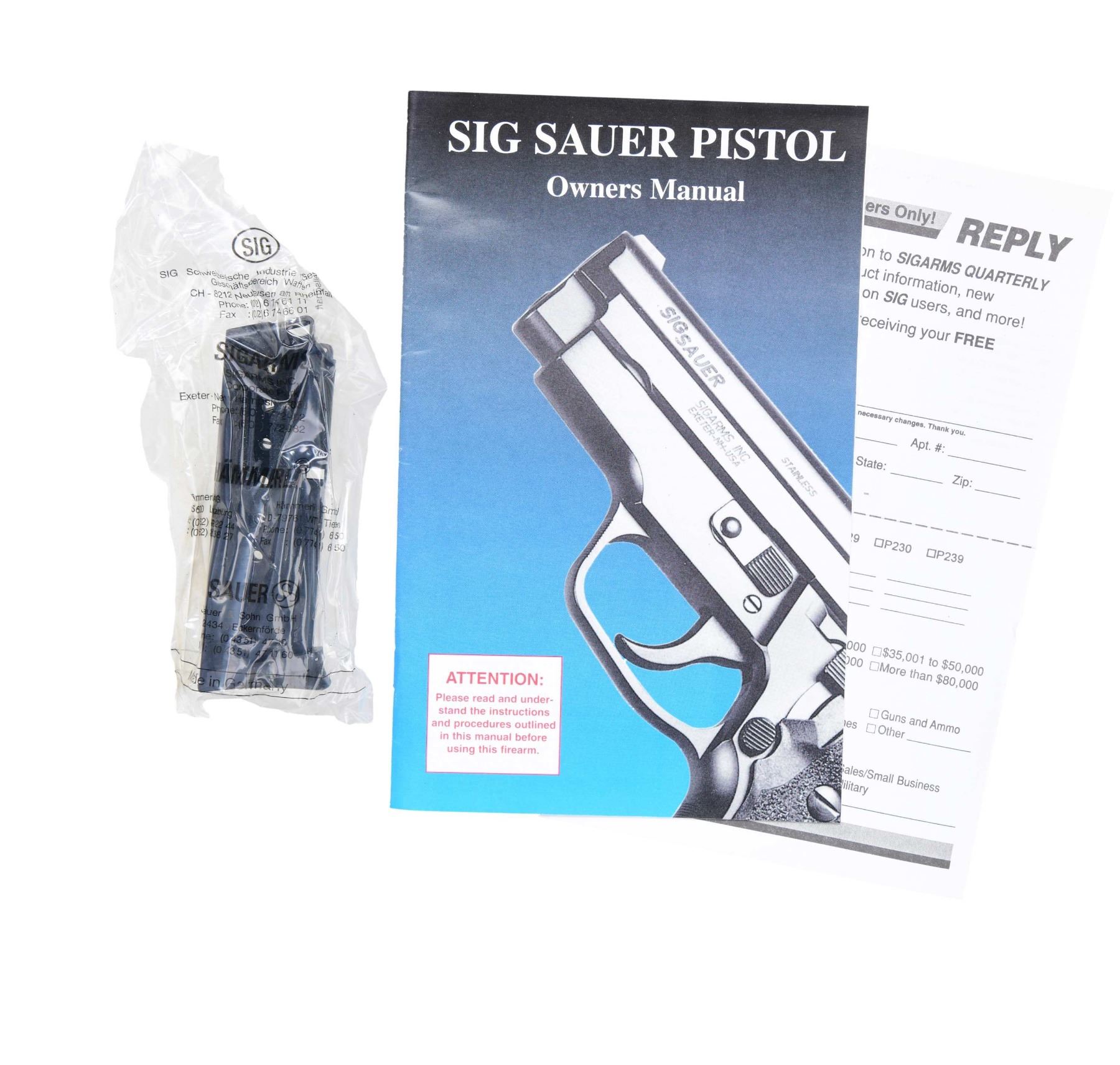 FACTORY BOX. Cal. 357 Sig. S# SA-37884-3. This Sig Sauer P239 features a black finish. The barrel length is 3.6 inches with a fixed front blade sight and a fixed rear sight. The frame includes an ambidextrous safety and the magazine release is located on the left side. The grips are textured polymer. MAGS: 2-7 Rds. UNATTACHED ACCESSORIES: Factory box and owner's manual. CONDITION: Overall condition is near excellent with approximately 95% of the original finish on the slide and 90% on the frame. The bore is bright with sharp rifling. PROVENANCE: Lifelong Collection of Terrence McCarty. MODERN (24-216/MD) $400-600.