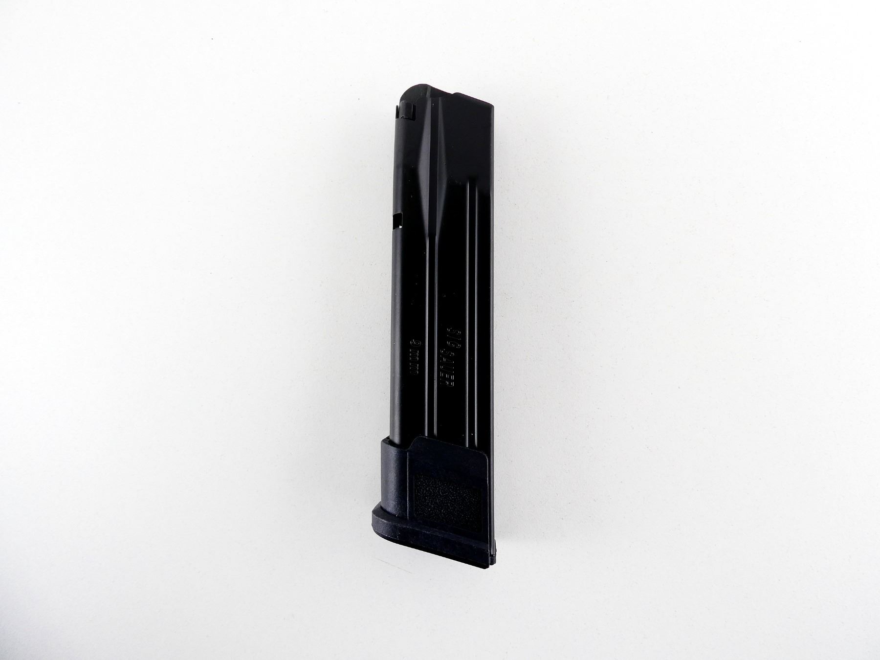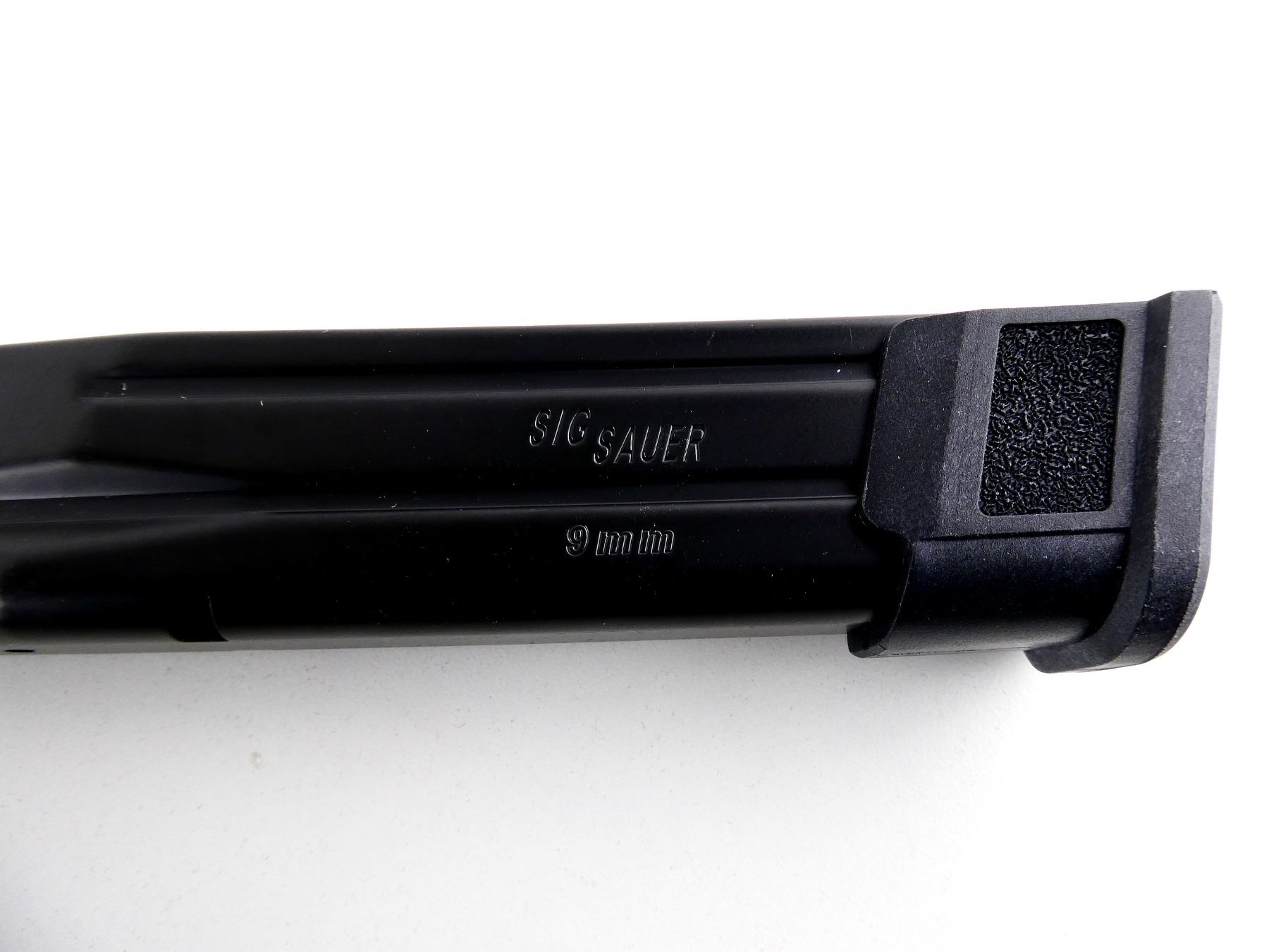 (1) 9MM, 10/21 ROUND PINNED MAG, BLUED STEEL, WITH EXTENDED BASEPLATE ATTACHED, MARKED: "SIG SAUER", "9MM", "MADE IN ITALY", ETC. SEE PHOTOS. PAL REQUIRED.