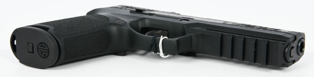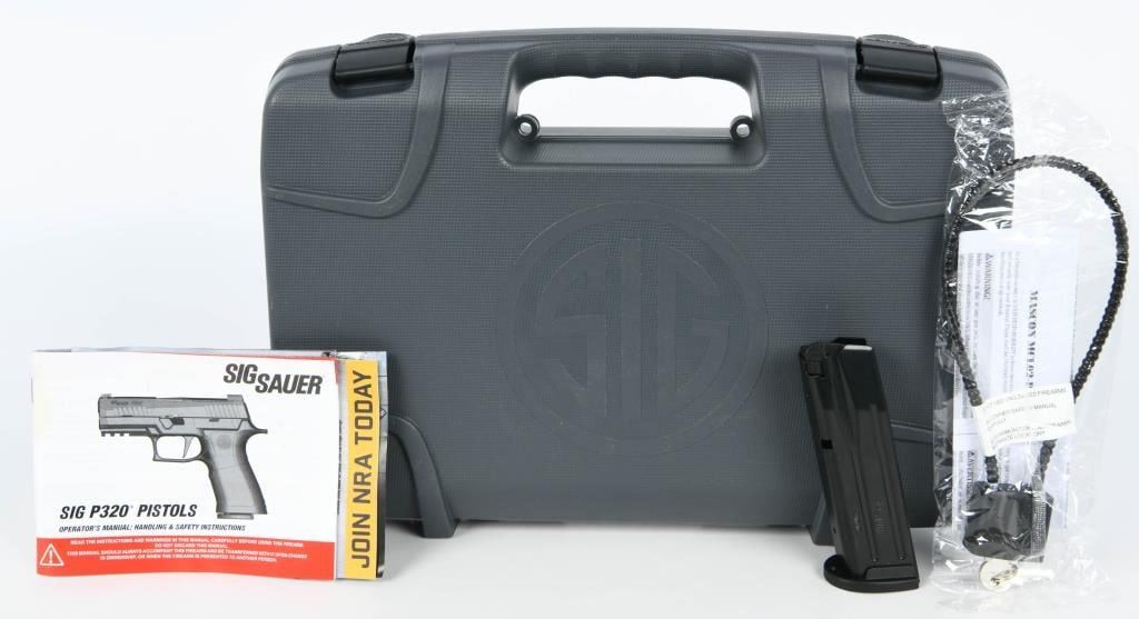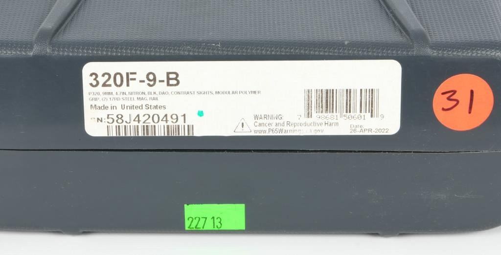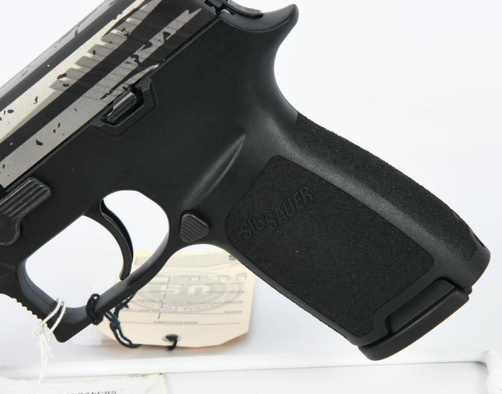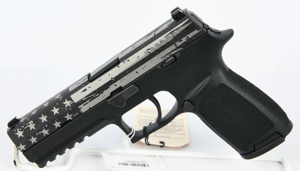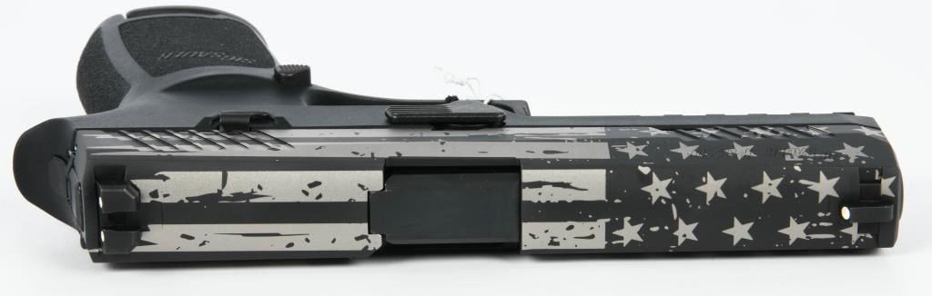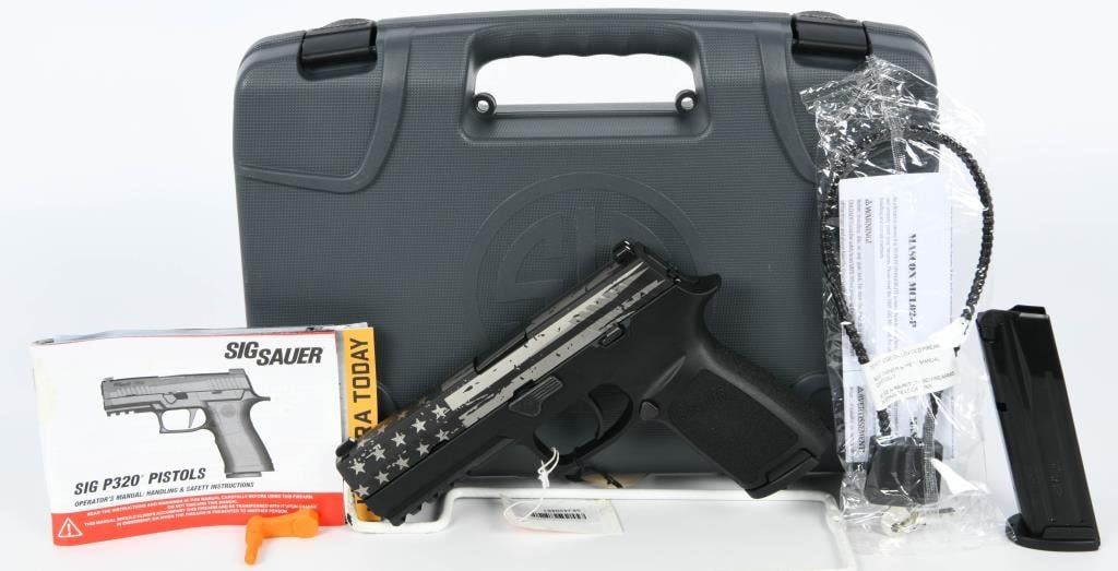 The SIG Sauer P320 Full Size Semi Auto Pistol in 9mm Luger is a remarkable firearm designed to meet the demands of shooters seeking reliability, durability, accuracy, and modularity. This particular example features a distinctive hydro-dipped silver stars and stripes finish, adding a unique aesthetic touch to its functionality. This pistol is brand new in the factory hard case. With a 4.7" barrel and a 17-round capacity, the P320 is well-suited for duty, defense, competition, and recreational shooting. SIG Sauer has redefined the concept of a striker-fired pistol, and the P320 showcases improved ergonomics and features, continuing the modularity options found in the P250. Specifications and Features: Model: SIG Sauer P320 Full Size G320F9B Caliber: 9mm Luger Barrel Length: 4.7" Capacity: 17 Rounds Frame: Polymer Sights: Contrast Sights Overall Length: 8" Height: 5.5" Weight: 29.4 oz Slide: Stainless Steel with Nitron Finish Trigger: Striker Fired Trigger Pull: 5.5-7.5 lbs Grip Module: Polymer The SIG Sauer P320 offers exceptional performance and adaptability, making it an excellent choice for those who demand the very best in a striker-fired pistol.