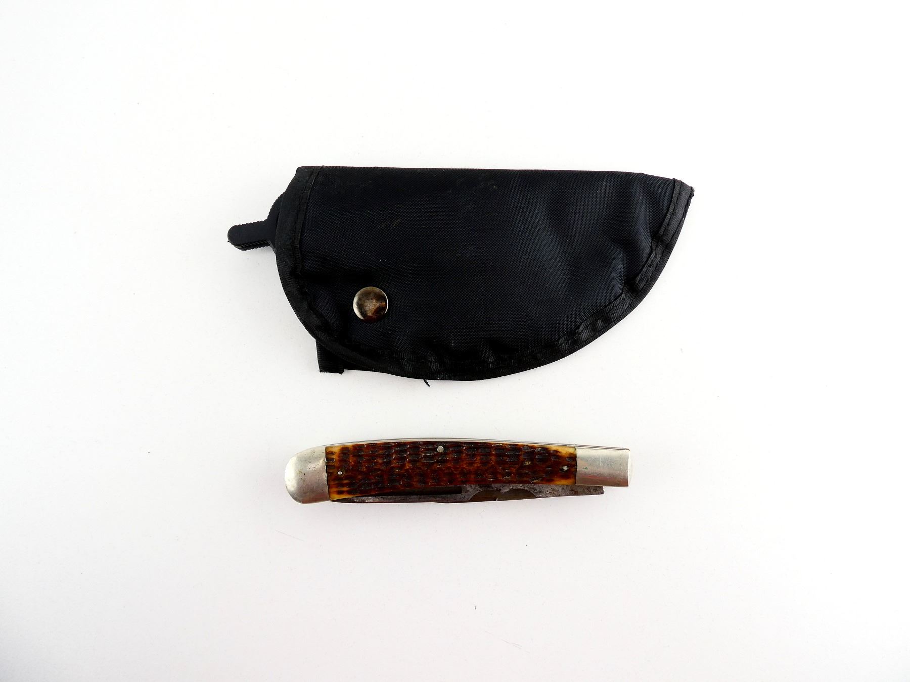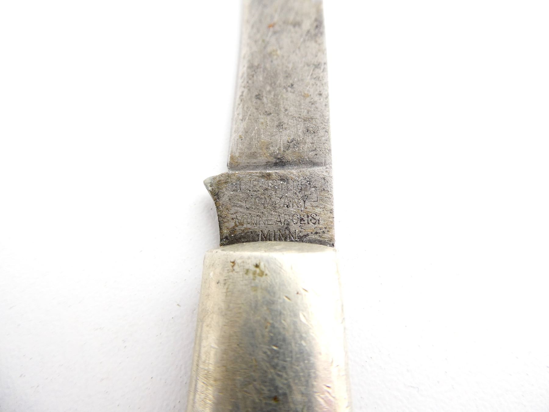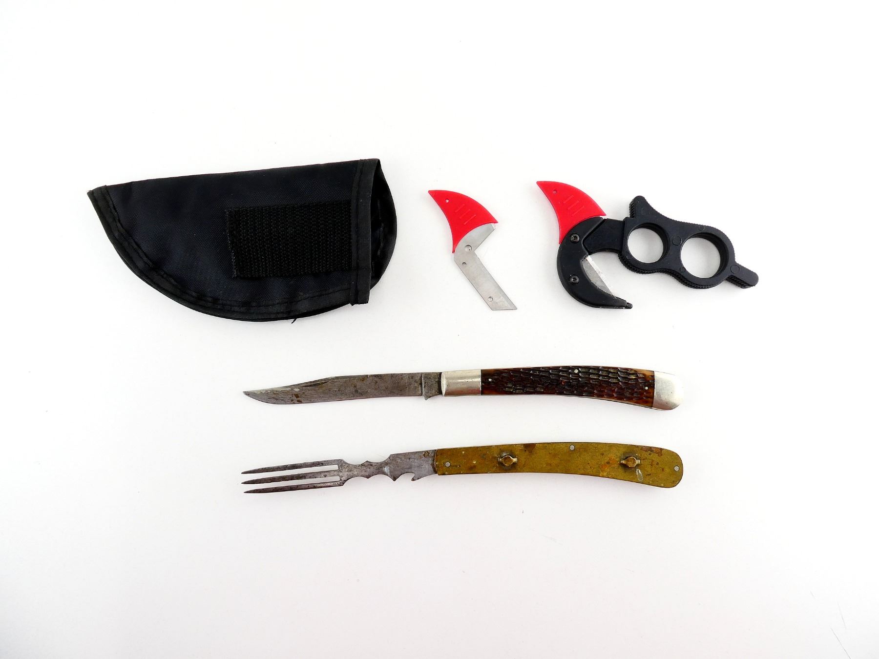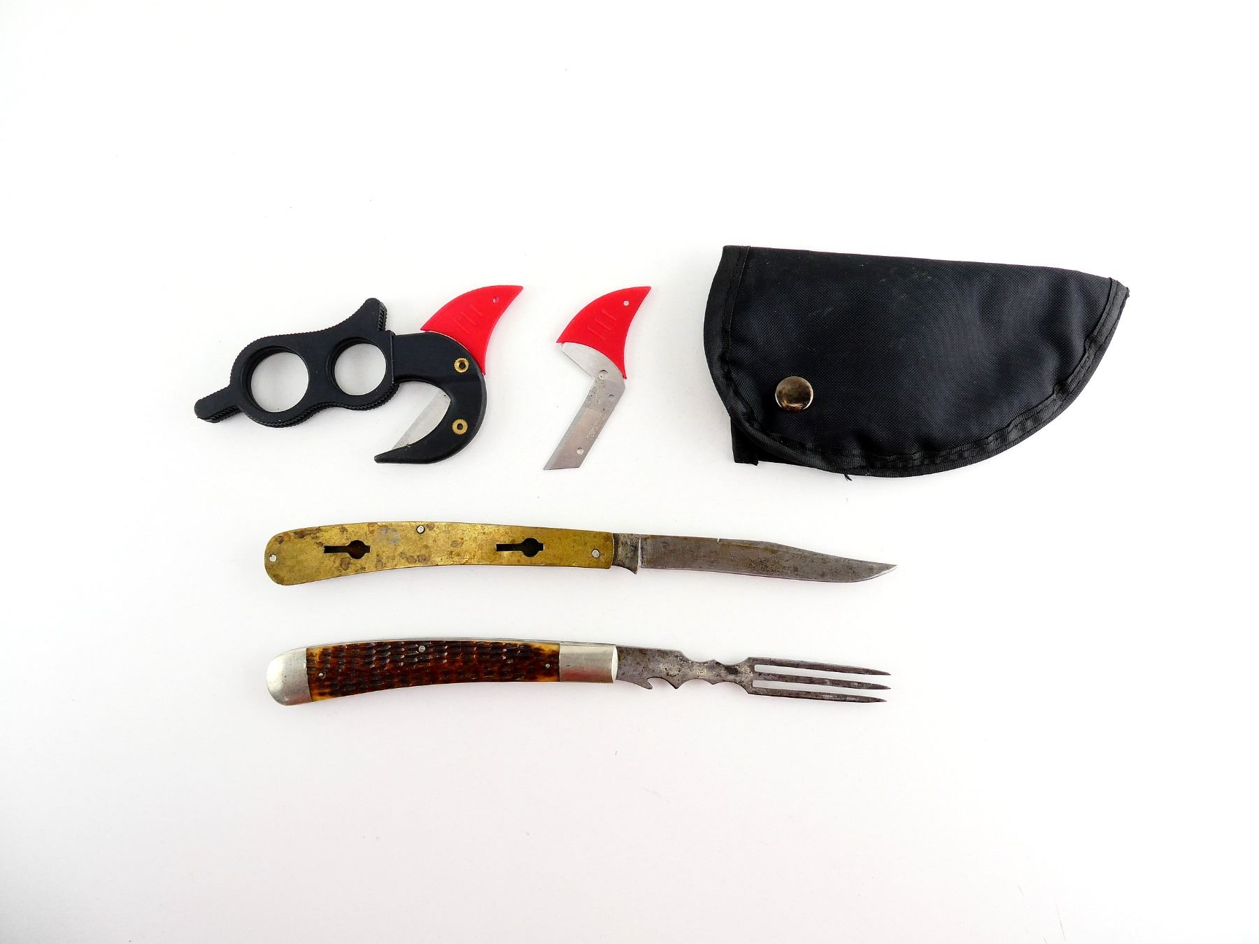 LOT INCLUDES; (1) UNKNOWN SKINNING KNIFE, STEEL BLADE, UNMARKED, POLYMER HANDLE, UNMARKED, WITH SPARE BLADE IN BLACK NYLON SHEATH, BLADE OVERALL LENGTH APPROX. 1 3/8", OVERALL LENGTH APPROX. 5 3/8", SHOWS WEAR & TEAR / USE MARKS & (1) FOLDING KNIFE / FORK COMBO, COMPONENTS CAN SEPARATE, STEEL BLADE, INDISTINCT MARKINGS, BONE HANDLE, UNMARKED, BLADE OVERALL LENGTH APPROX. 4.5", OVERALL LENGTH APPROX. 5 3/8", SHOWS WEAR & TEAR / USE MARKS. SEE PHOTOS.
