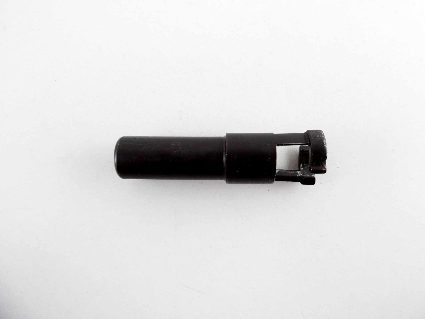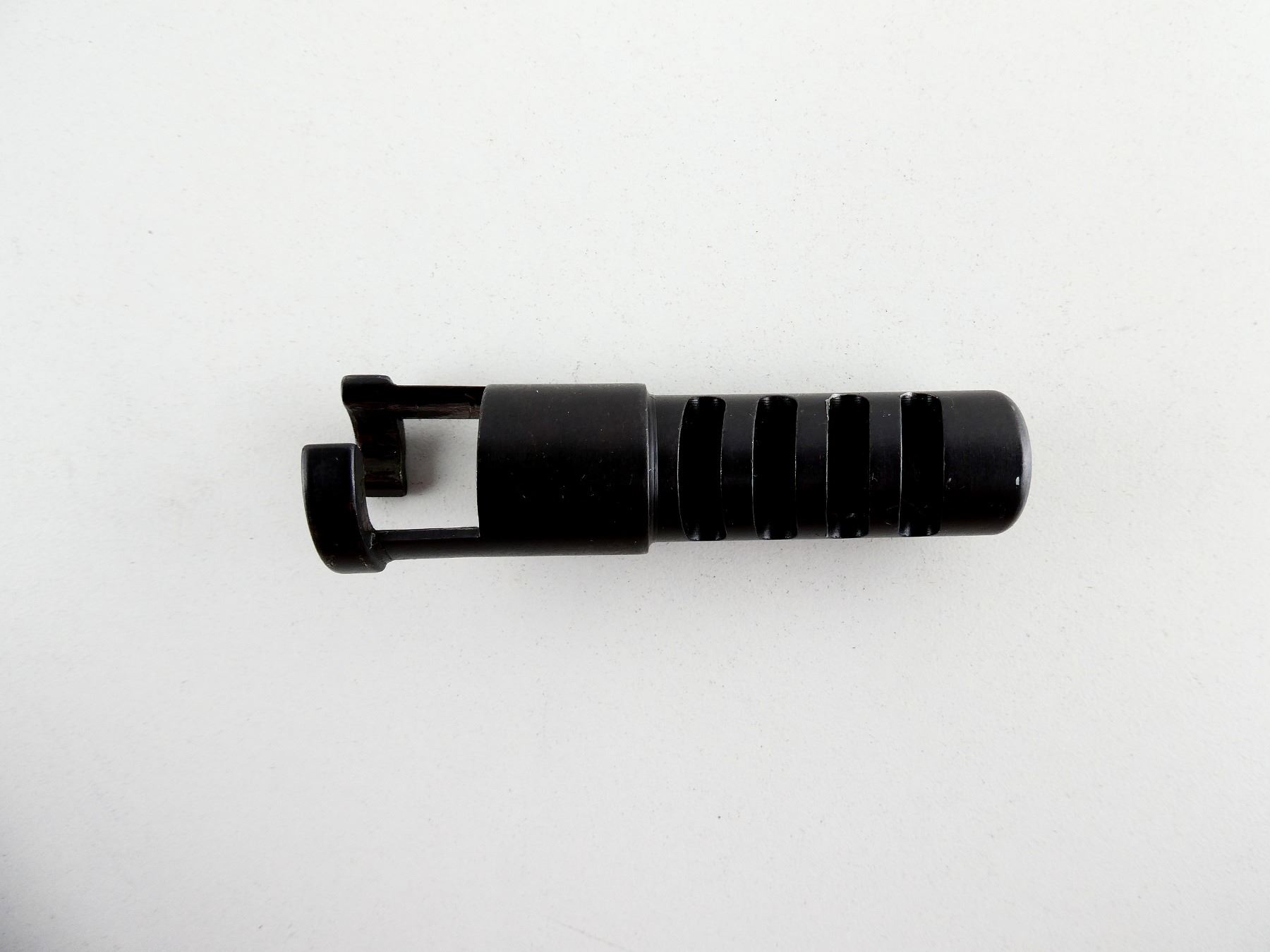 (1) MUZZLE BRAKE, BLUED STEEL CONSTRUCTION, CLAMPS-ON, NO VISIBLE MARKINGS, OVERALL LENGTH APPROX. 3 3/8". MAY REQUIRE FITTING. SEE PHOTOS.