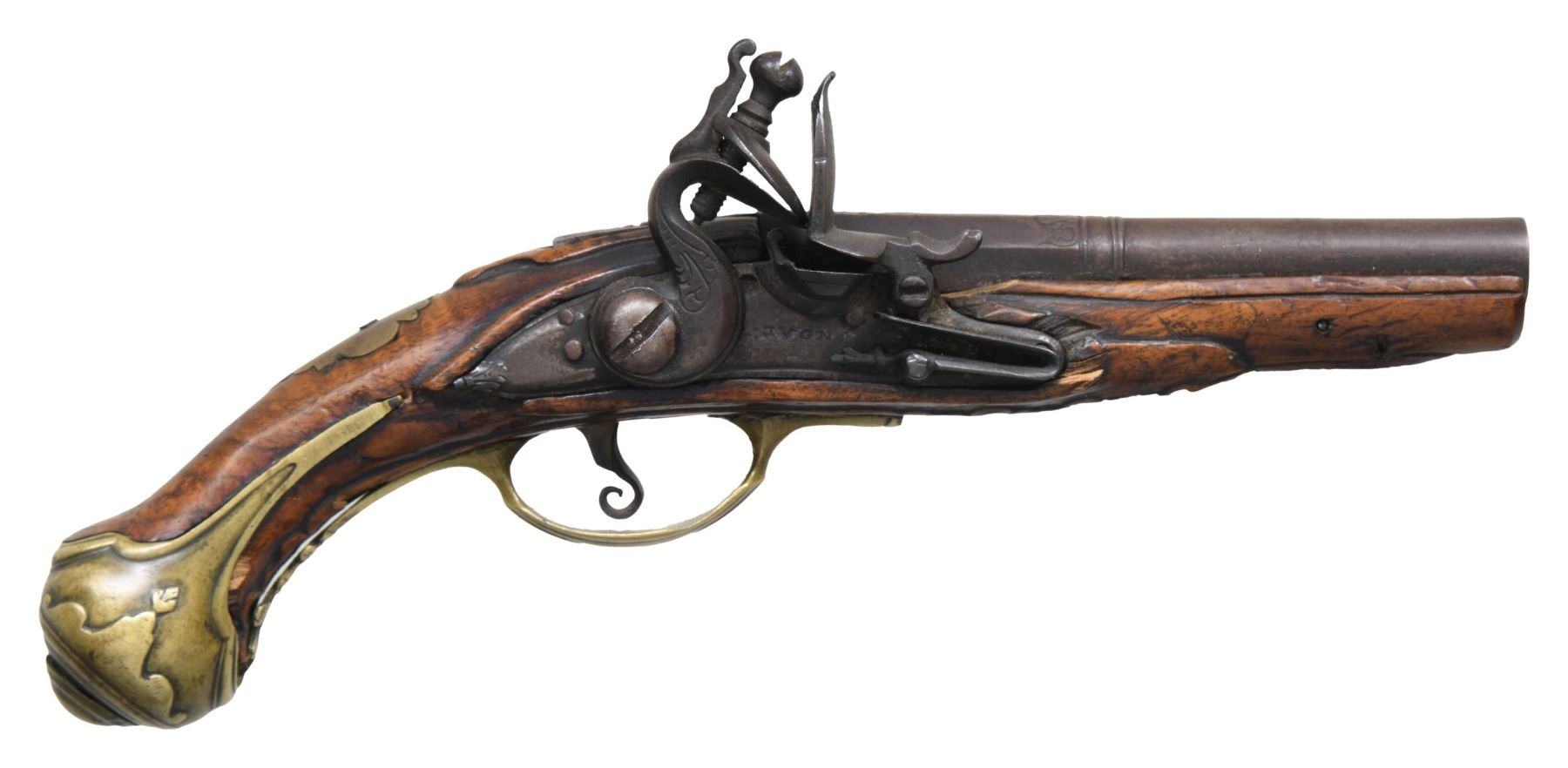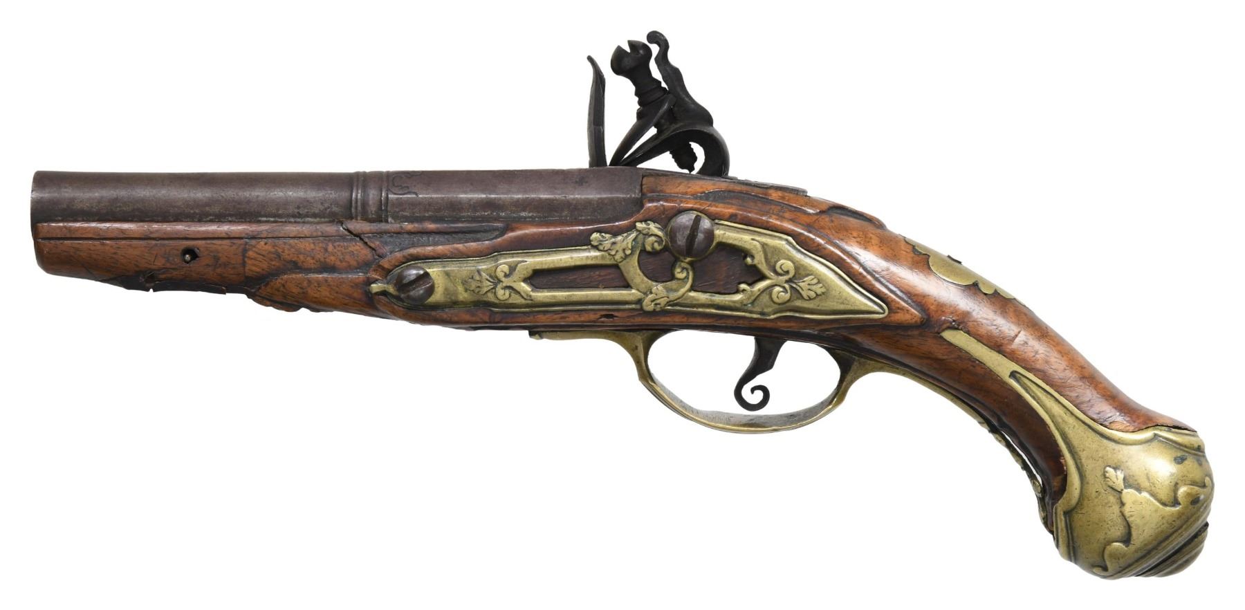 Cal. 45. NSN. Bbl. 4 1/2". Flintlock pistol produced by an unknown mfg. Lockplate appears to be marked "L : IVGNO". The top flat of the faceted breech is stamped with a fleur-de-lis proof, above a boxed proof of what appears to be a horse. Plain wood stock, with brass trigger guard, pommel, wrist escutcheon, and sideplate. Ramrod and ramrod ferrule are absent. CONDITION: metal components retain varying shades of gray patina, with a dull brown patina present on the bbl. Brass components exhibit a mellow brown patina. Stock shows scattered marks and impressions from handling and storage, scattered chipping, as well as notable losses to the ramrod channel. (01-27152/MLW). ANTIQUE. $200-300.