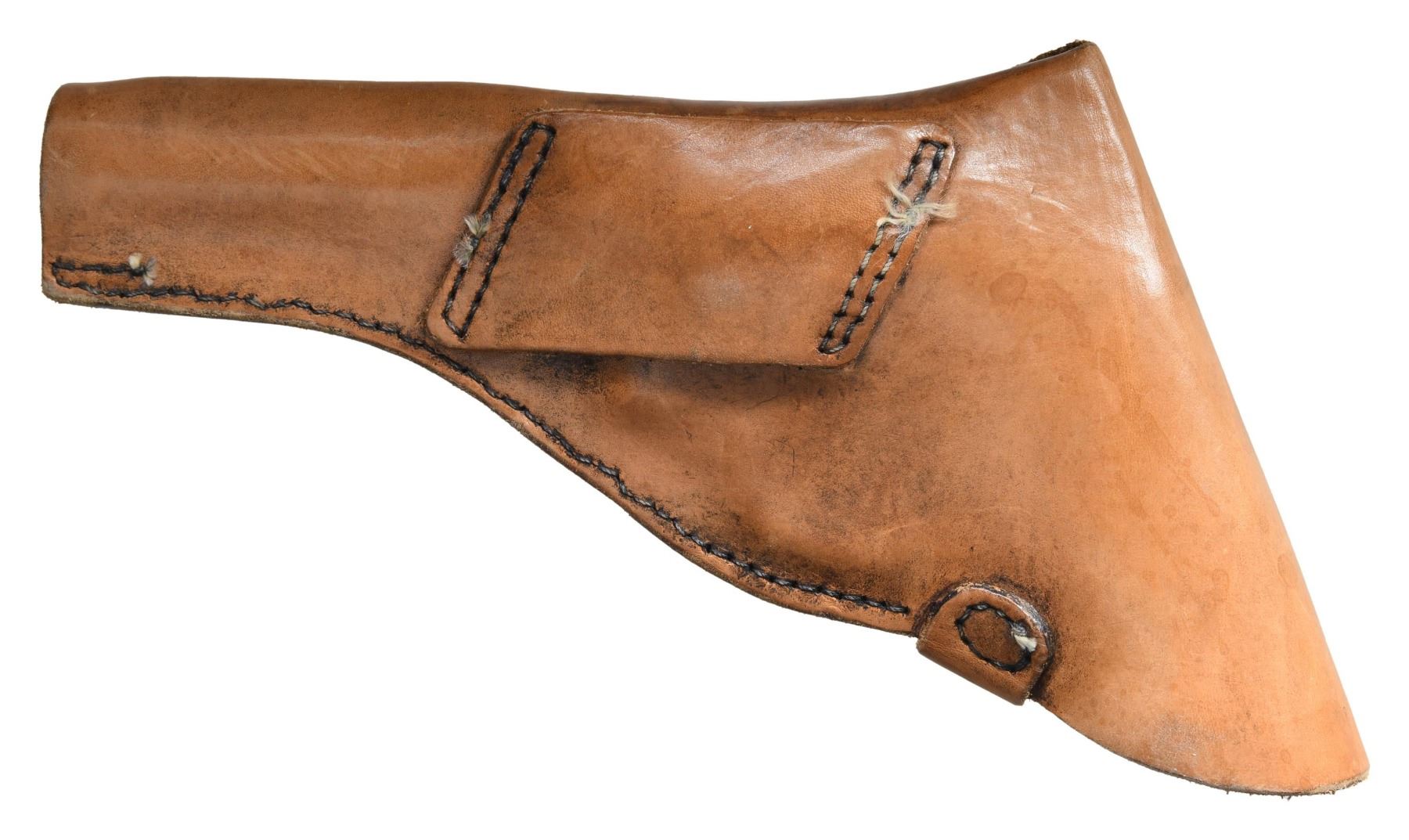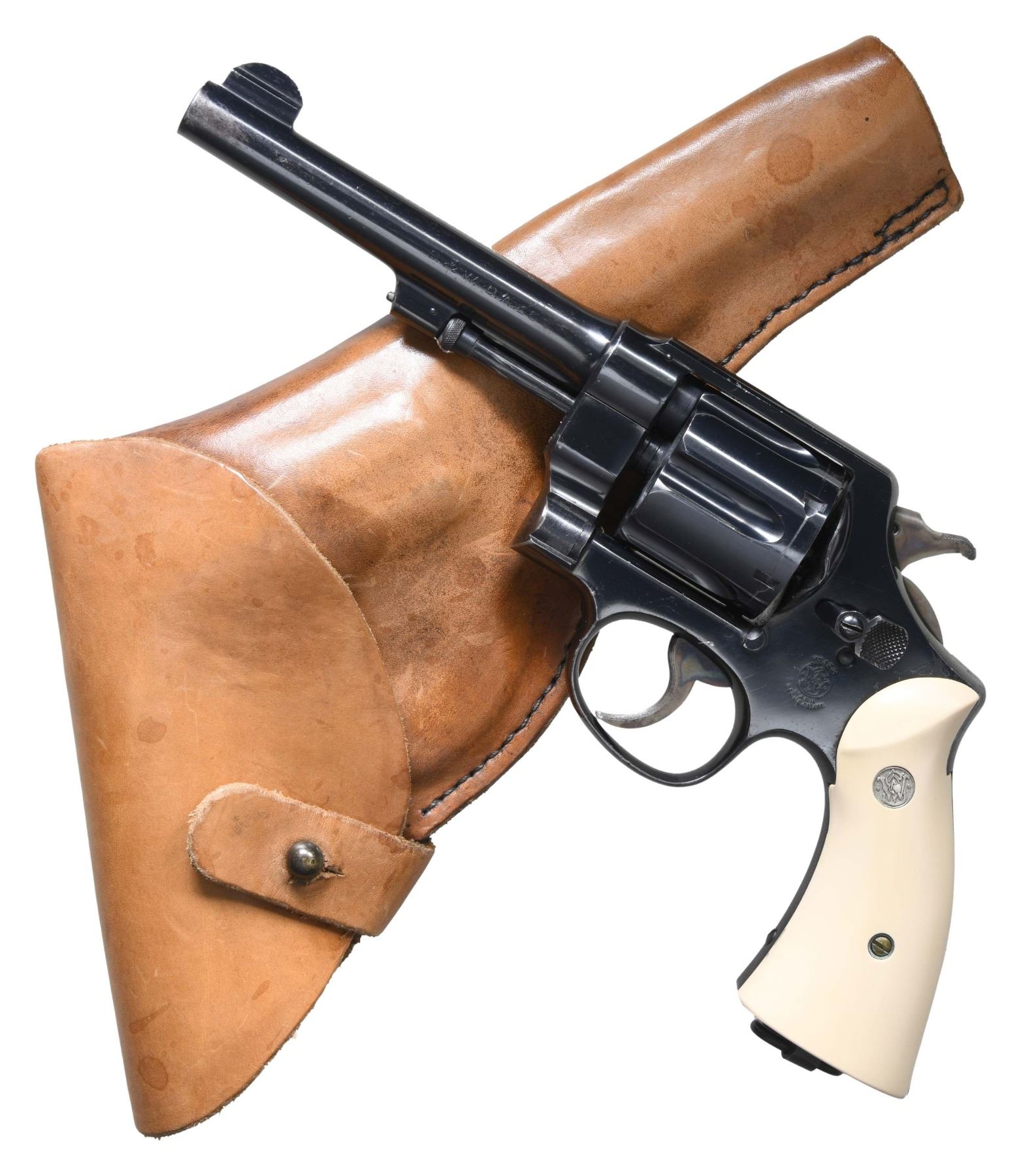 . Cal. 45 ACP. S# 182128. Bbl. 5 1/2". Round blade front sight. Fixed rear sight. Matching numbers on grip frame, bbl., cyl. & extractor. Brazilian contract 1917 S&W revolver with 1937 date & Brazilian crest on right rear of frame. Backstrap marked "133". Blued finish with case colored hammer & trigger. Replacement white color grips with silver S&W medallions. Navy Arms import marking under grips. Lanyard ring present on bottom of butt. UNATTACHED ACCESSORIES: right handed leather holster & factory letter. Letter states that revolver was shipped to the Brazilian Ministry of War in 1938. CONDITION: left grip panel has repaired crack across it through screw hole, grips otherwise show some light black staining & handling wear. Trigger & hammer retain most of their case colors with some light oxidation, operational wear & fading to gray. Balance of metal retains 75% factory blue with some pitting under grips, a few small dings, scattered edge wear, fading to gray & light oxidation. Action functions properly when hand cycled. Very good bright bore. PROVENANCE: From the Estate of Jon Thomas, Gunsport, LTD. (25-1083/MJC). CURIO. $600-1000.