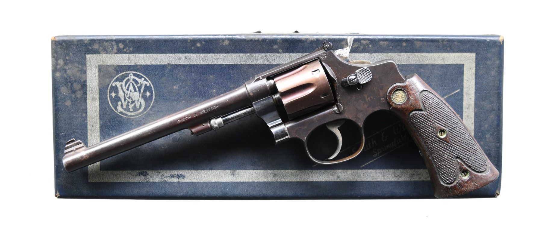 Cal. 22 LR. S# 238613. Bbl. 6". Marble 35A front sight. Adjustable square notch rear sight. Matching numbers on frame, bbl., cyl. & extractor. Old reblue finish with case colored trigger. Modified hammer. Checkered walnut diamond center grips with gold S&W medallions. No discernable number inside grips & bottom of grips has added hole. UNATTACHED ACCESSORIES: later replacement S&W 14-2 box in fair condition with overall staining. CONDITION: grips show scattered dings, dents, checkering & handling wear. Hammer shows scattered oxidation, dings & traces of case colors. Trigger retains strong traces of case colors with overall fading to gray & some oxidation staining. Cyl. has a plum appearance with light pitting, dings & edge wear. Upper sideplate screw is missing. Balance of metal retains 40% old reblue with overall fading to gray, a few small patches of light pitting,, scattered oxidation, dings & scratches. Action pushes off when hand cycled, as trigger has been modified to unsafe hair pull. Extractor shaft pin missing also causing improper extractor function. Pitted bore. (25-2647/MJC). CURIO. $300-500.