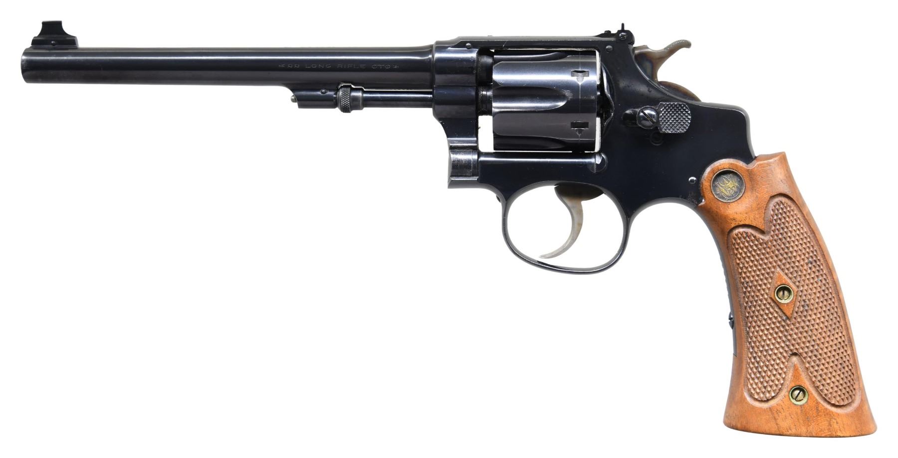 Cal. 22 LR. S# 208392. Bbl. 6" pinned. Bead front sight. Adjustable rear sight. Matching numbers on frame, bbl., cyl., extractor & stencil inside of right grip panel. 22/32 Hand Ejector revolver. Blued finish with case colored hammer & trigger. Checkered walnut grips with gold S&W medallions & bottom of left panel numbered "2365". CONDITION: grips show some scattered light scratches & handling marks. Hammer & trigger retain most of their case colors with some minor oxidation specks & light operational wear. Balance of metal retains 93% factory quality restored blue with a tiny spot of light pitting on cyl., a couple small spots of oxidation, some edge & operational wear. Hammer will push off in single action when hand cycled & will require attention to fix. Bright very good bore with strong rifling. (25-2078/MJC). CURIO. $500-800.
