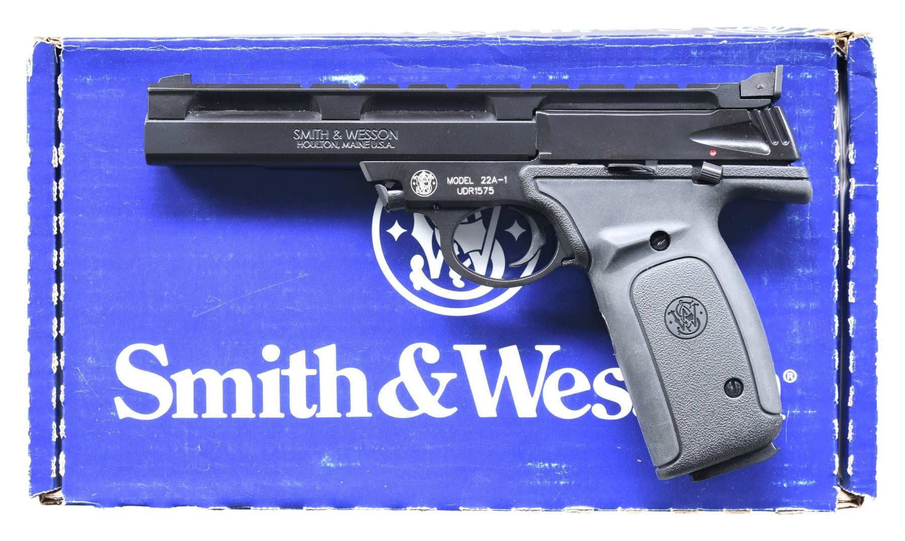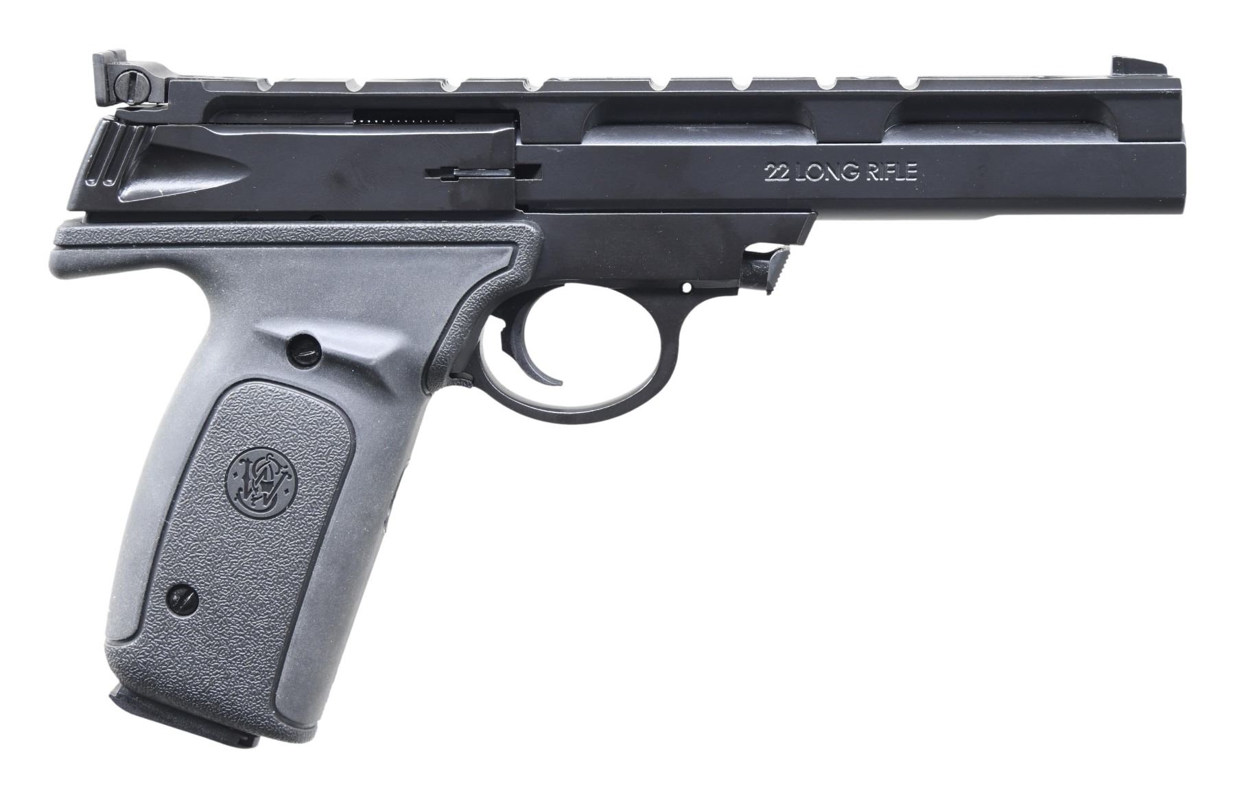 Cal. 22 LR. S# UDR1575. Bbl. 5 1/2". Blade front sight. Adjustable square notch rear sight. Full length Weaver rail present for further sight mounting. Matte black finish. Rubber grips with S&W monograms. MAGS: 2-10 rd. UNATTACHED ACCESSORIES: matching numbered factory box with trigger lock & manual. CONDITION: grips & metal show light handling wear. Action functions properly when hand cycled. Bright near excellent bore. (25-3390/MJC). MODERN. $200-300.