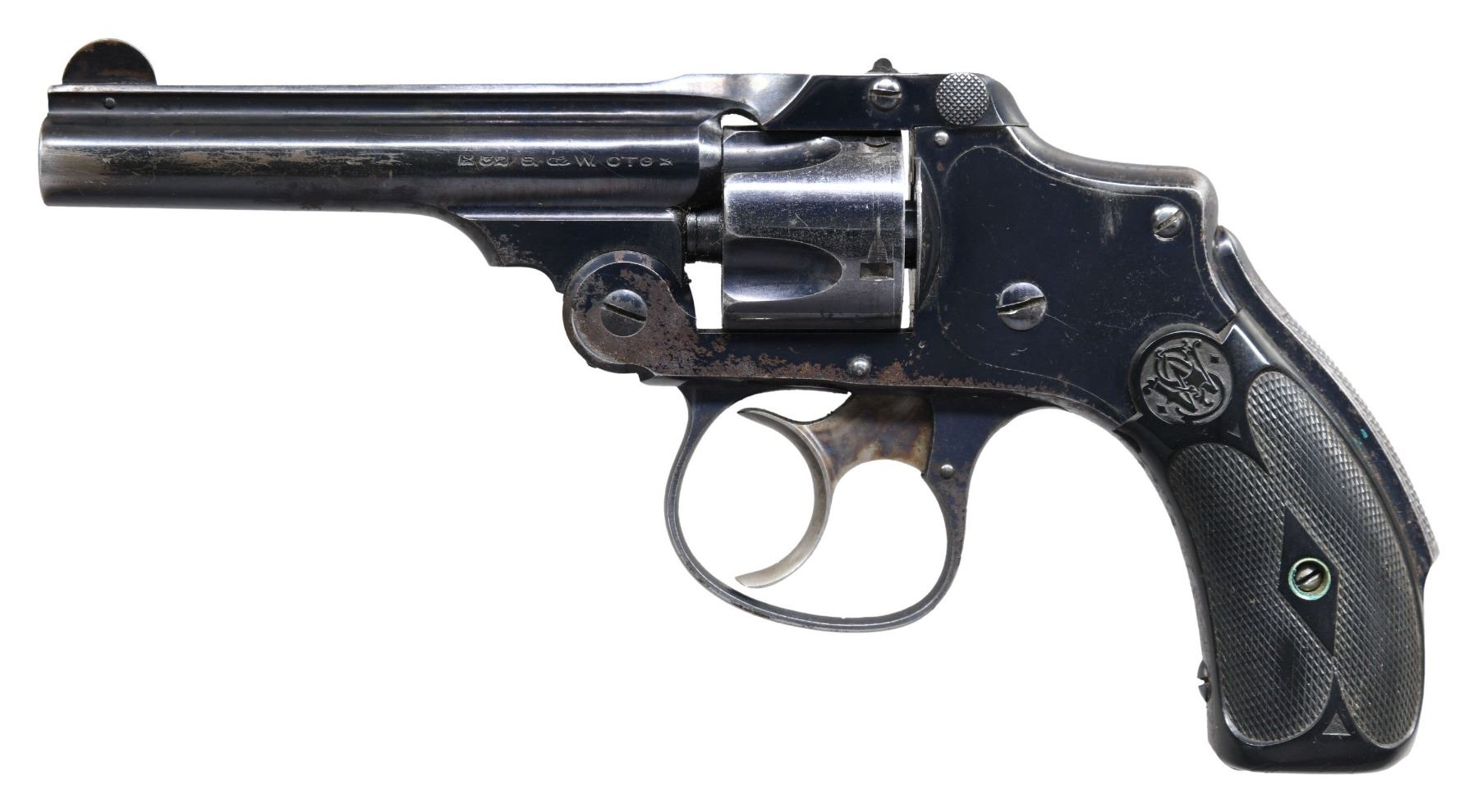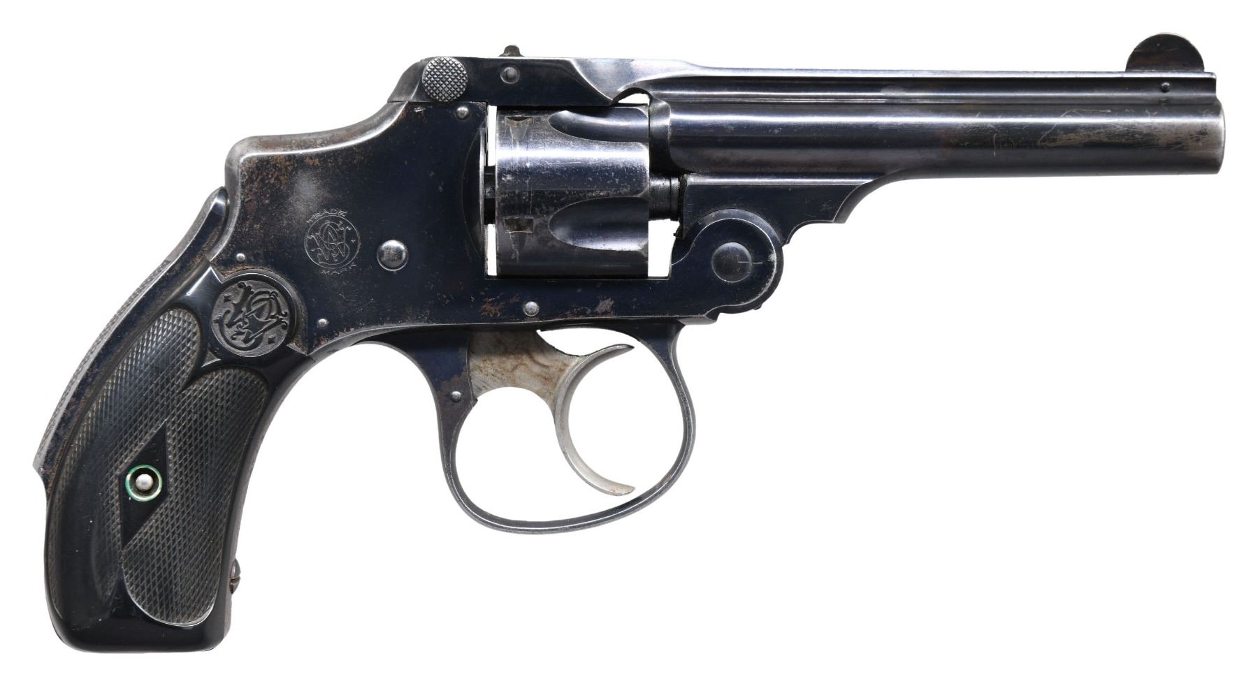 Cal. 32 S&W. S# 162038. Bbl. 3 1/2". Round blade front sight. U-notch rear sight. Matching numbers on grip frame, cyl., bbl. latch & right grip panel. 2nd Model 32 Safety Hammerless revolver. Blued finish with case colored trigger. Checkered hard rubber grips with S&W monograms. CONDITION: grips show heavy checkering wear & scattered handling marks. Trigger retains much of its case colors with some light oxidation & scattered fading to gray. Balance of metal retains 60% original blue with some oxidation under grips, further scattered oxidation, fading to gray, flaking & edge wear. Action appears to function properly when hand cycled. Bore is mostly bright with some light pitting & oxidation but good rifling. (25-1579/MJC). CURIO. $250-350.