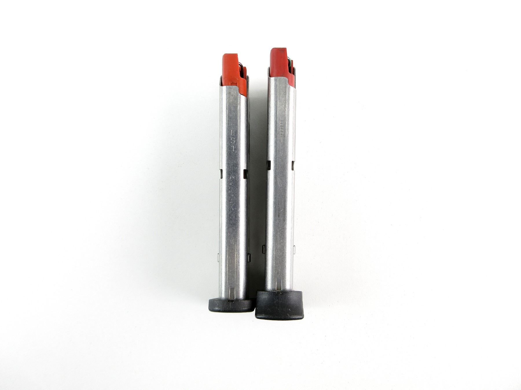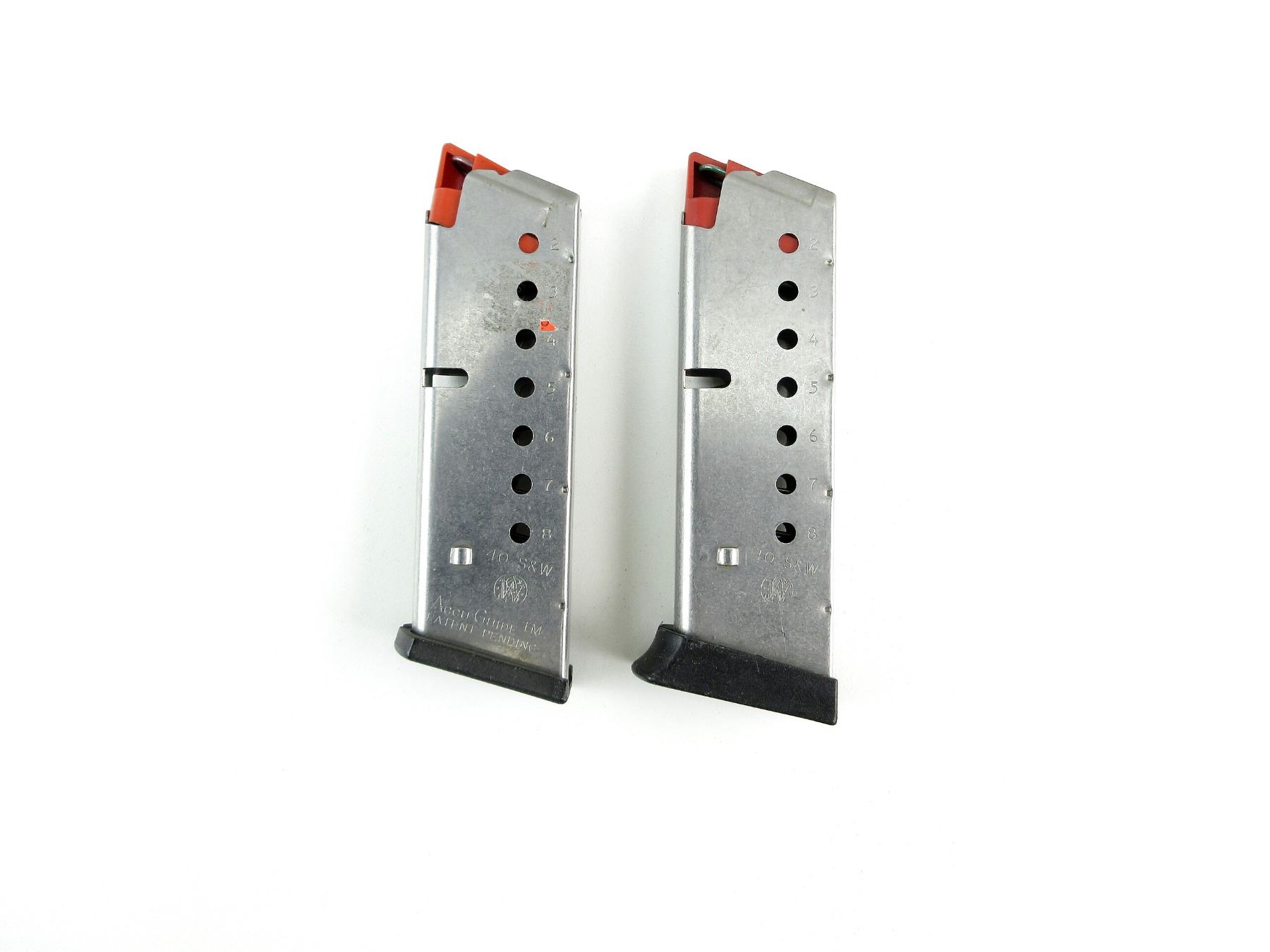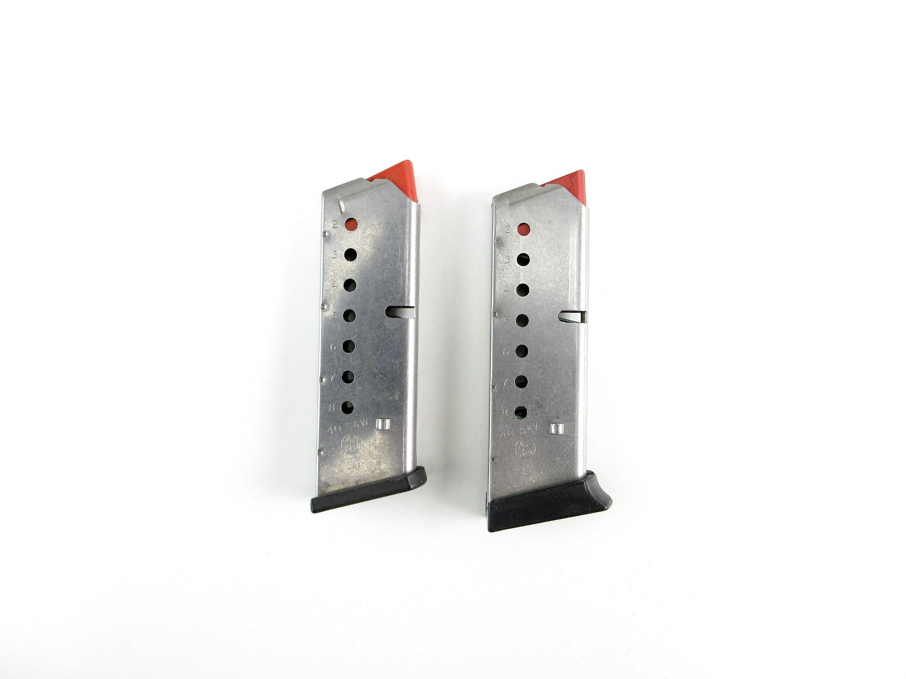 LOT INCLUDES; (2) .40 S&W MAGS, 8 RNDS, STAINLESS STEEL CONSTRUCTION, RED POLYMER FOLLOWER, MARKED: "40 S&W", ETC., BLACK POLYMER BASE. SEE PHOTOS. PAL REQUIRED.