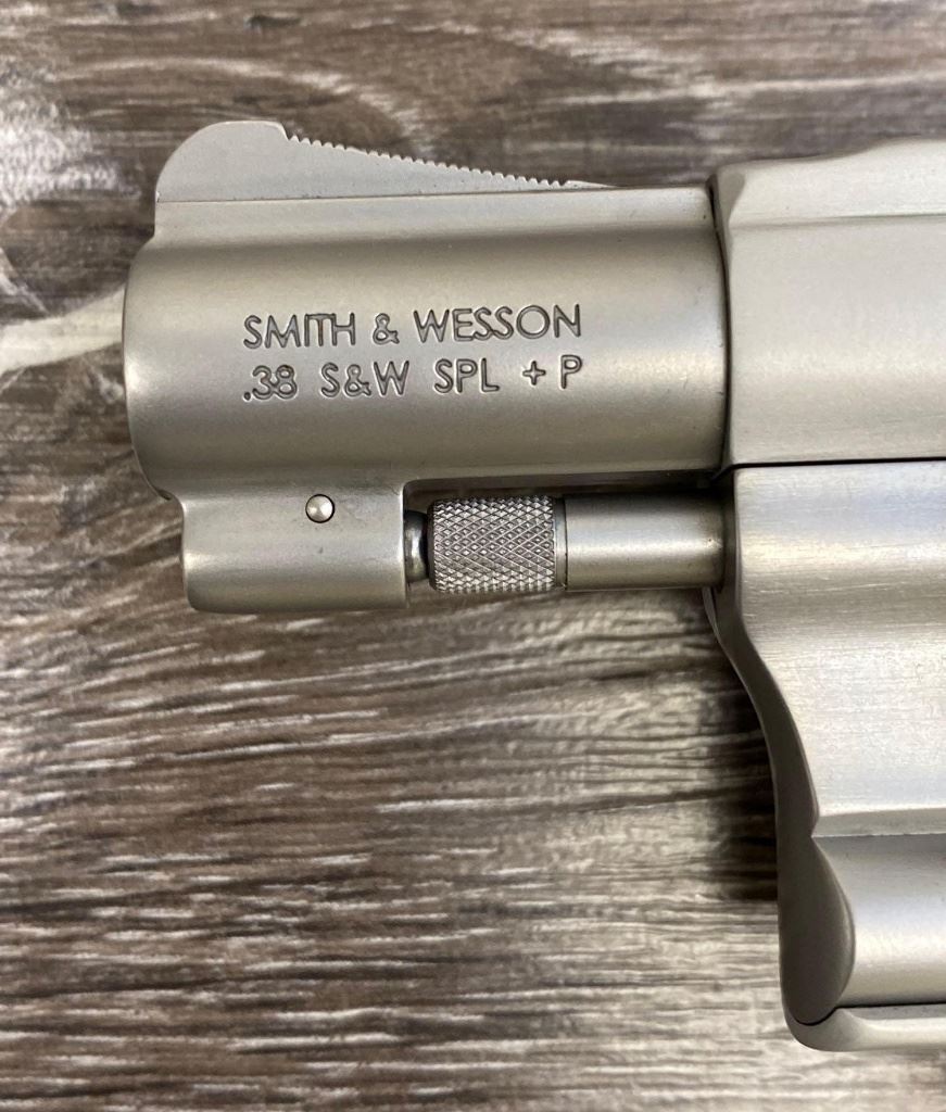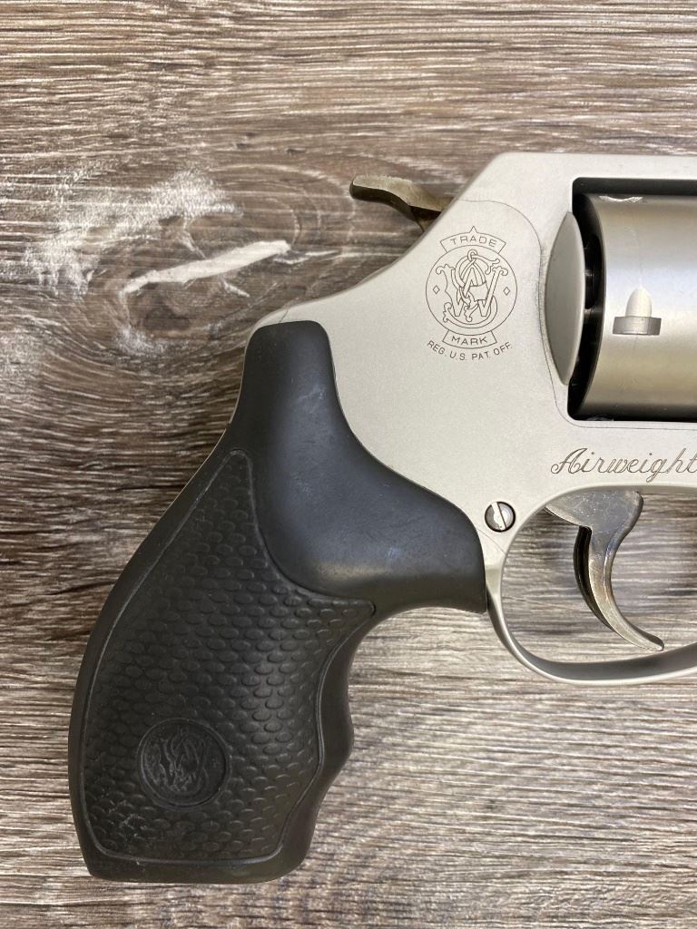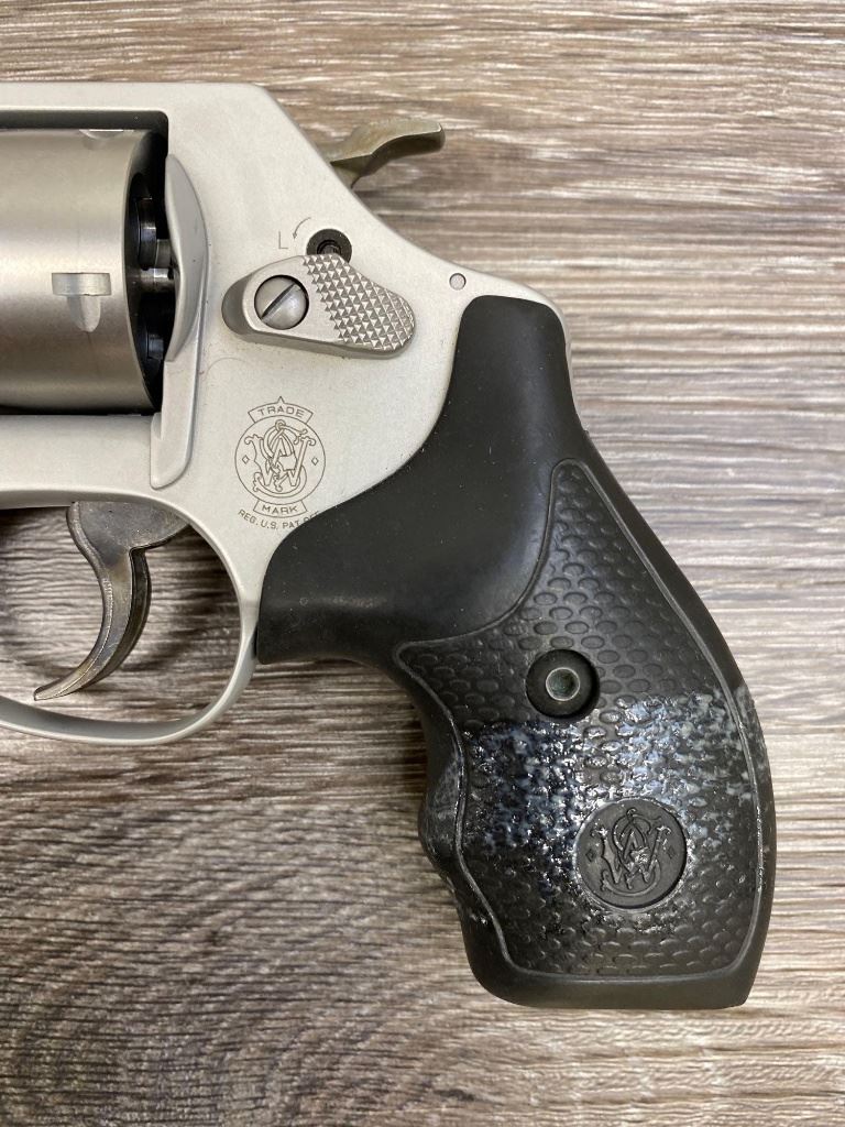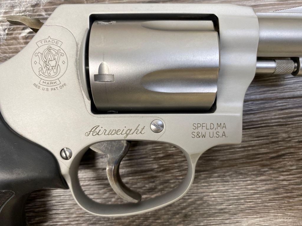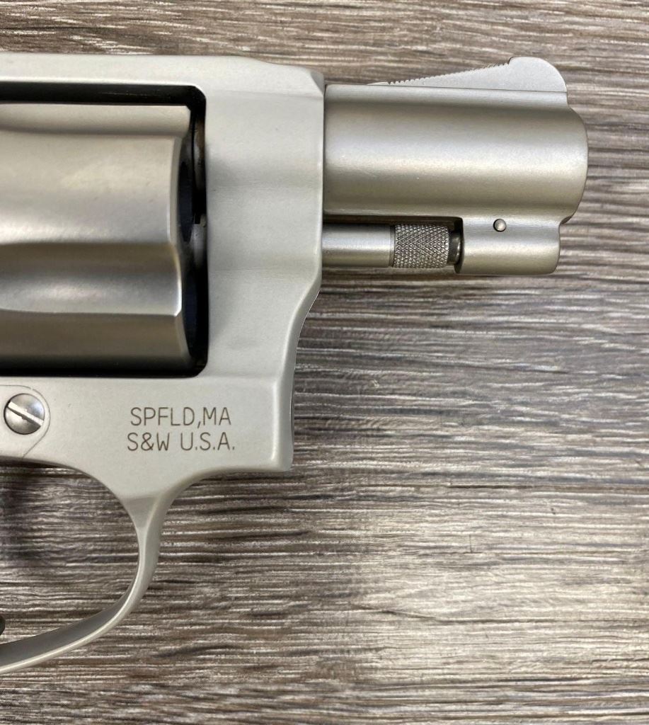 Two-tone finish with matte aluminum alloy frame, stainless steel barrel and 5-shot cylinder, black rubber checkered grips. Revolver is in as-new condition showing unmarked factory finishes, sharp lettering, case colors to hammer and trigger, grips with sharp S&W logos. Action is crisp, lockup is tight, bright bore shows sharp rifling.(Modern/PPT)