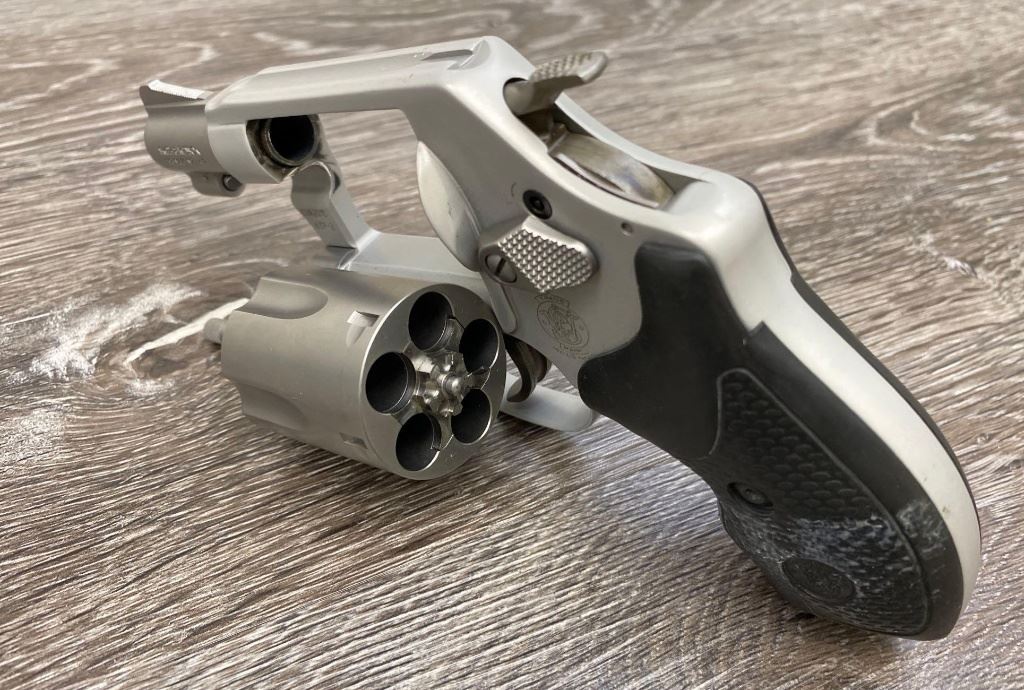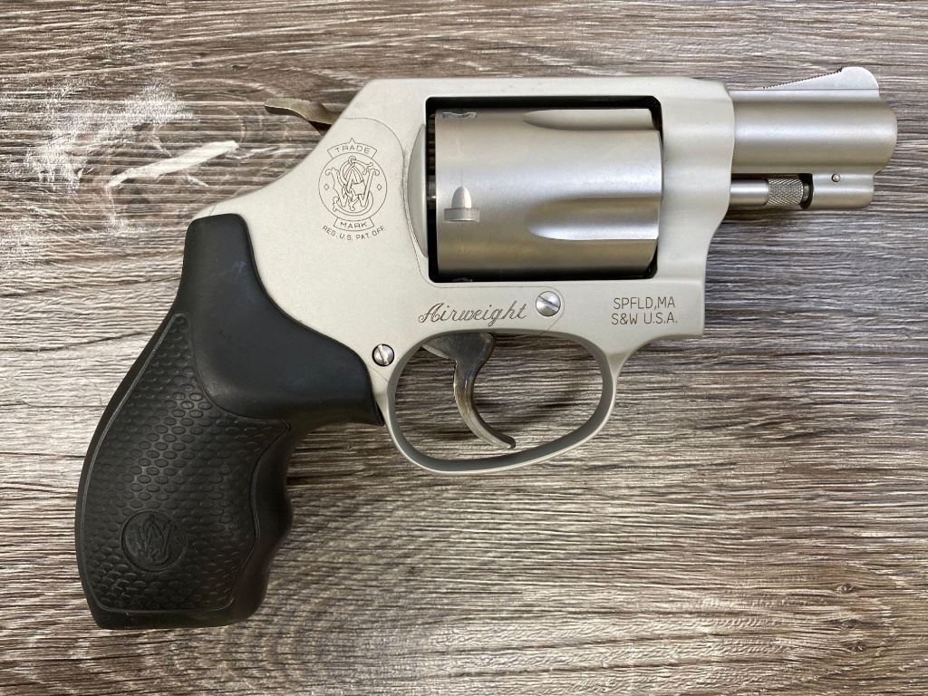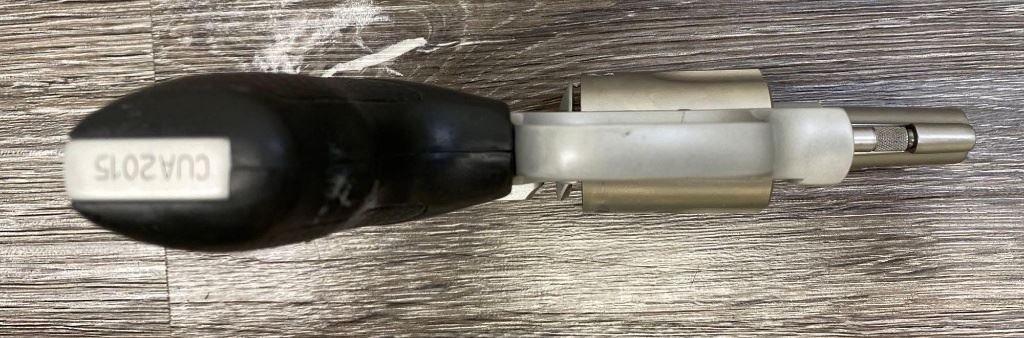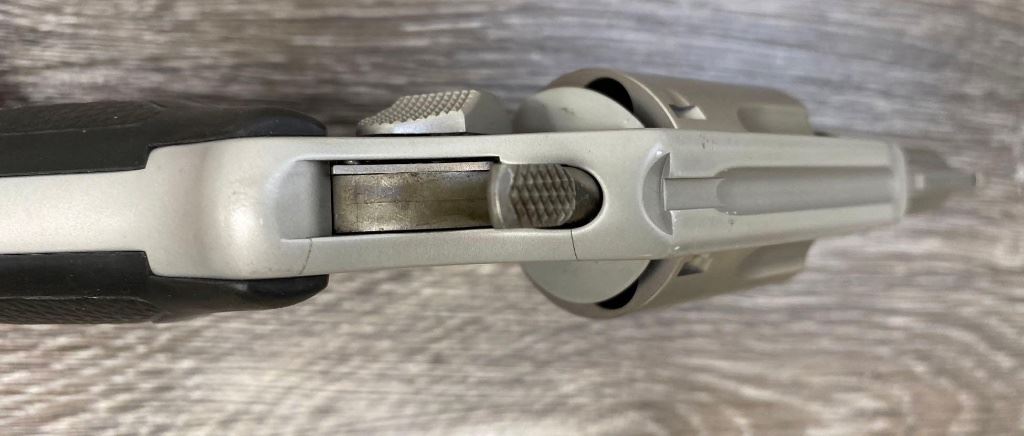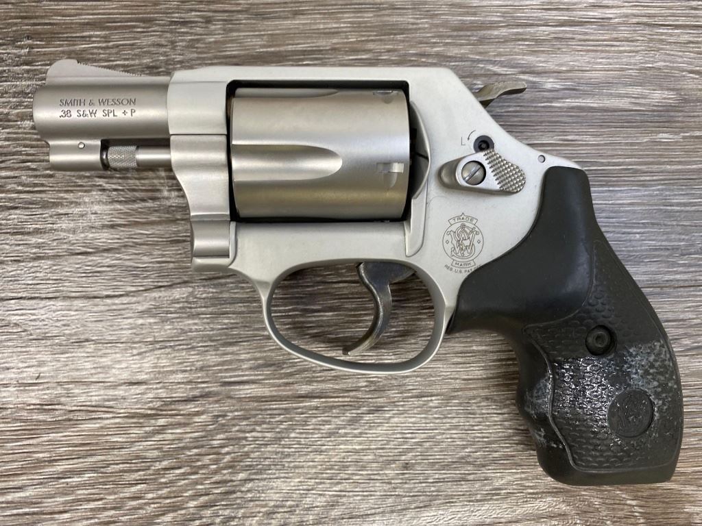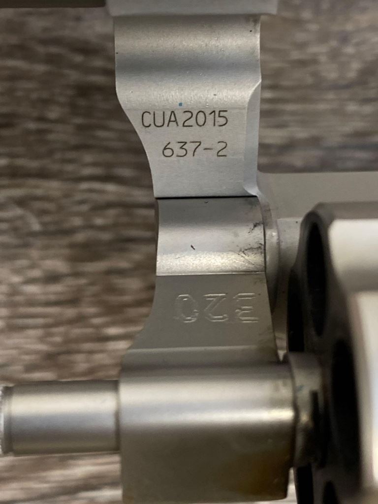 Two-tone finish with matte aluminum alloy frame, stainless steel barrel and 5-shot cylinder, black rubber checkered grips. Revolver is in as-new condition showing unmarked factory finishes, sharp lettering, case colors to hammer and trigger, grips with sharp S&W logos. Action is crisp, lockup is tight, bright bore shows sharp rifling.(Modern/PPT)