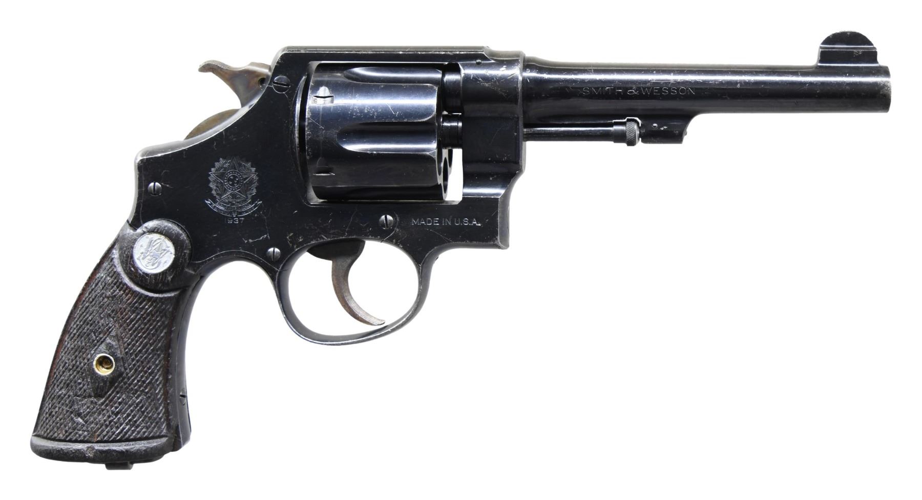 Cal. 45 ACP. S# 193414. Bbl. 5 1/2". Round blade front sight. Fixed rear sight. Matching numbers on frame, bbl., cyl. & extractor. Navy Arms import marking under grip. Right side of frame has Brazilian crest with 1937 date. Blued finish with case colored hammer & trigger. Checkered hardwood grips with mismatch numbered right panel & silver S&W medallions. Backstrap marked "12017". Lanyard ring present on bottom of grip frame. UNATTACHED ACCESSORIES: later S&W 357 replacement box that shows heavy staining from improper storage with 12 full moonclips & 12 half moonclips. CONDITION: grips have a dark appearance with a large chip missing on left panel, a couple smaller chips, scattered heavy checkering wear, dings & handling marks. Hammer & trigger retain strong traces of case colors with overall fading to gray & some oxidation staining. Balance of metal retains 70% original blue with a few spots of pitting, scattered edge wear, fading to brown, handling marks & some oxidation. Action functions properly when hand cycled. Very good plus bright bore. (25-2644/MJC). CURIO. $600-900.