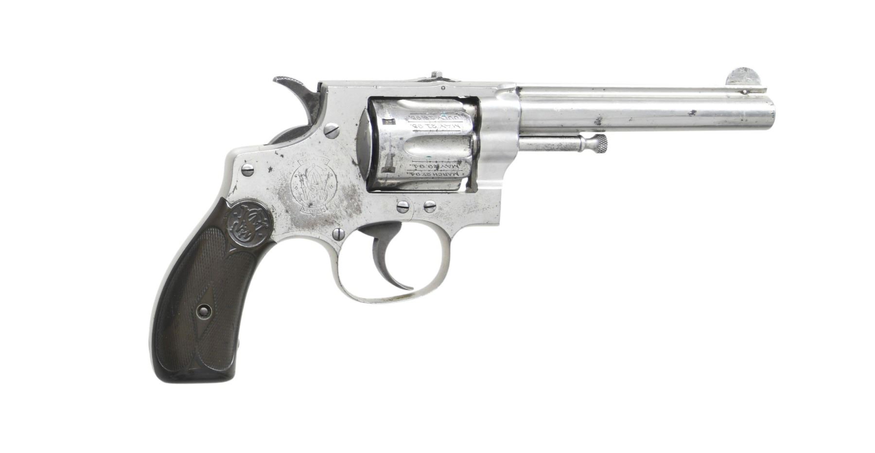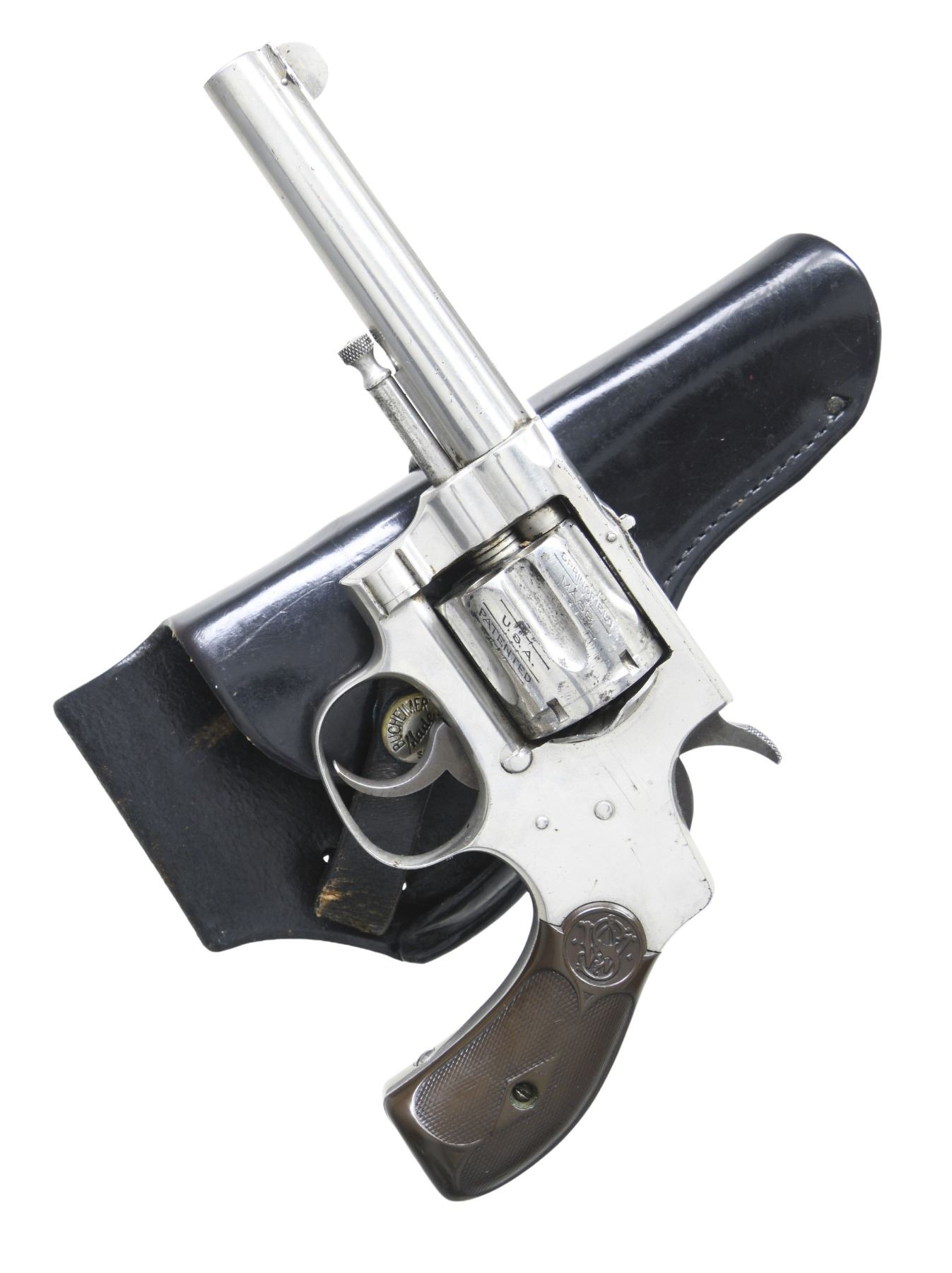 Cal. 32 S&W Long. S# 6634. Bbl. 4 1/2". Round blade front sight. U-notch rear sight. Matching numbers on frame, bbl., cyl. & extractor. First model 32 Hand Ejector. Cyl. has several patent markings present. Nickel finish with case colored hammer & trigger. Checkered brown rubber grips with mismatch number right panel & S&W monograms. UNATTACHED ACCESSORIES: right handed Bucheimer leather holster. CONDITION: grips show worn checkering & some handling marks. Hammer & trigger retain strong traces of their case colors with overall fading to gray & some oxidation Balance of metal retains 80% nickel with scattered flaking, oxidation & a few small spots of light pitting. Action functions properly when hand cycled. Bore shows some light pitting & frosting but strong rifling. (1-27597/MJC). ANTIQUE. $700-1000.