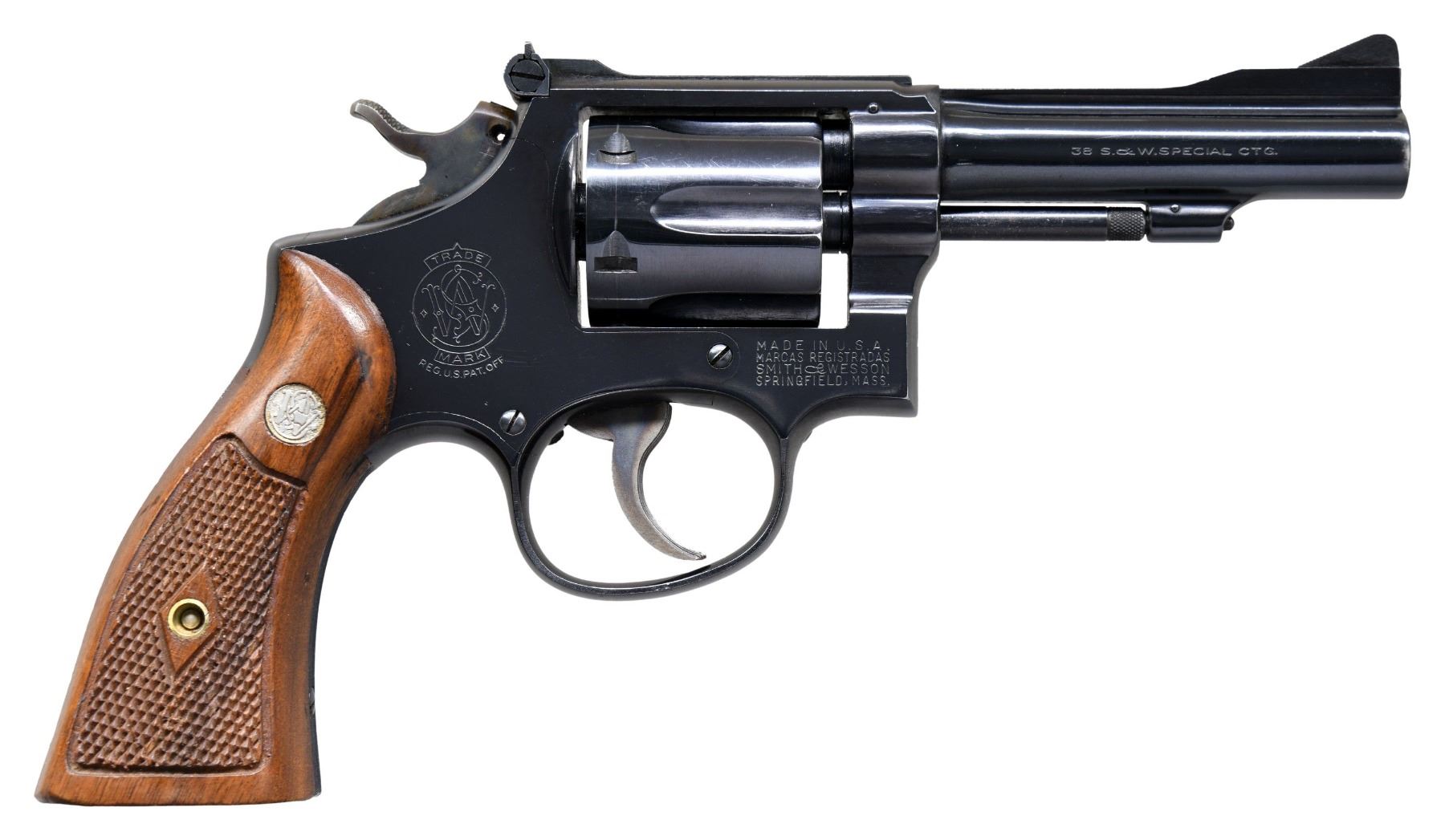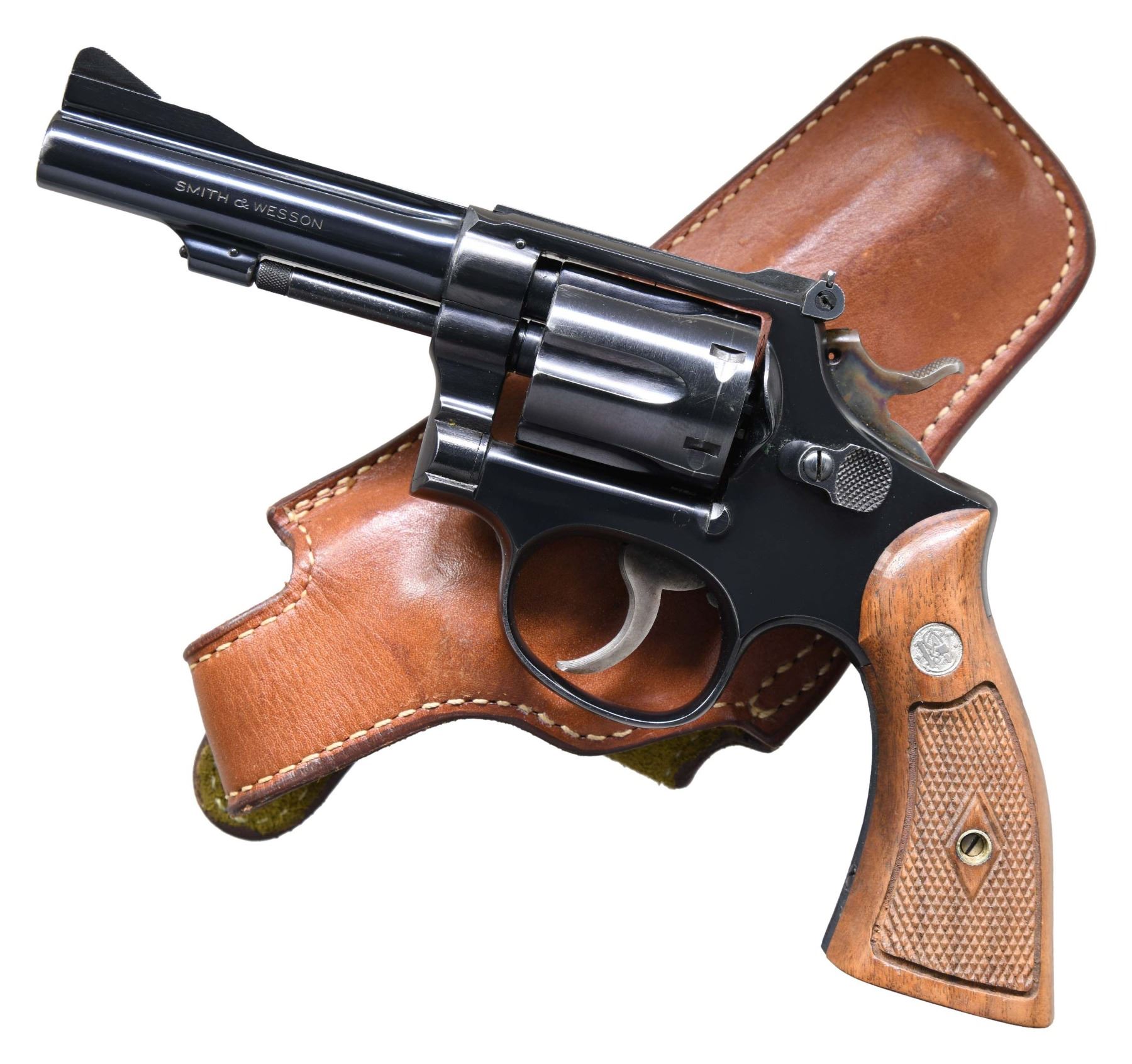 Cal. 38 Spl. S# K267859. Bbl. 4" pinned. Ramped serrated blade front sight. Adjustable square notch rear sight. Matching numbers on grip frame, bbl., cyl. & extractor. Four-screw K38 Masterpiece revolver made Right side of grip frame has scratch writing that reads "R.G. JOHNSTON-DALLAS TEXAS" & "DESOTO TX". Blued finish with case coloreds hammer & trigger. Checkered diamond center walnut grips with mismatched right panel. UNATTACHED ACCESSORIES: right handed Safariland leather holster & bone-in grips. CONDITION: grips show some light dings & handling marks. Trigger & hammer retain most of their case colors with some fading to gray & operational wear. Balance of metal retains 95% factory restored blue with scattered light edge wear & a couple small spots of light oxidation. Action functions properly when hand cycled. Bright near excellent bore. PROVENANCE: From the Estate of Jon Thomas, Gunsport, LTD. (25-1092/MJC). CURIO. $500-800.