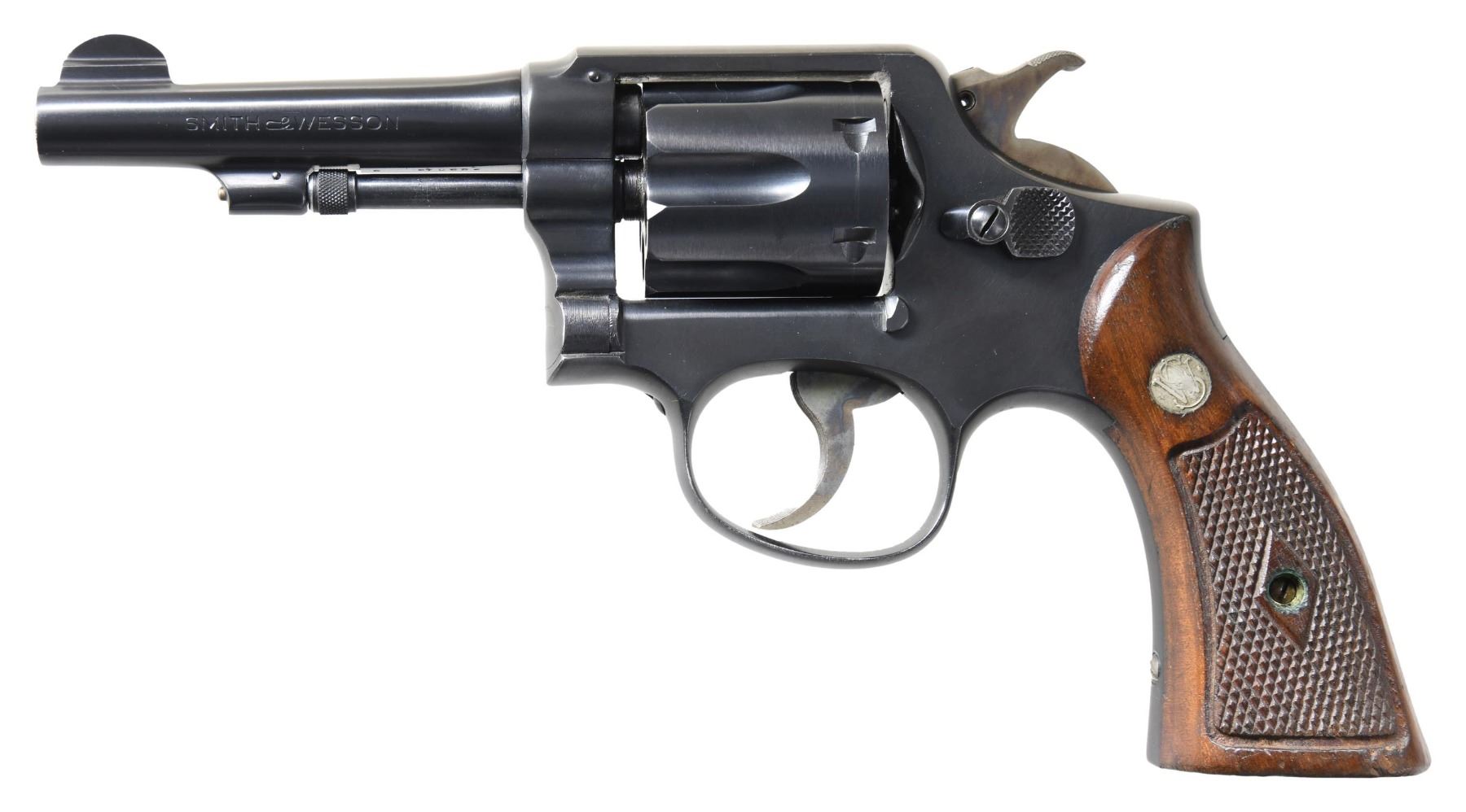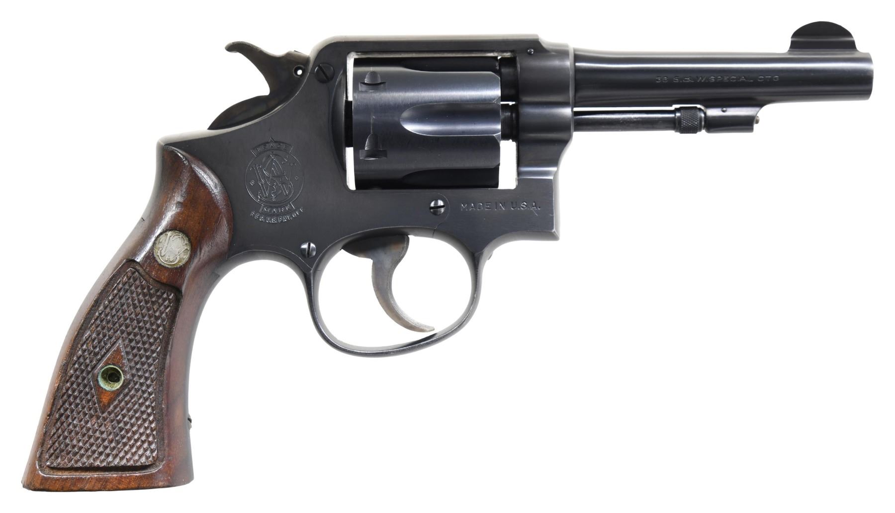 Cal. 38 Spl. S# S870554. Bbl. 4". Round blade front sight. Fixed rear sight. Matching numbers on frame, bbl., cyl., extractor & right grip panel. Five-screw M&P Hand Ejector revolver made in 1940's post WW2. Blued finish with case colored hammer & trigger. Checkered walnut diamond center grips with silver S&W medallions. CONDITION: grips show some checkering wear, handling marks & dings. Trigger & hammer retain most of their case colors with some operational wear & light oxidation. Balance of metal retains 93% factory quality reblue with some light oxidation on grip straps, light edge wear & handling marks. Action functions properly when hand cycled. Bright near excellent bore. (25-2534/MJC). CURIO. $500-750.