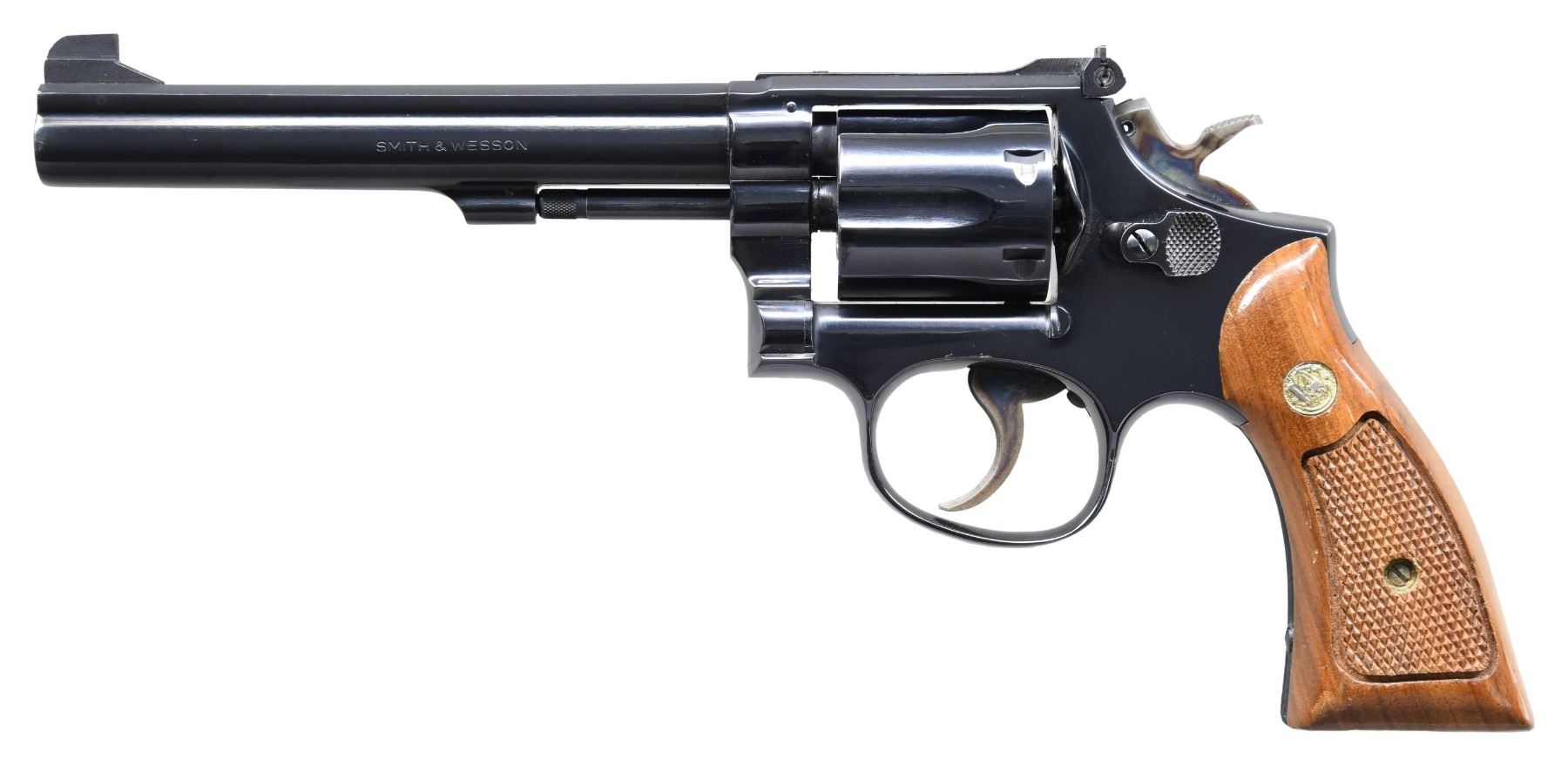 Cal. 38 Spl. S# 4K38970 (mfg. 1973). Pinned 6" barrel. Patridge front sight & adj. micrometer rear sight. 6 Shot fluted cyl. Blue finish. Case hardened semi target hammer & serrated trigger. Two piece checkered walnut Magna grips. CONDITION: very good factory quality refinish retaining over 95% blue finish showing areas of scratches on left side of frame, cyl. turn line & scattered handling marks. Grips have good finish with areas of wear, & marks. Bright bore shows strong rifling. (25-2002/MD). CURIO. $400-600.