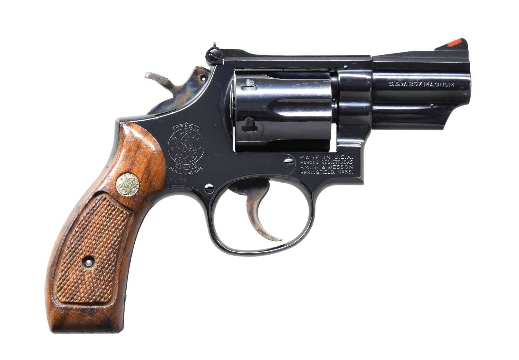 Cal. 357 Mag. S# 75K3272. Bbl. 2 1/2" pinned. Ramped serrated blade front sight with orange insert. Adjustable square notch rear sight with white outline. 1980 made 19-4 revolver. Blued finish with case colored hammer & trigger. Checkered walnut grips with matching numbered right panel & silver S&W medallions. CONDITION: grips show a small ding on right panel behind checkering & some handling marks. Hammer & trigger retain most of their case colors with some light fading & operational wear. Balance of metal retains 90% factory quality reblue with a few handling marks, scattered fading, some light oxidation & edge wear. Action functions properly when hand cycled. Bright near excellent bore. (25-3247/MJC). MODERN. $450-650.